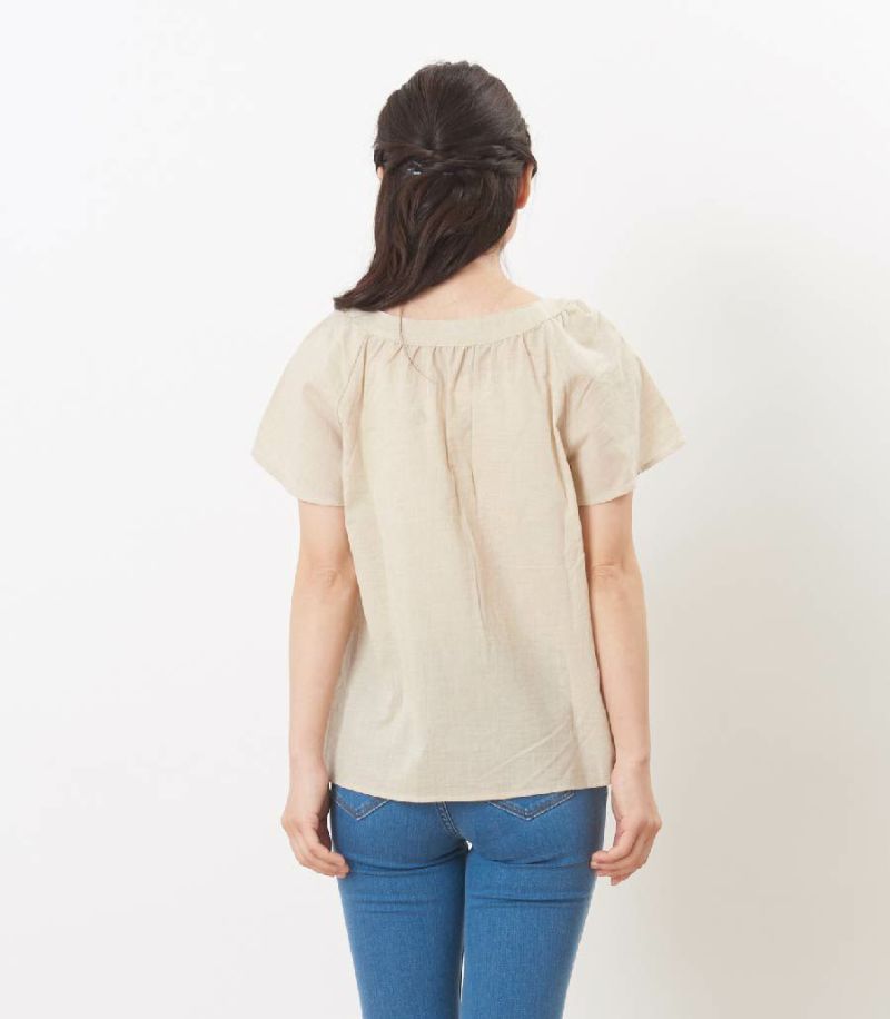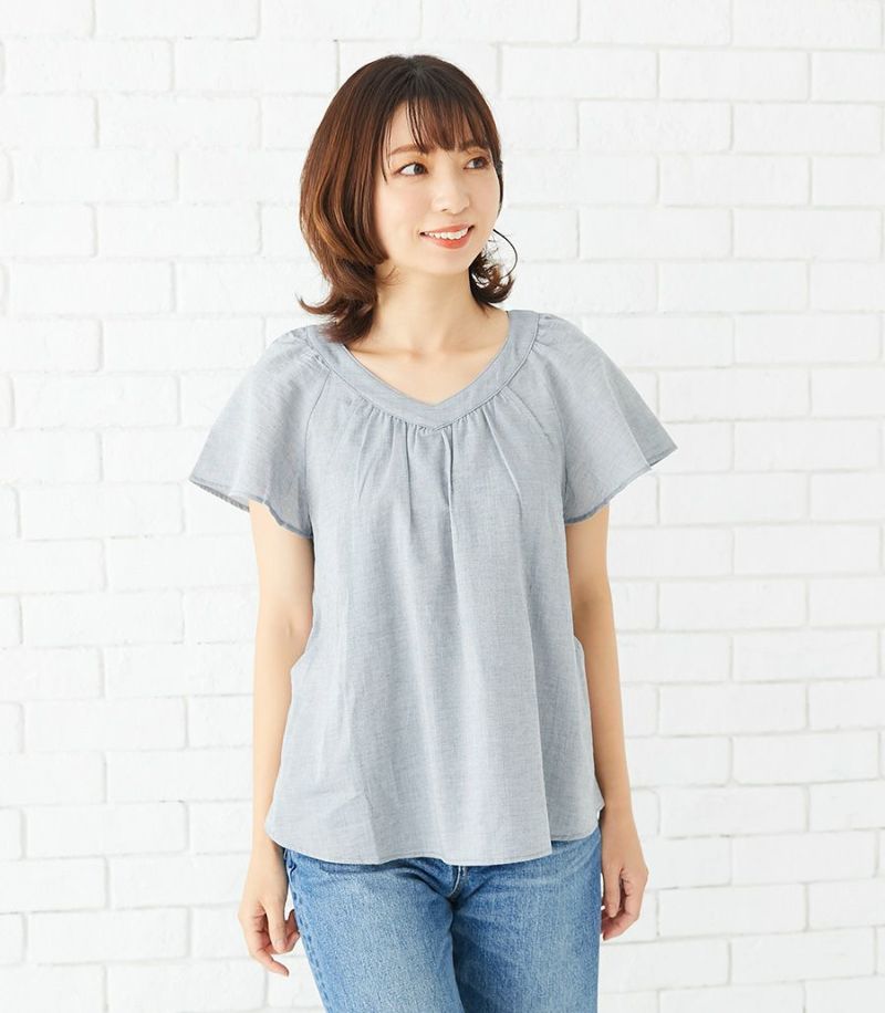 オーガニックコットン100%の薄手のガーゼ素材が涼しく、素肌にやさしいブラウス仕立てのトップス。 ネックラインは女性らしさを演出するVラインのヨーク仕立て。 袖と裾はふんわりと風が通り抜け、見た目にも着心地もとても涼しく、夏のおでかけにぴったりの1枚です。