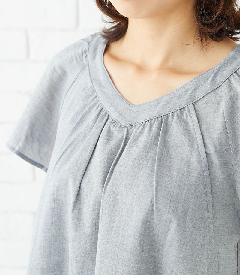 オーガニックコットン100%の薄手のガーゼ素材が涼しく、 素肌にやさしいブラウス仕立てのトップス。 ネックラインは女性らしさを演出するVラインのヨーク仕立て。 袖と裾はふんわりと風が通り抜け、見た目にも着心地もとても涼しく、 夏のおでかけにぴったりの1枚です。