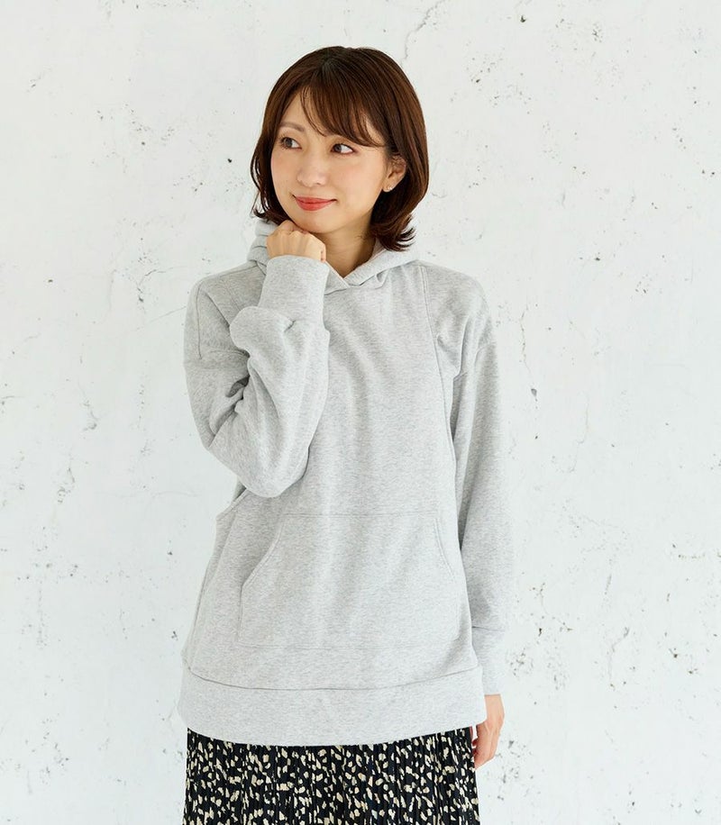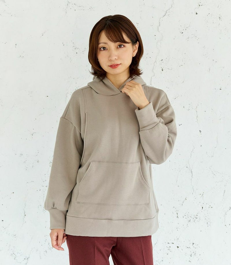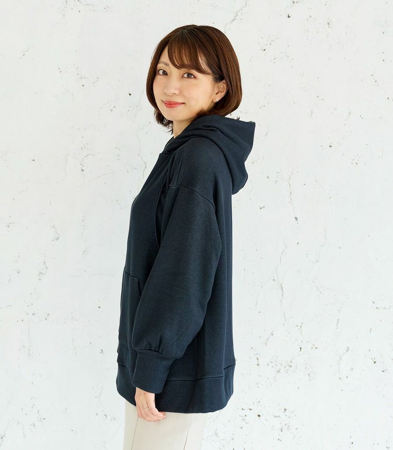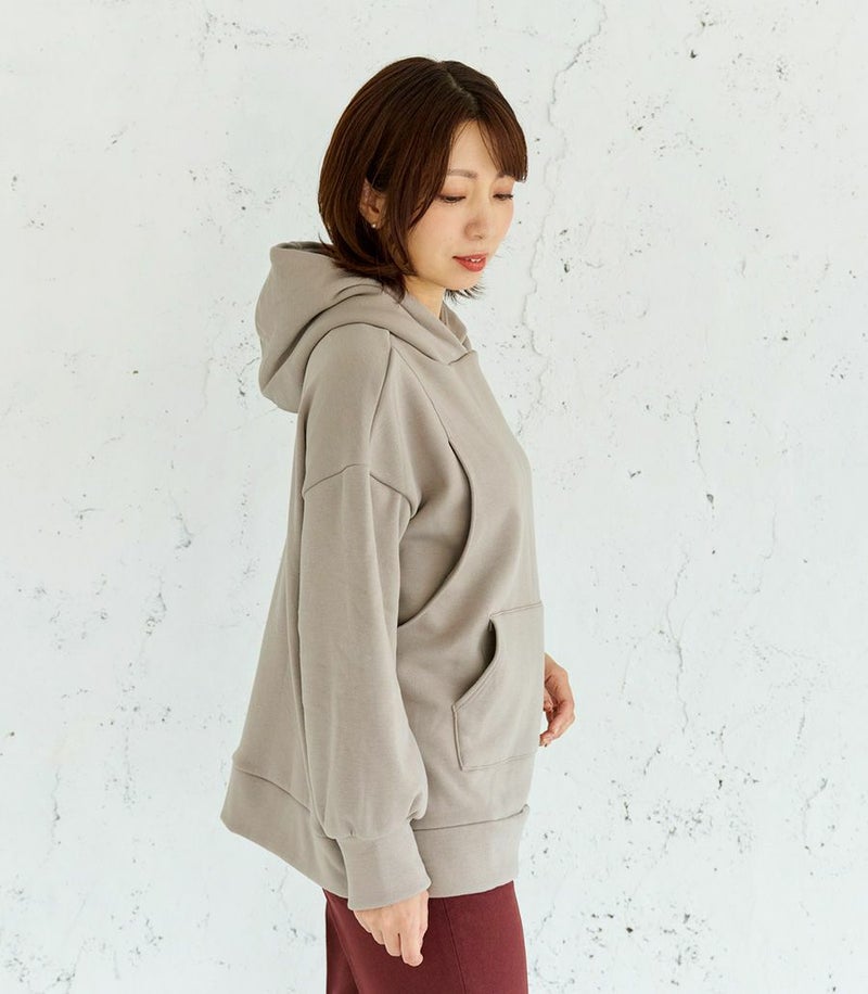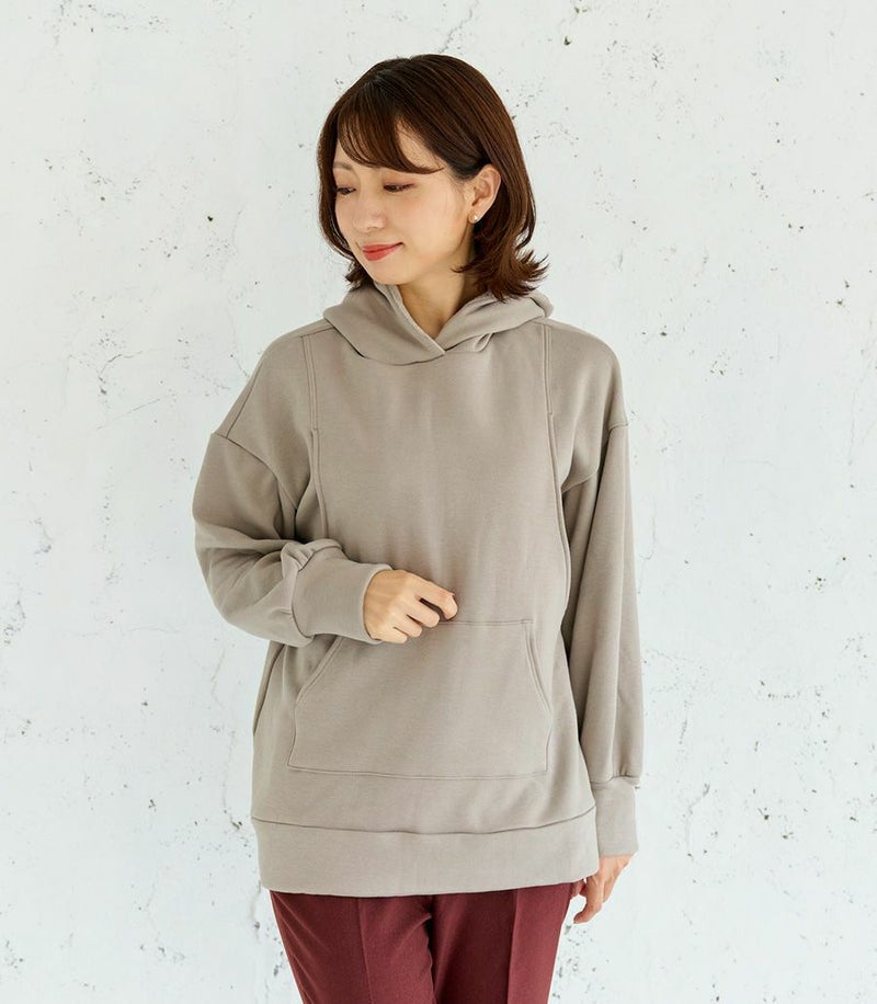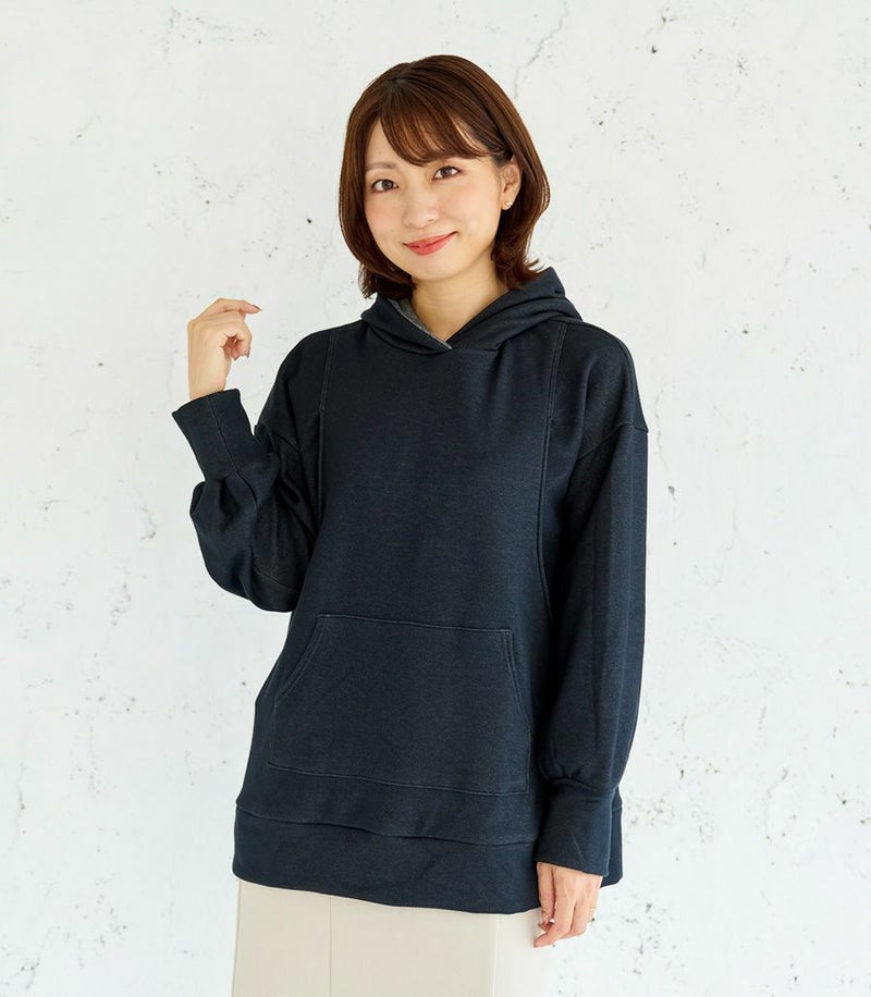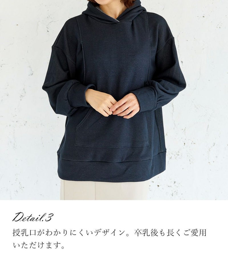 ふんわりと柔らかい裏起毛のあたたかな着心地のフーディー。ゆったりとしたシルエットにこだわり、女性らしくスッキリときれいに着こなせます。 裏側は総起毛なので毛布のようにあたたかく、寒い季節に1枚あると重宝します。 ●ポケット×1(カンガルーポケット) 〈マタニティ(腹囲100cm)対応授乳服〉 まるいお腹を優しく包み込み、妊婦さんがきれいに見えるシルエットにこだわりました。 大きくなったお腹を締めつけず、ゆったりと楽に着ていただけます。 産後の授乳のしやすさも追求した授乳服なので、1枚で2役の便利な授乳服です。 〈生産国:日本〉 〈素材:ポリエステル65%、綿32%、ポリウレタン3%〉 ポリエステルコットンの裏面を起毛させ、肉厚で保温性に富んだあたたかく快適なムートンジャージ素材です。ストレッチで着やすく、裏起毛部分のカラーがアクセントに。制電糸を使用している素材の為、帯電防止に優れています。 〈洗濯表記:洗濯機OK〉