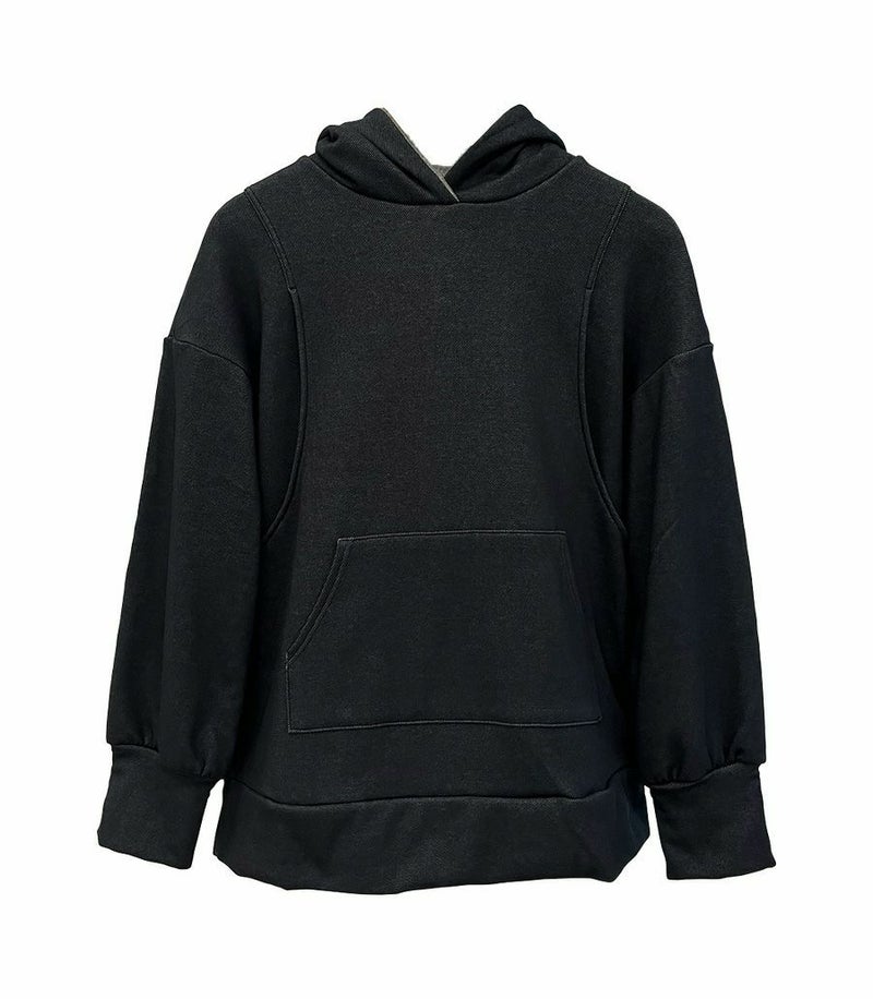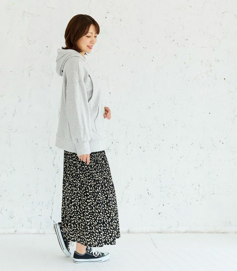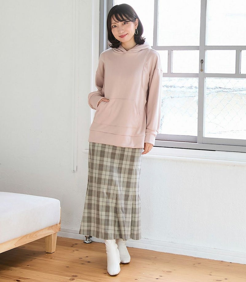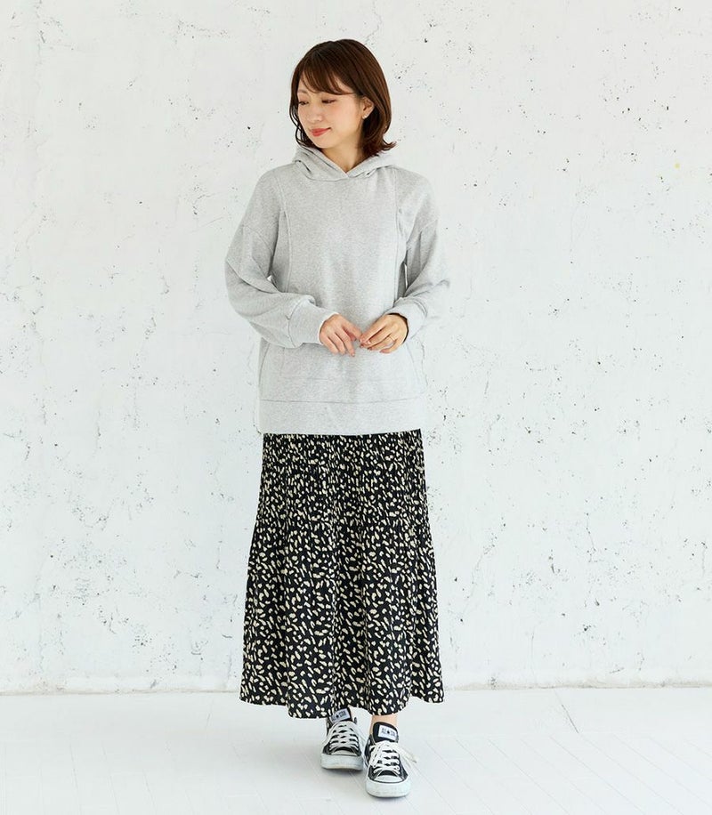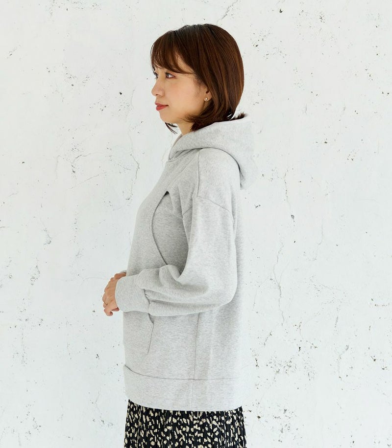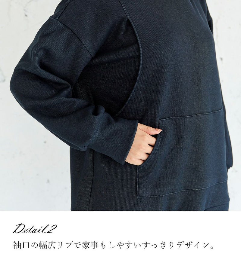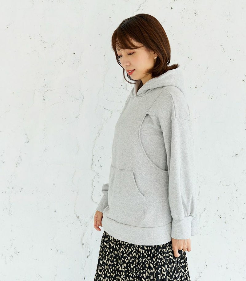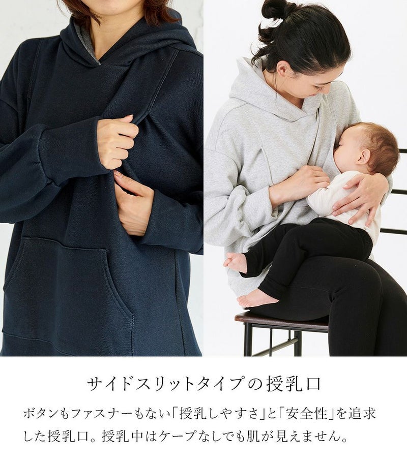 ふんわりと柔らかい裏起毛のあたたかな着心地のフーディー。ゆったりとしたシルエットにこだわり、女性らしくスッキリときれいに着こなせます。 裏側は総起毛なので毛布のようにあたたかく、寒い季節に1枚あると重宝します。 ●ポケット×1(カンガルーポケット) 〈マタニティ(腹囲100cm)対応授乳服〉 まるいお腹を優しく包み込み、妊婦さんがきれいに見えるシルエットにこだわりました。 大きくなったお腹を締めつけず、ゆったりと楽に着ていただけます。 産後の授乳のしやすさも追求した授乳服なので、1枚で2役の便利な授乳服です。 〈生産国:日本〉 〈素材:ポリエステル65%、綿32%、ポリウレタン3%〉 ポリエステルコットンの裏面を起毛させ、肉厚で保温性に富んだあたたかく快適なムートンジャージ素材です。ストレッチで着やすく、裏起毛部分のカラーがアクセントに。制電糸を使用している素材の為、帯電防止に優れています。 〈洗濯表記:洗濯機OK〉
