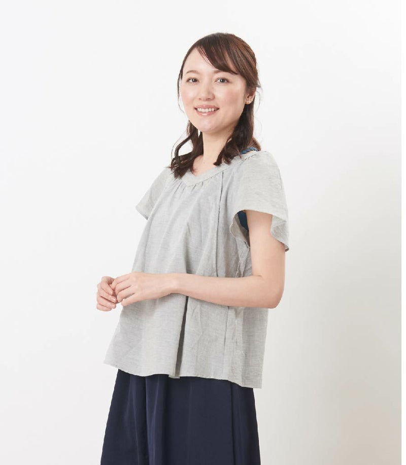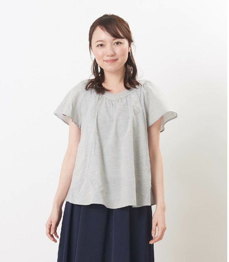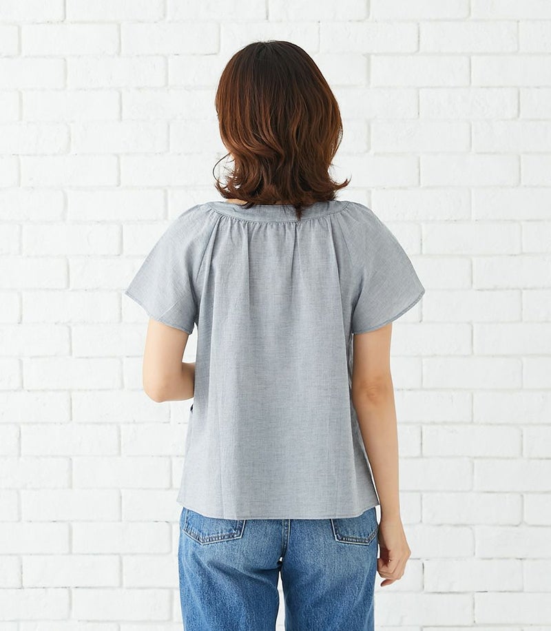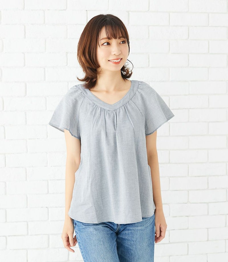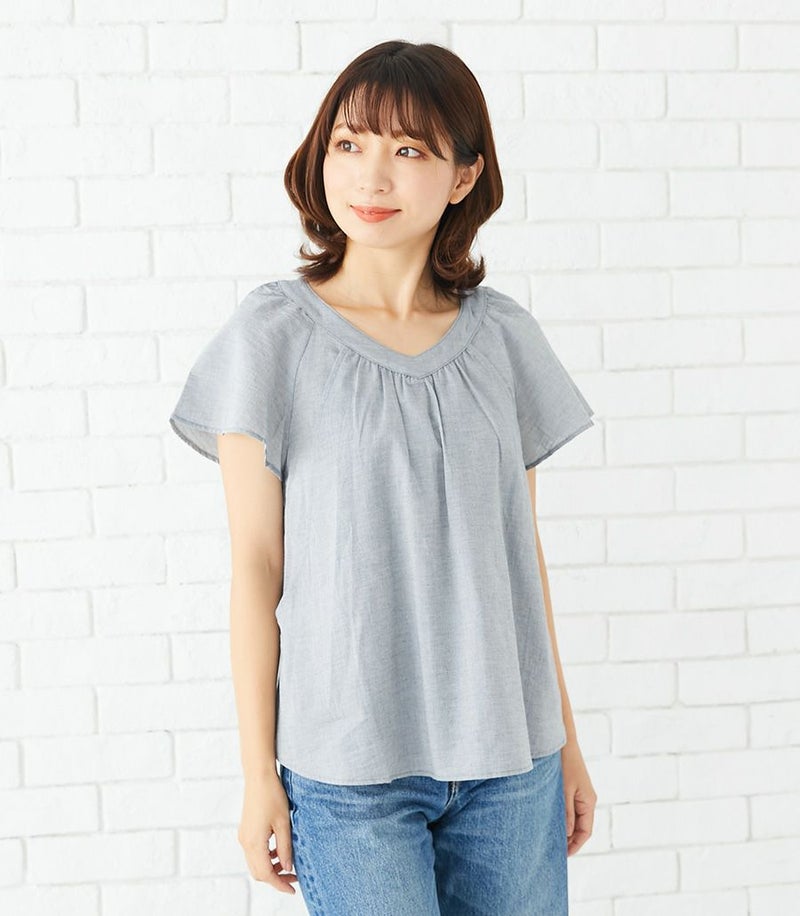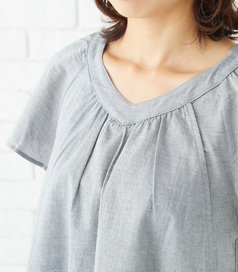 オーガニックコットン100%の薄手のガーゼ素材が涼しく、素肌にやさしいブラウス仕立てのトップス。 ネックラインは女性らしさを演出するVラインのヨーク仕立て。 袖と裾はふんわりと風が通り抜け、見た目にも着心地もとても涼しく、夏のおでかけにぴったりの1枚です。
