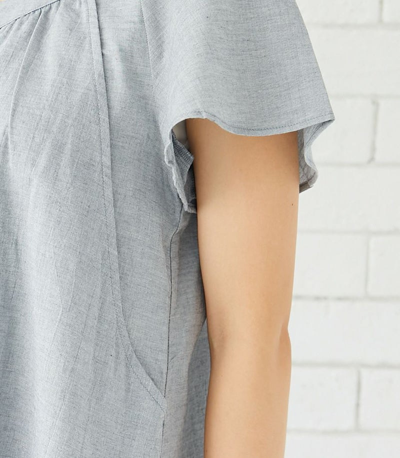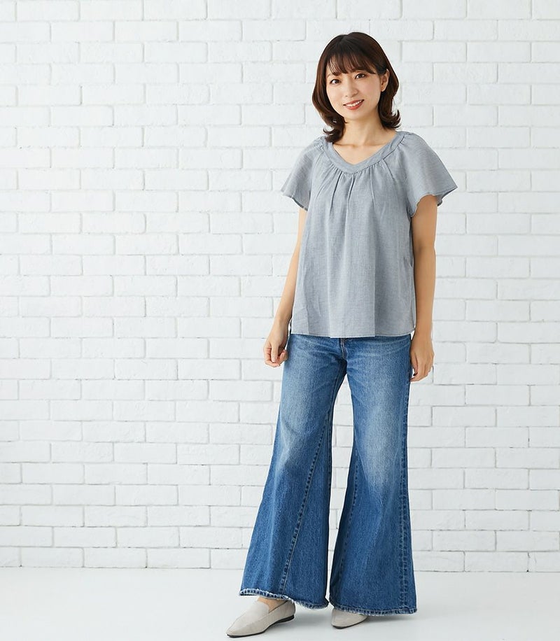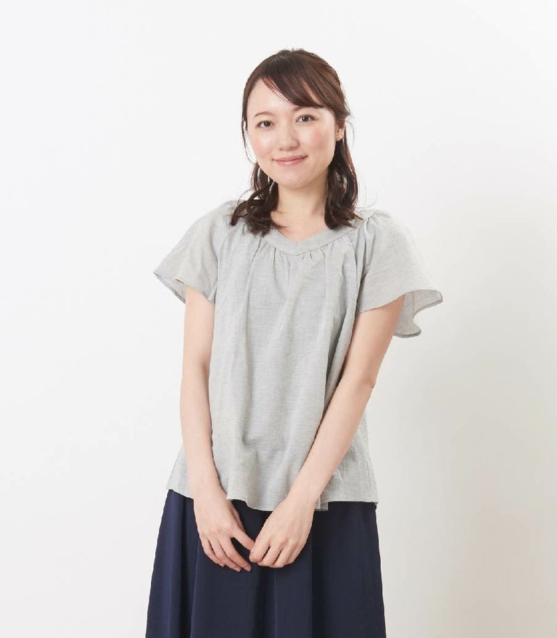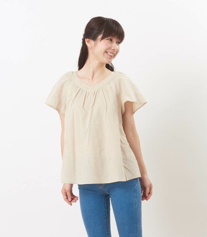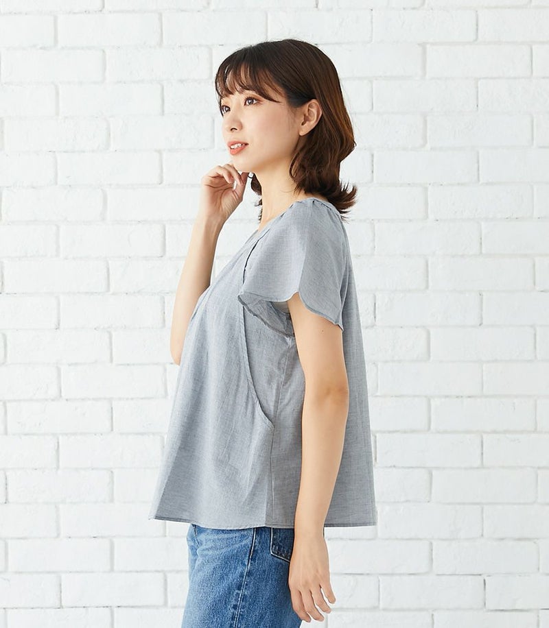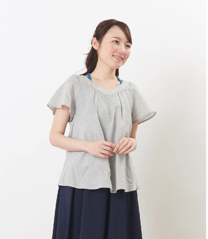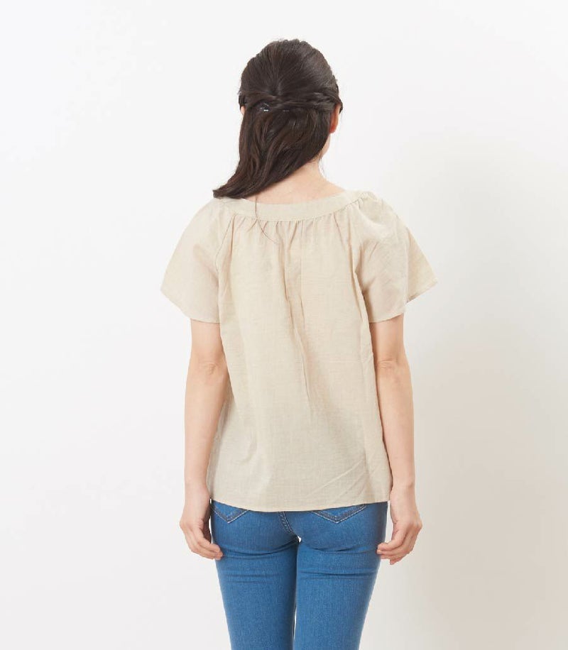 オーガニックコットン100%の薄手のガーゼ素材が涼しく、素肌にやさしいブラウス仕立てのトップス。 ネックラインは女性らしさを演出するVラインのヨーク仕立て。 袖と裾はふんわりと風が通り抜け、見た目にも着心地もとても涼しく、夏のおでかけにぴったりの1枚です。