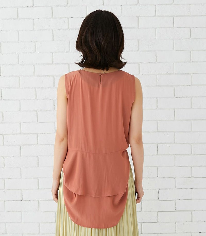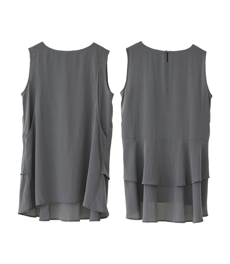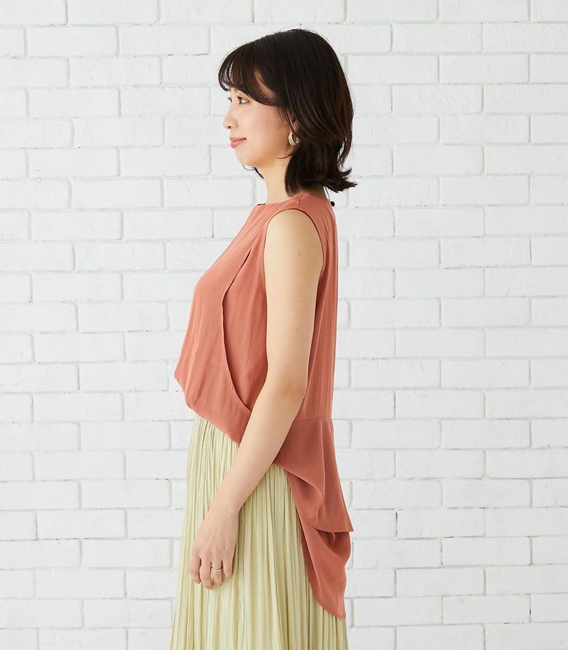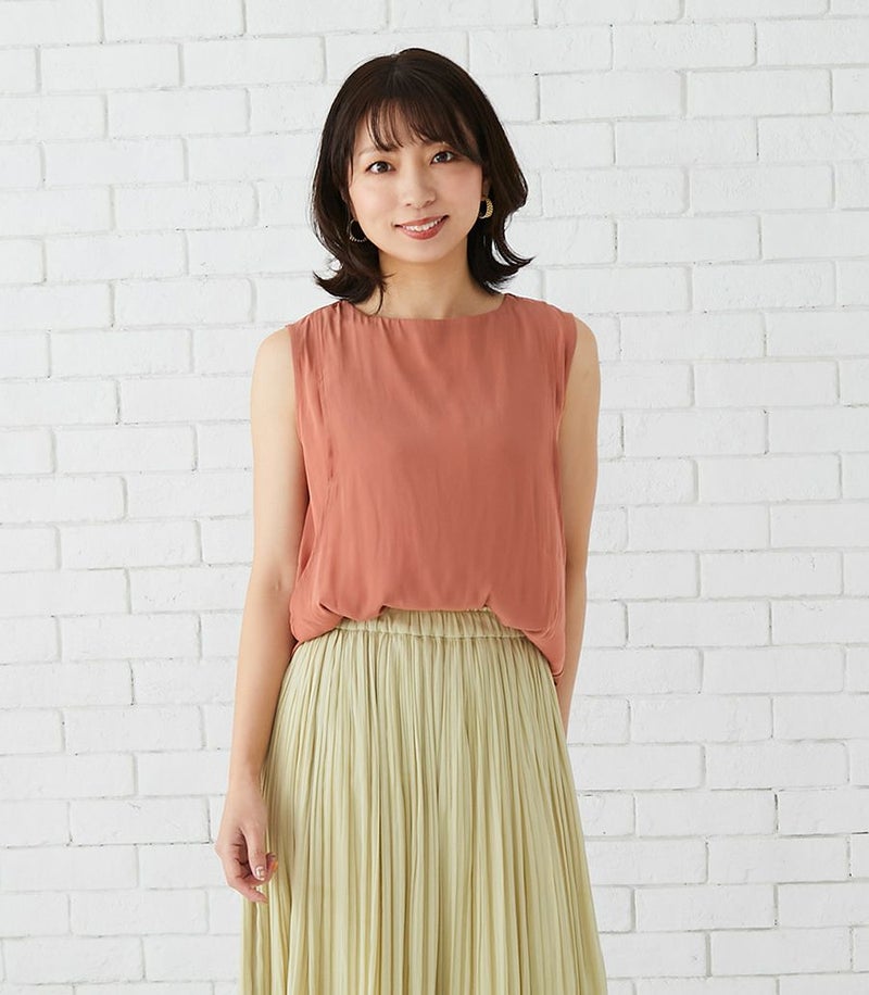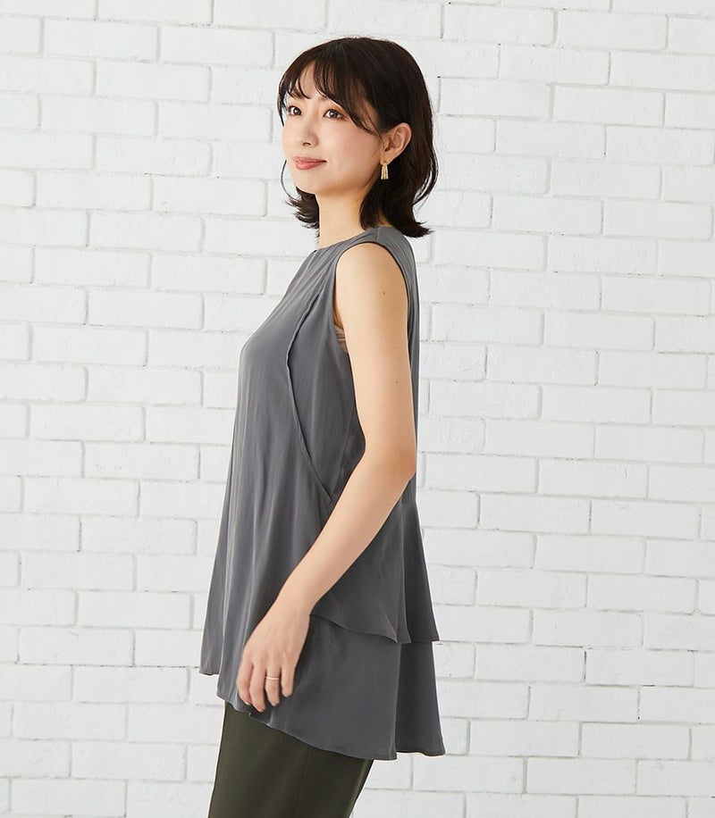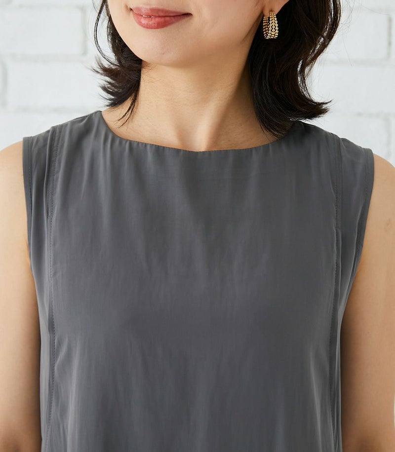 落ち感のあるデシン素材を使用したノースリーブブラウス。バックのフレアーが気になるお尻まわりをさりげなくカバーしてくれます。動くたびに揺れるブラウスで女性らしい印象です。 COLOR:チャコール/MODEL:164cm