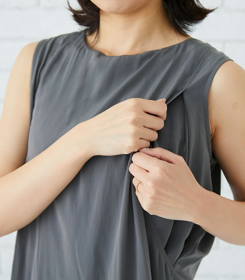 落ち感のあるデシン素材を使用したノースリーブブラウス。バックのフレアーが気になるお尻まわりをさりげなくカバーしてくれます。動くたびに揺れるブラウスで女性らしい印象です。 ●ポケット× 〈マタニティ(腹囲100cm)対応授乳服〉 まるいお腹を優しく包み込み、妊婦さんがきれいに見えるシルエットにこだわりました。 大きくなったお腹を締めつけず、ゆったりと楽に着ていただけます。 産後の授乳のしやすさも追求した授乳服なので、1枚で2役の便利な授乳服です。 〈生産国:日本〉 〈素材:ポリエステル100%〉 落ち感のある柔らかな割織素材。ナチュラルなビンテージ加工で落ち着いた印象に。お洗濯にも強いイージーケア素材です。 〈洗濯表記:洗濯機OK〉