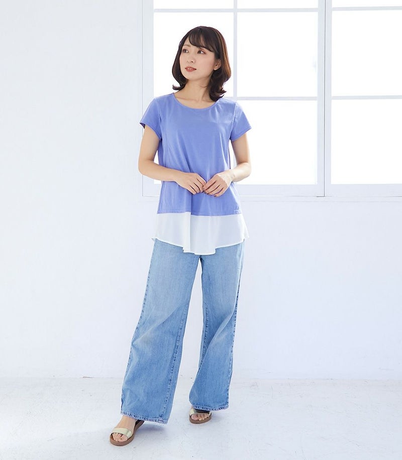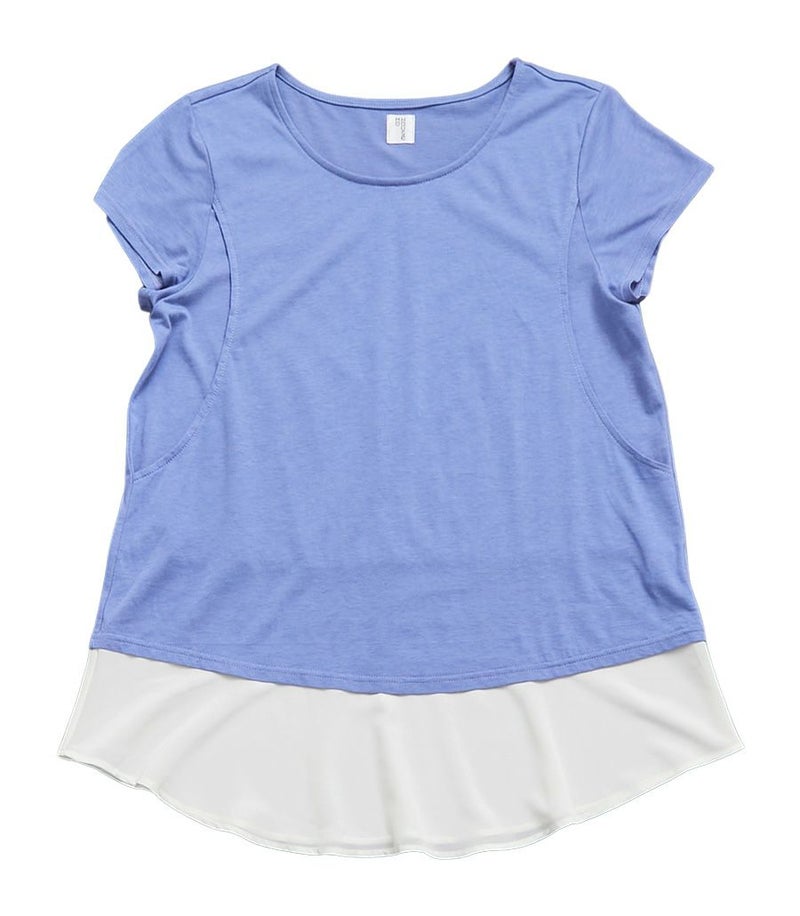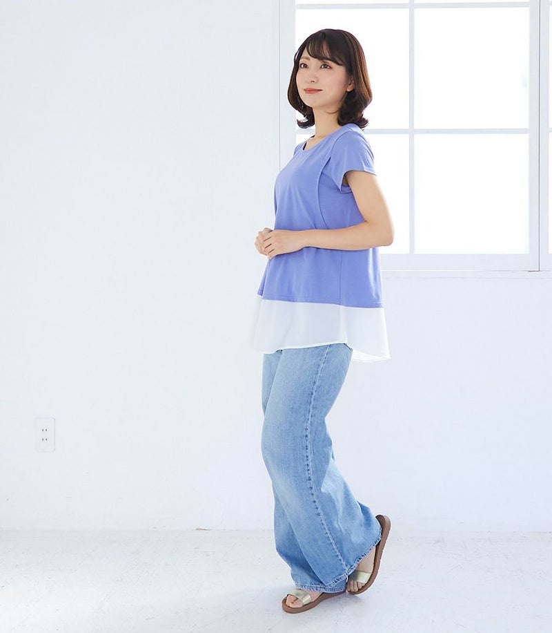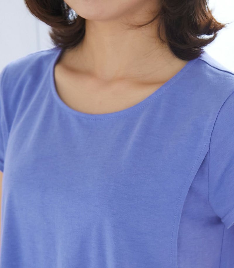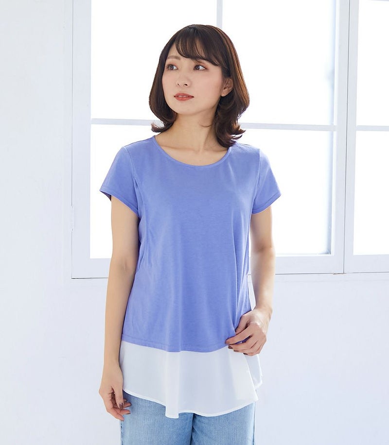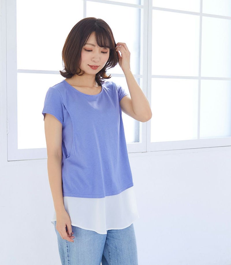 デシン素材で切り替えた裾が、ひらひらと軽やかで、フェミニンなトップス。着丈が長めで、産前産後の気になる腰周りをやさしくカバーします。上身頃は、なめらかで落ち感のあるレーヨン混コットンを使用した肌触りのよい1枚です。