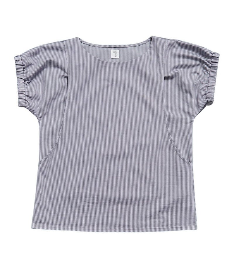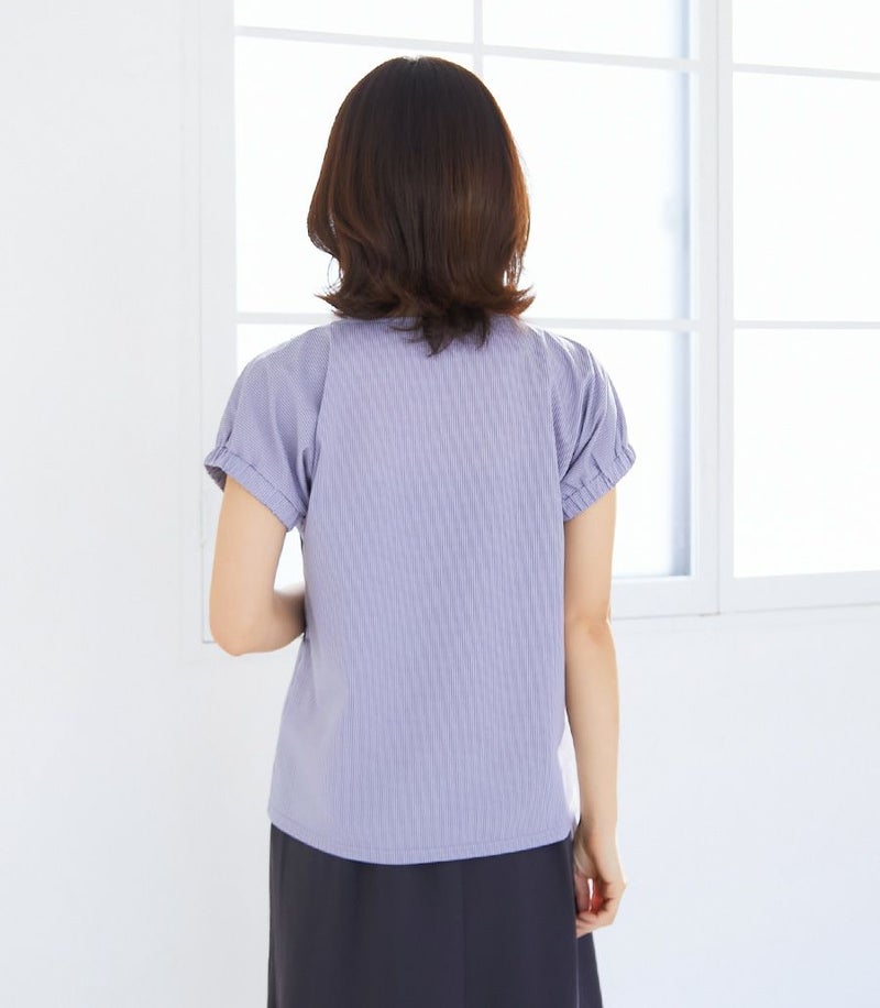 ストライプがコーディネイトのアクセントになり、一枚でスタイリッシュな印象になります。 袖口のゴムがきれいなボリュームをだし、二の腕をすっきりと見せてくれます。着丈もちょうどよく、ボトムを選ばずに幅広く使えるアイテムです。