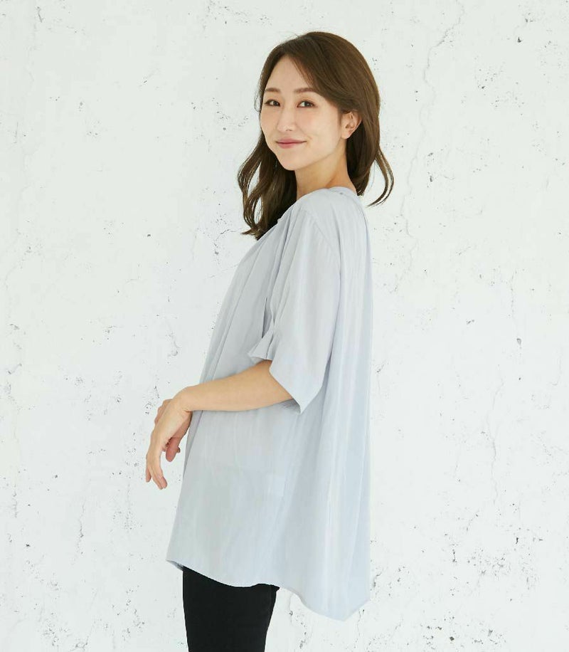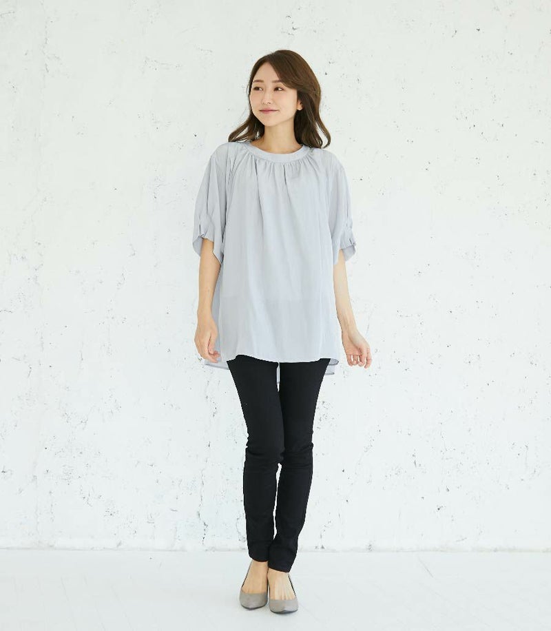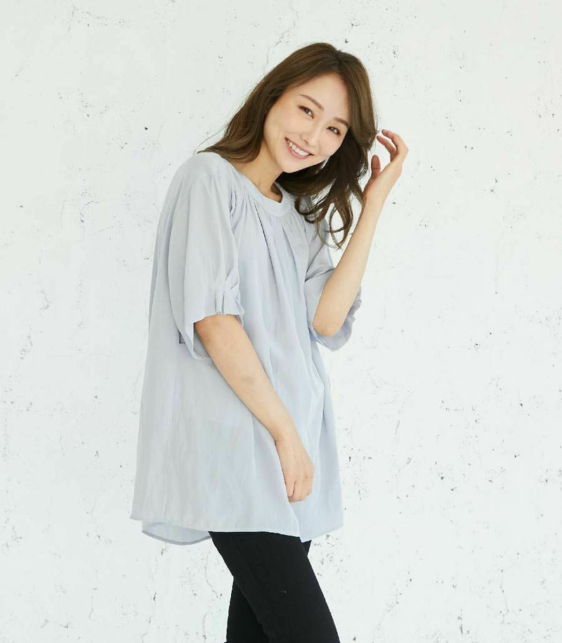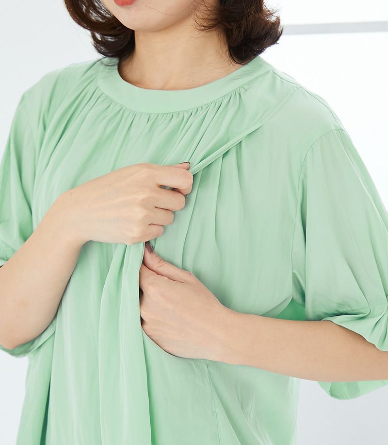 ツヤのある生地と首元からのギャザーで授乳口が目立ちません。ボトムスにインしてももたつかないので、キレイめにも着られて、職場にも着て行きたいです。