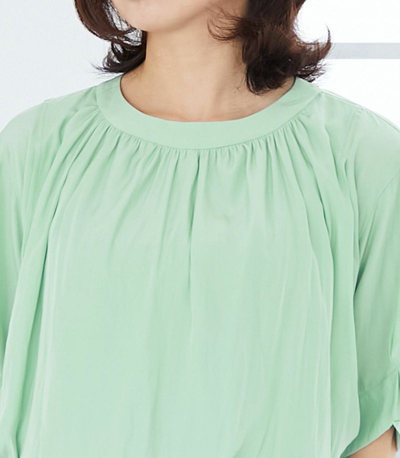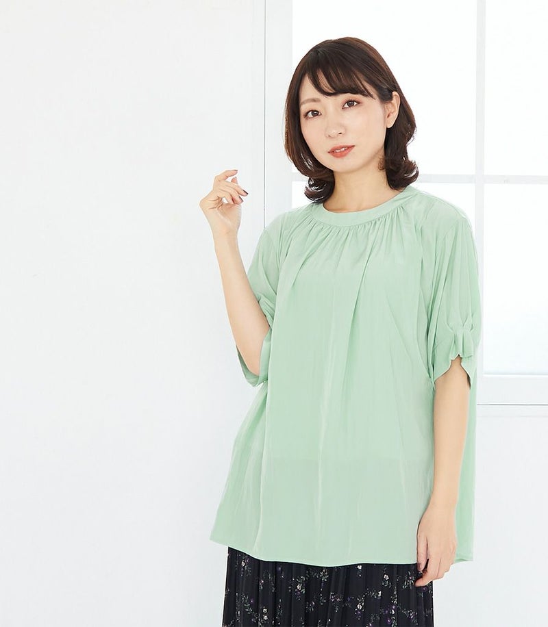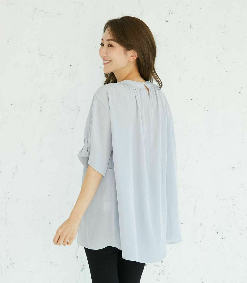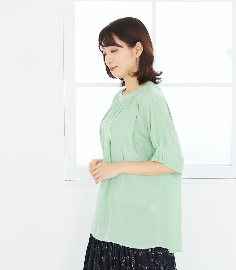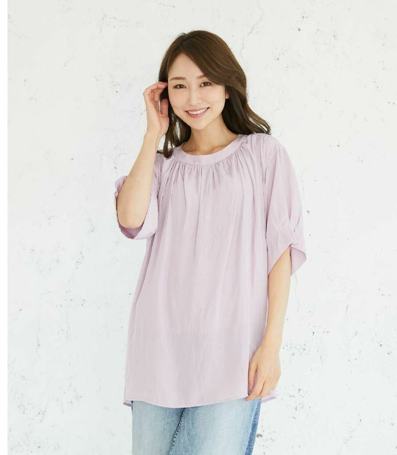 上品な割繊素材を使用したギャザーブラウスは落ち感があるので華奢見え効果も期待できます。表面感のある生地が見た目にも爽やかな1枚です。ふわっと広がるやわらかなフレアーラインが女性らしい着こなしを演出します。長めの着丈で気になるおなか回りもすっきりと。