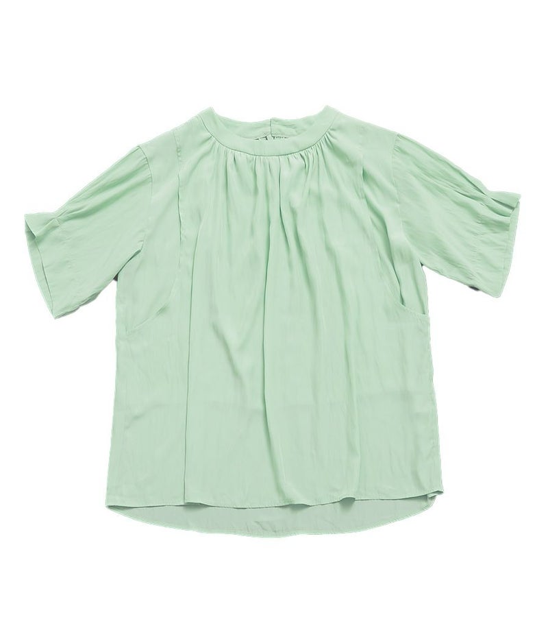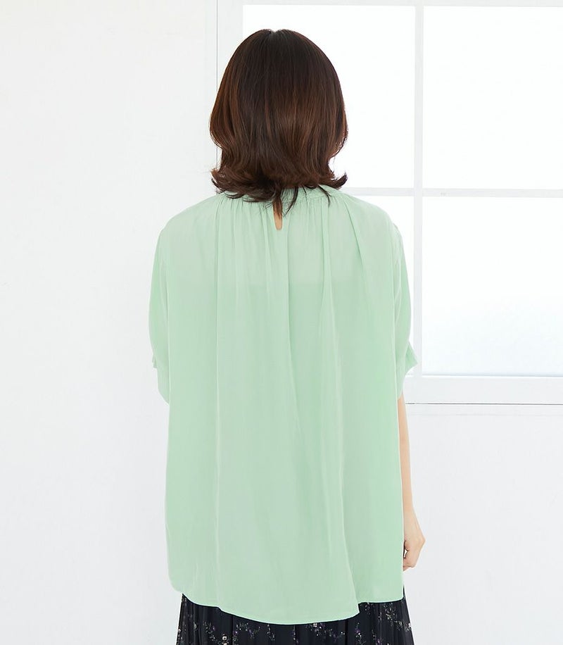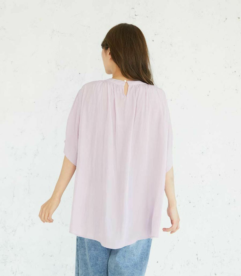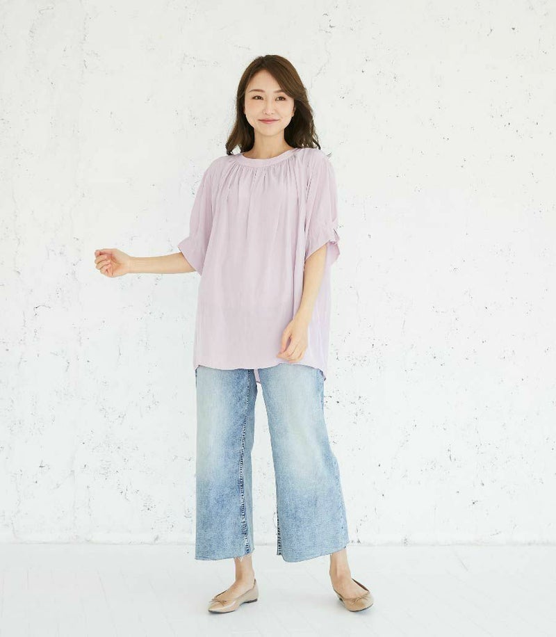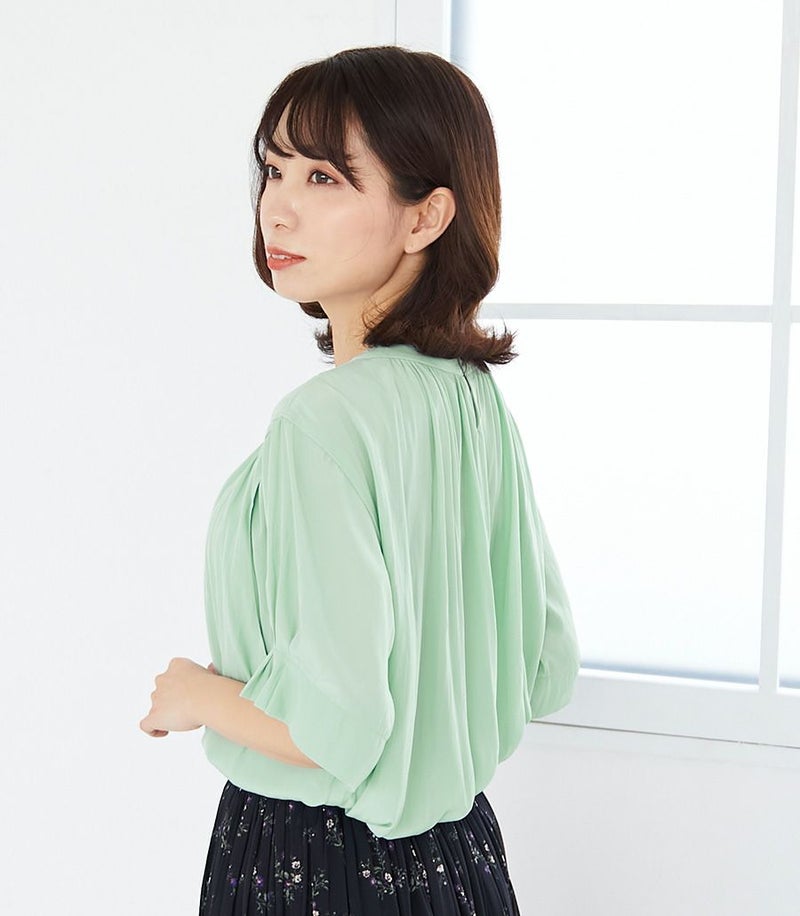 上品な割繊素材を使用したギャザーブラウスは落ち感があるので華奢見え効果も期待できます。表面感のある生地が見た目にも爽やかな1枚です。ふわっと広がるやわらかなフレアーラインが女性らしい着こなしを演出します。長めの着丈で気になるおなか回りもすっきりと。