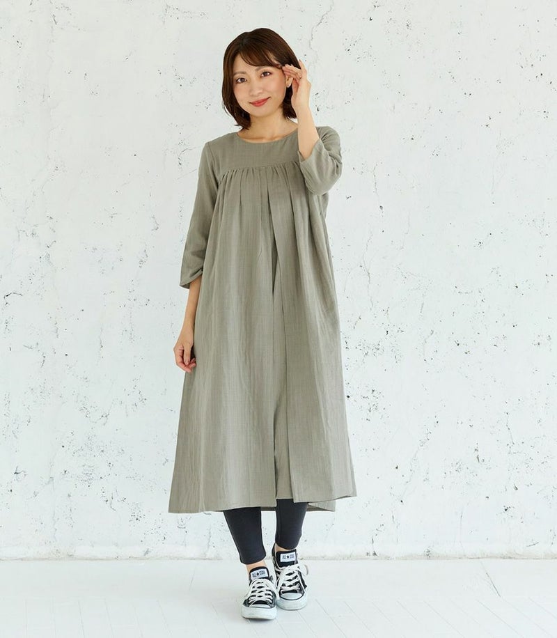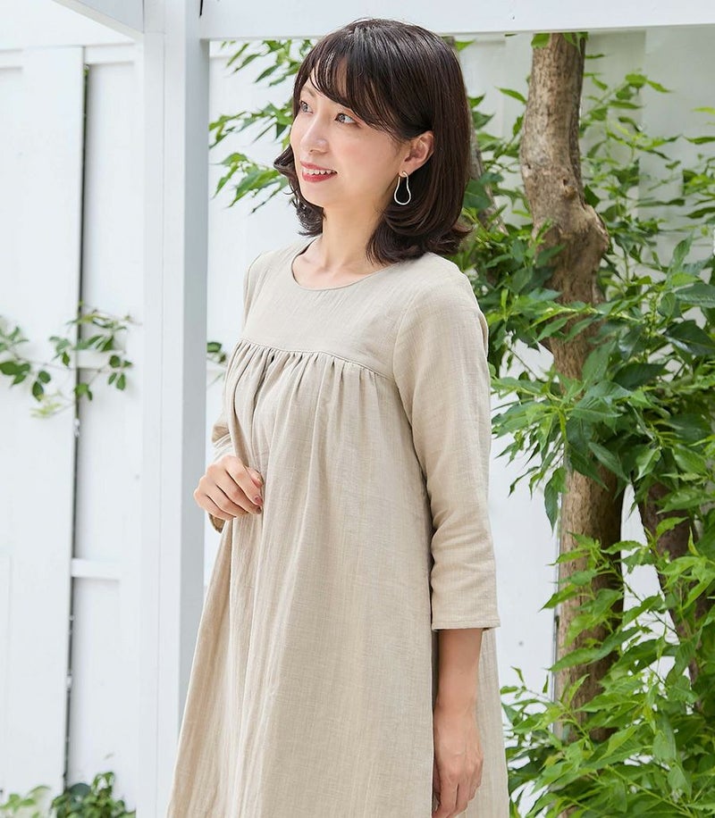 やわらかい素材とナチュラルな雰囲気が人気のWガーゼをふんだんに使ったワンピースです。膝がしっかりと隠れる丈が安心です。授乳口がわからないデザインなので、マタニティ期から卒乳後まで長くご愛用いただけます。 COLOR:ベージュ/MODEL:164cm