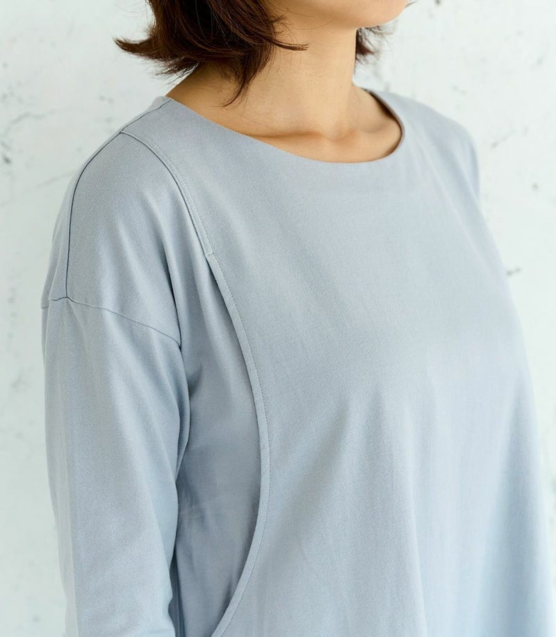モーハウスの授乳服ならではの、ボタンもファスナーもない授乳口。だからこその「授乳しやすさ」と「安全性」には自信があります。 前身頃が二重構造になっていて、上側の身頃にはサイドのスリット、内側の身頃にはセンターにスリットがあり、授乳中は肌が露出してしまう心配はありませんので安心です。授乳後は布を元に戻すだけで、授乳口が隠れます。