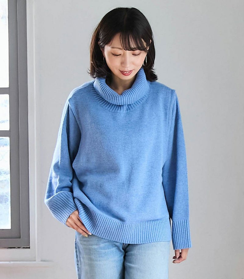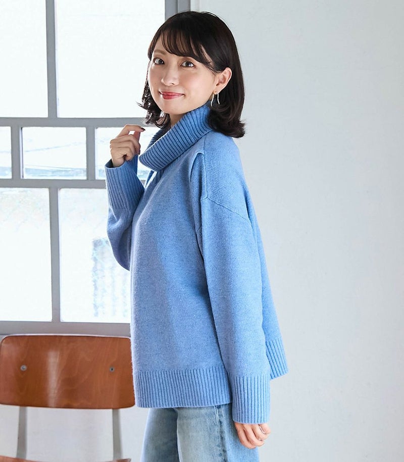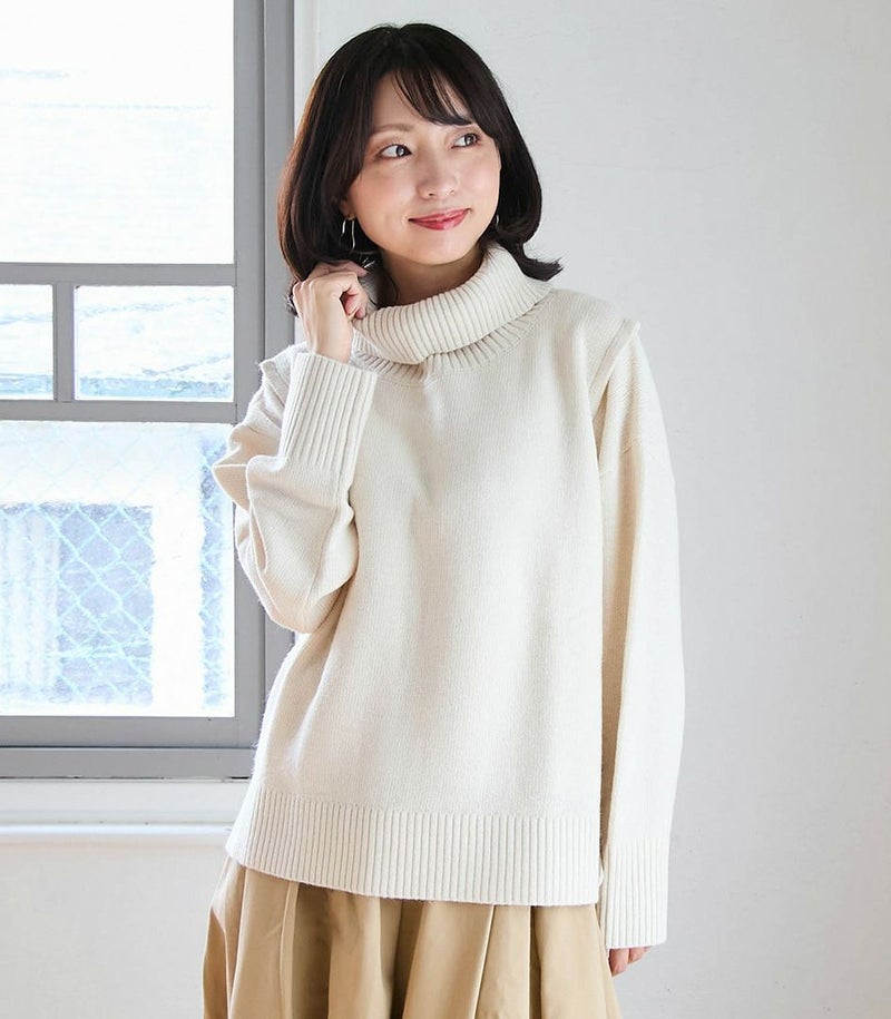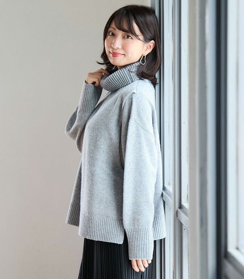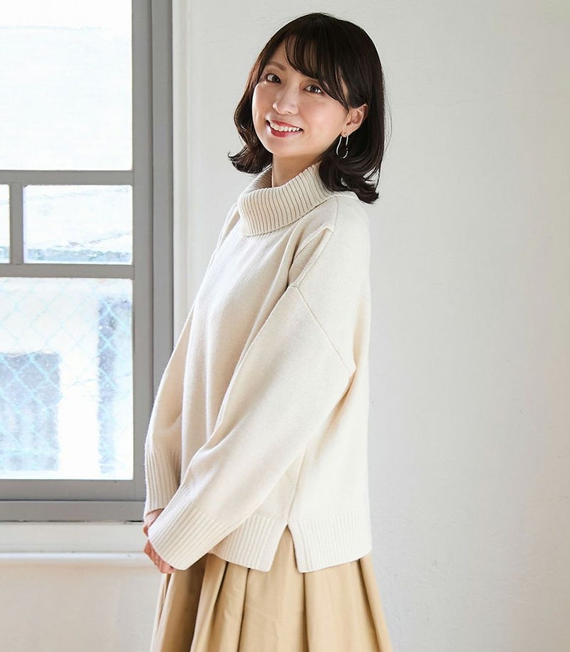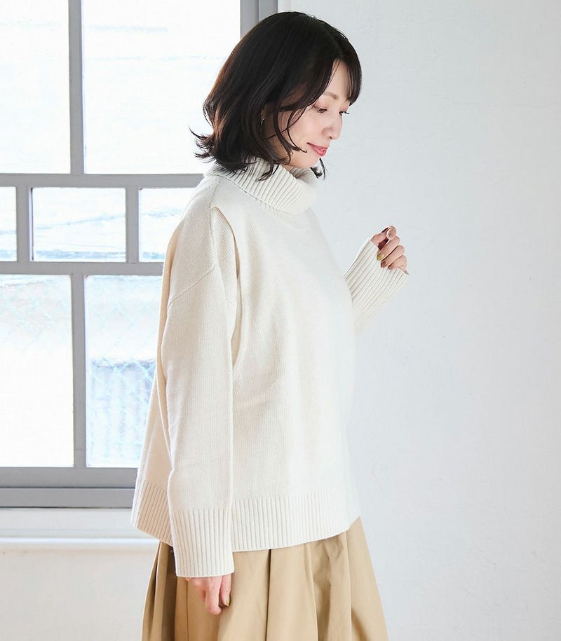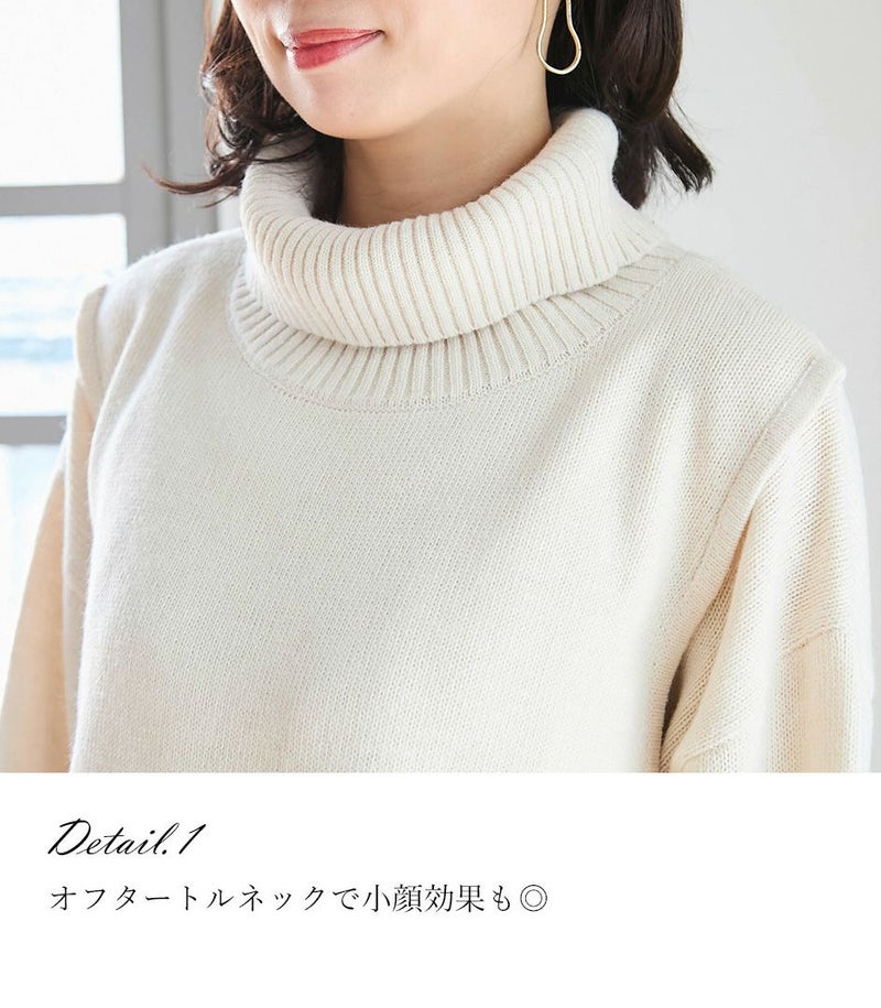 ゆるっとしたオフタートルがポイントのニットトップス。オフタートルネックは、顔まわりや首元がすっきりと見え、小顔効果もあります。ゆったりとしたワイドシルエットで体型カバーも◎