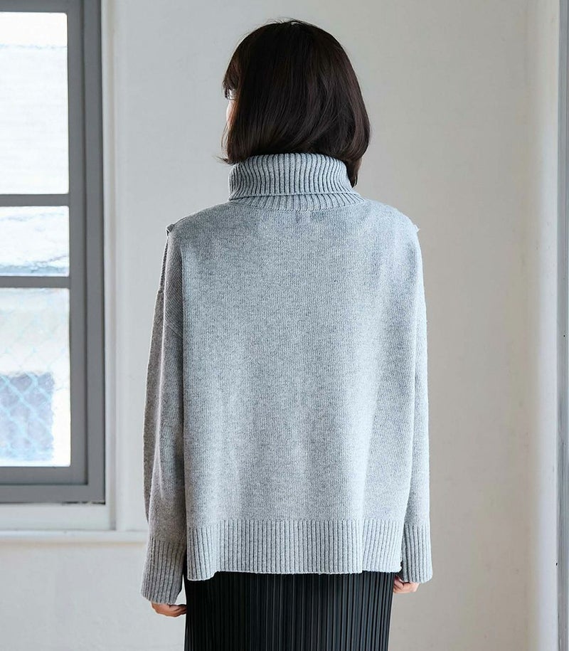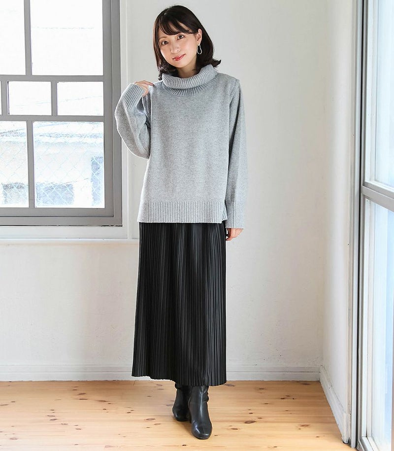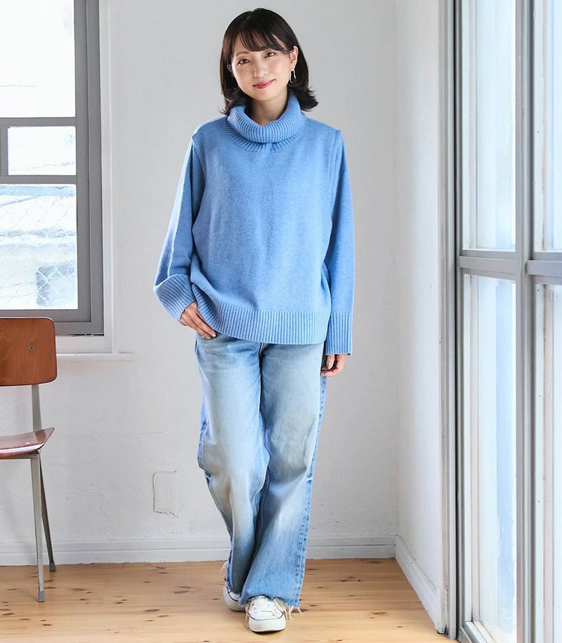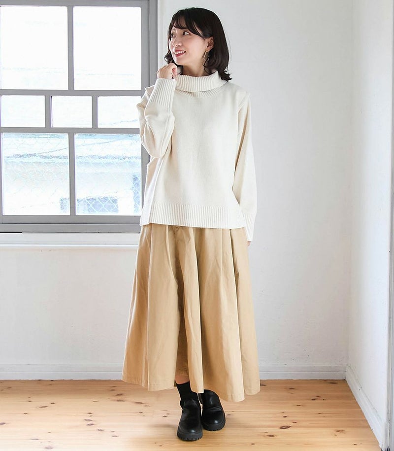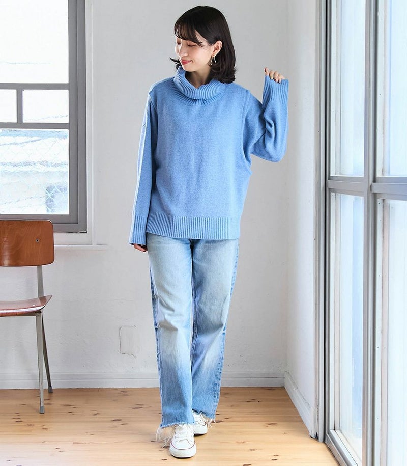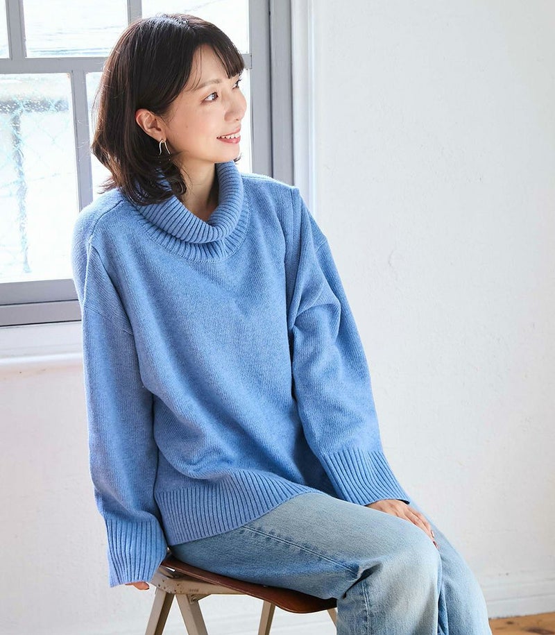 ゆるっとしたオフタートルがポイントのニットトップス。オフタートルネックは、顔まわりや首元がすっきりと見え、小顔効果もあります。ゆったりとしたワイドシルエットで体型カバーも◎