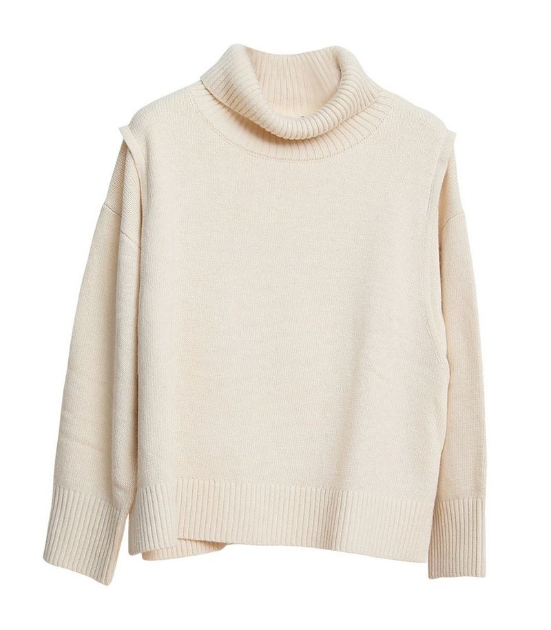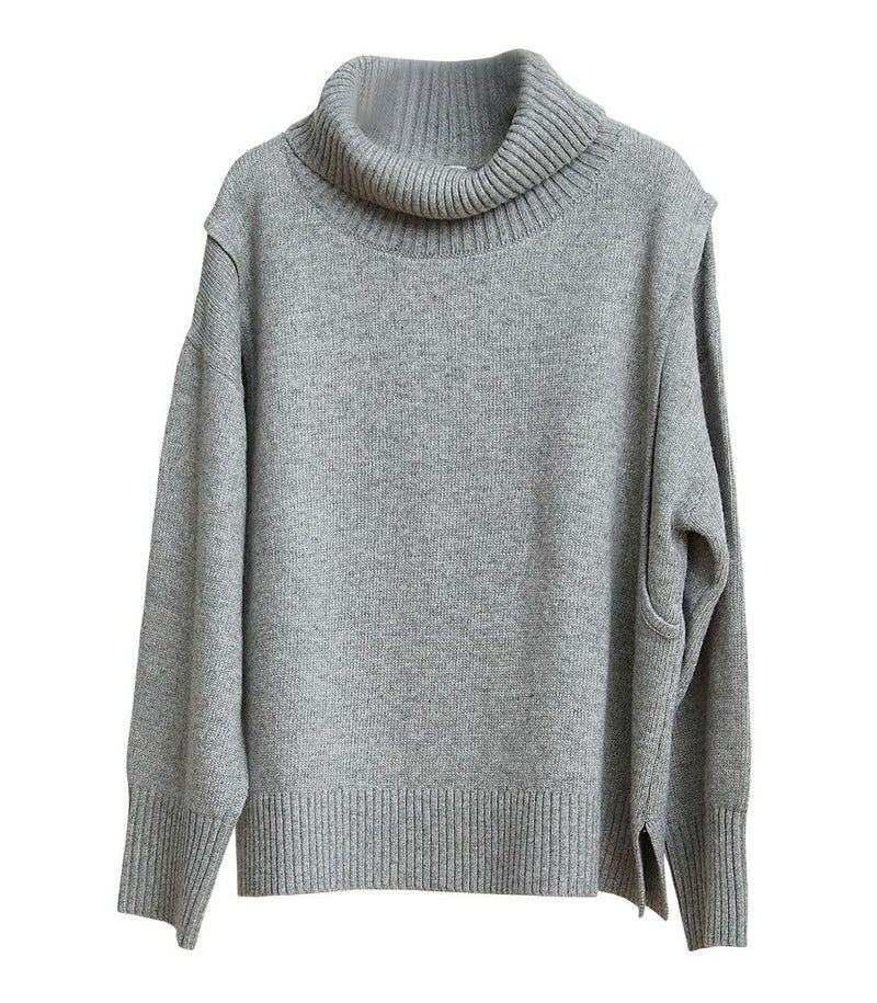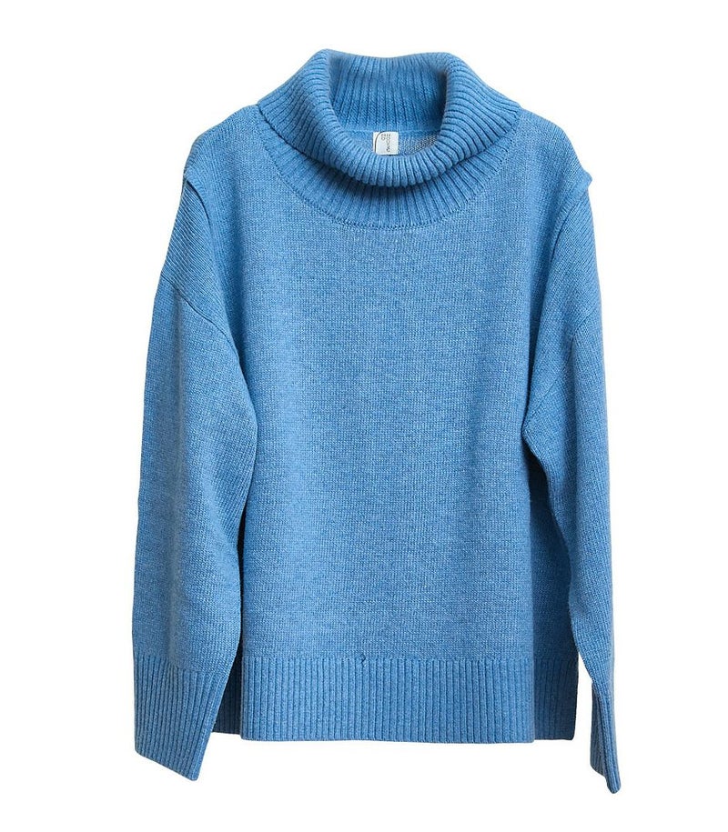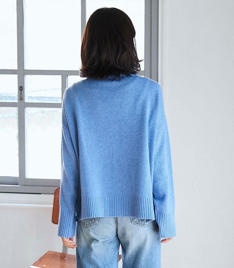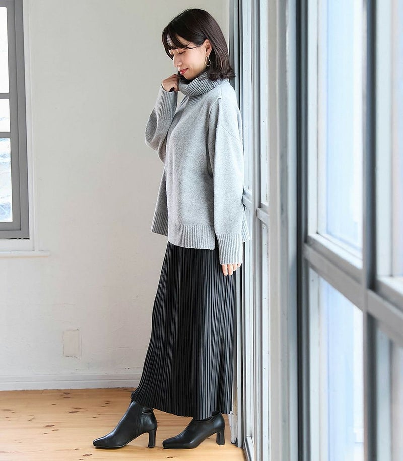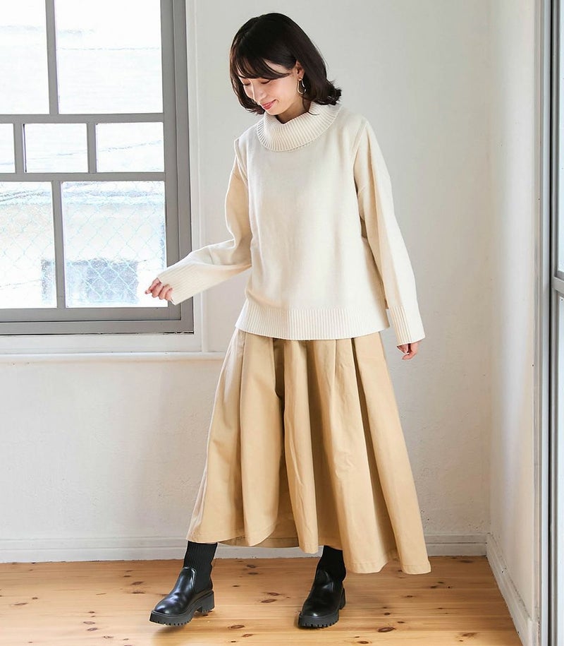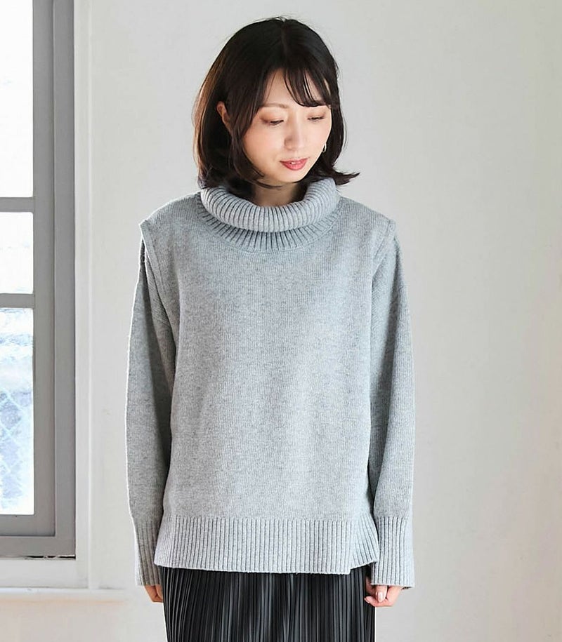 ゆるっとしたオフタートルがポイントのニットトップス。オフタートルネックは、顔まわりや首元がすっきりと見え、小顔効果もあります。ゆったりとしたワイドシルエットで体型カバーも◎