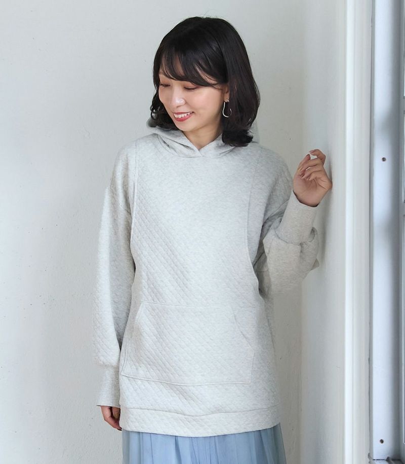 やわらかなオーガニックコットン素材のフーディ。キルト加工によるダイヤ柄のステッチでデザイン性も◎ 中にインナーを着てもごわつかないゆったりなサイズ感です。腰回りをカバーできる長めの着丈もうれしいポイントです。