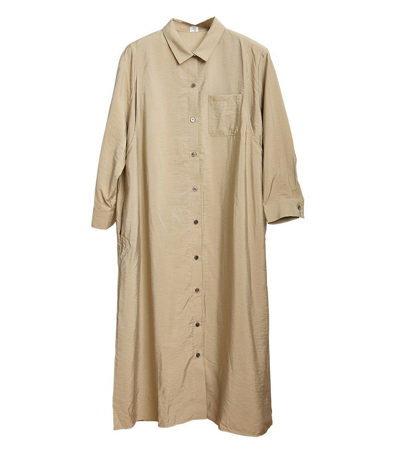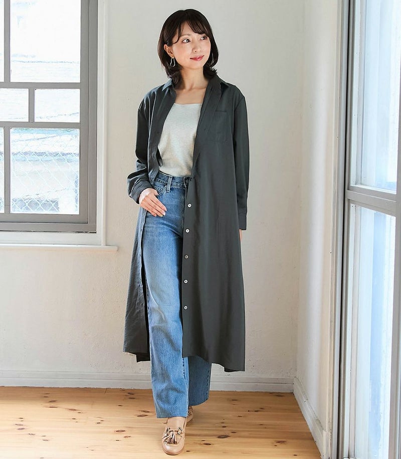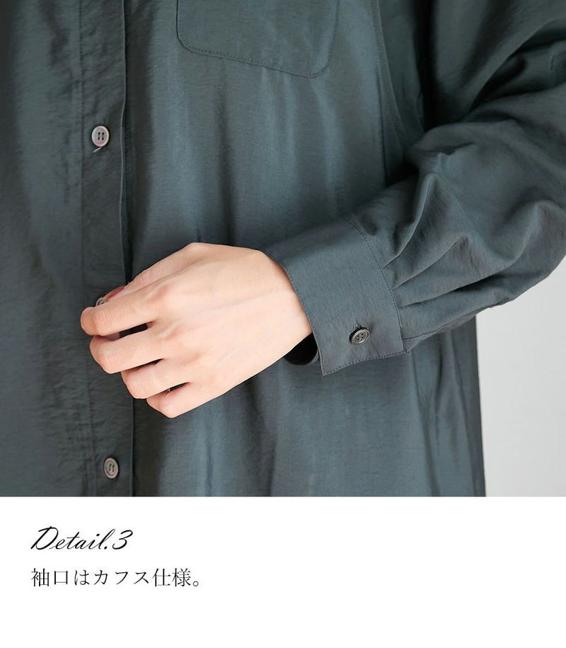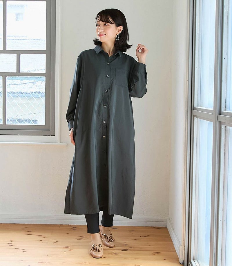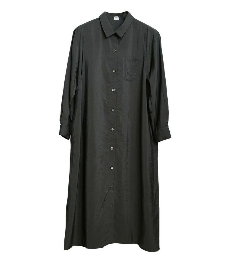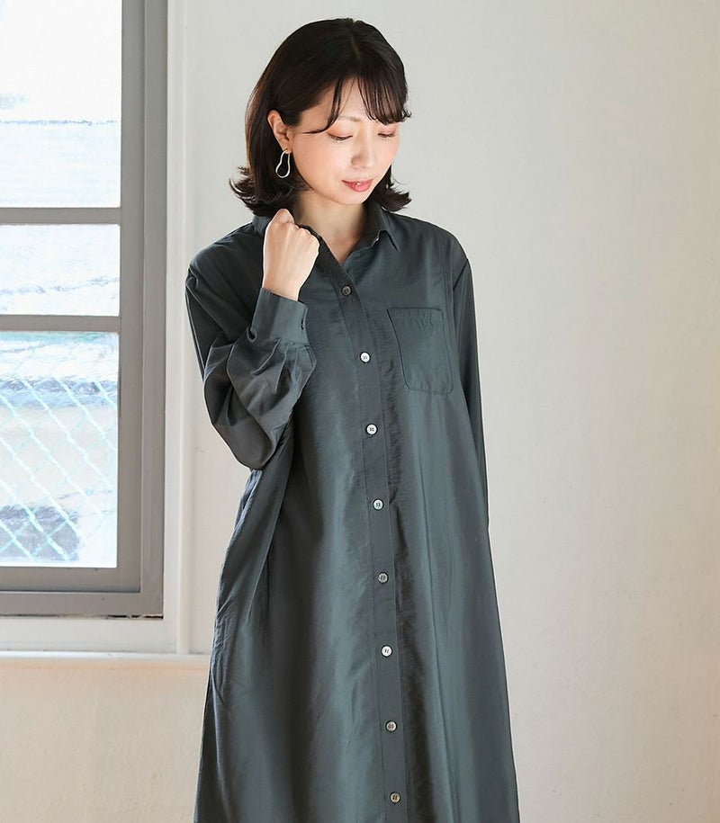 胸のポケットがポイントのシャツワンピース。ゆったり目のサイズ感ですが、落ち感のある生地ですっきりと着ていただけます。前ボタンは全て外せる仕様となっております。 COLOR:チャコール/MODEL:164cm