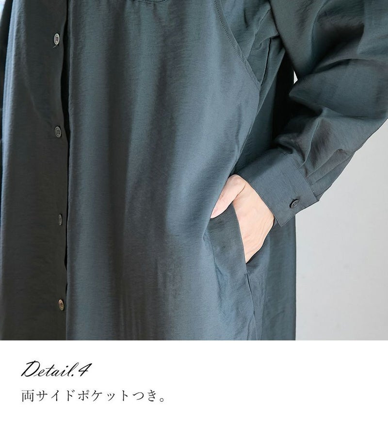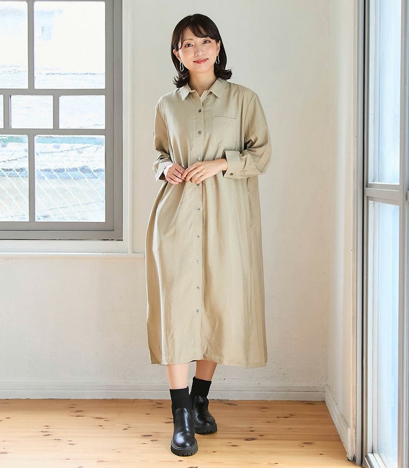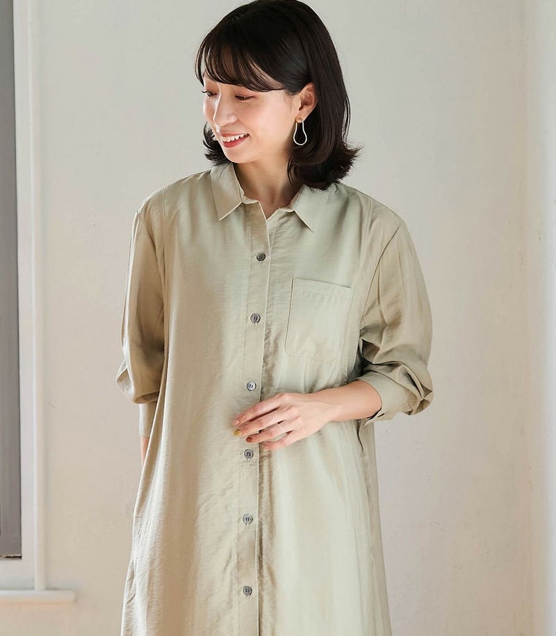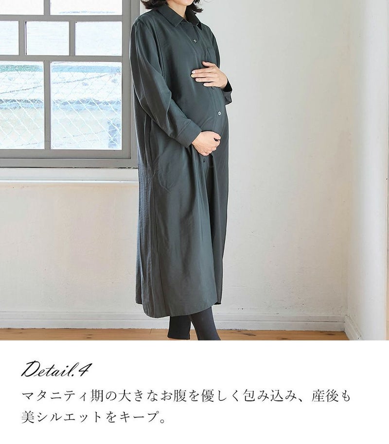 胸のポケットがポイントのシャツワンピース。ゆったり目のサイズ感ですが、落ち感のある生地ですっきりと着ていただけます。前ボタンは全て外せる仕様となっております。カジュアルにもきれいめにも着られるワンピースです。 ●ポケット×2 〈マタニティ(腹囲100cm)対応授乳服〉 まるいお腹を優しく包み込み、妊婦さんがきれいに見えるシルエットにこだわりました。 大きくなったお腹を締めつけず、ゆったりと楽に着ていただけます。 産後の授乳のしやすさも追求した授乳服なので、1枚で2役の便利な授乳服です。 〈生産国:日本〉 〈素材:レーヨン87%、ナイロン13%〉 ドレープのきれいなレーヨン素材を使用。ほどよいハリ感と光沢感が特徴のナチュラルな生地です。吸湿性があり、さらっとした肌触りで快適な着心地です。 〈洗濯表記:洗濯機OK/ネット使用〉