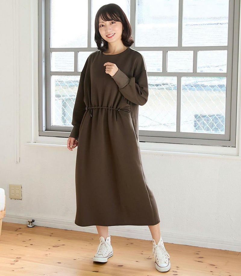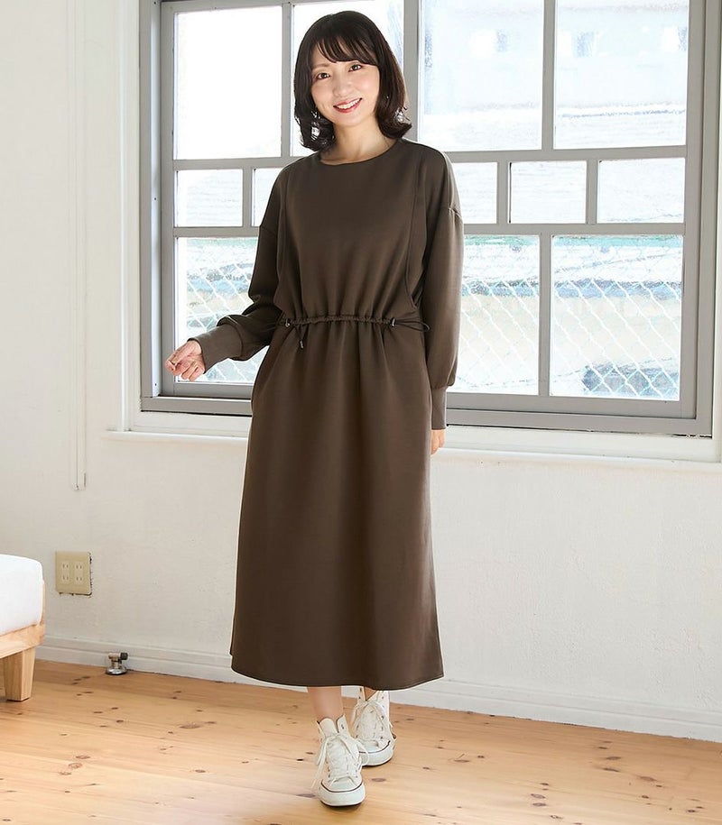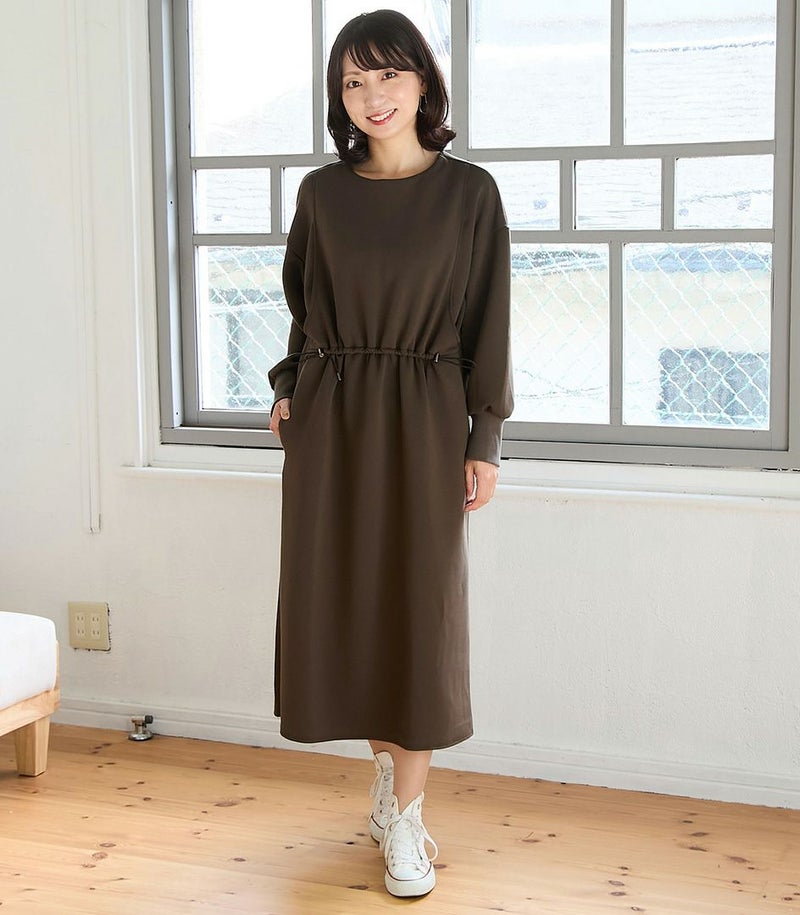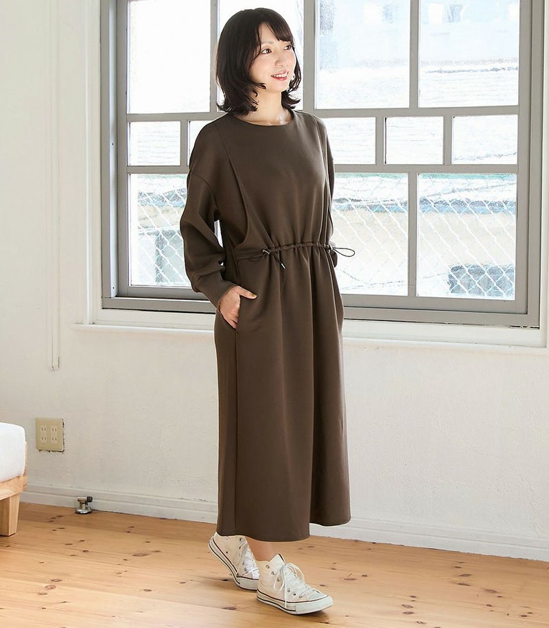 ウエスト部分のドロストデザインがポイントのワンピース。ドロストコードでお好みのシルエットに調節可能です。滑らかなダンボール素材はカジュアルすぎずお出かけ着にも◎バッグの裾のスリットで足さばきも良く、動きやすさも抜群です。 COLOR:ブラウン/MODEL:164cm