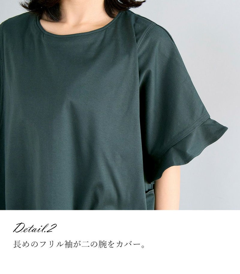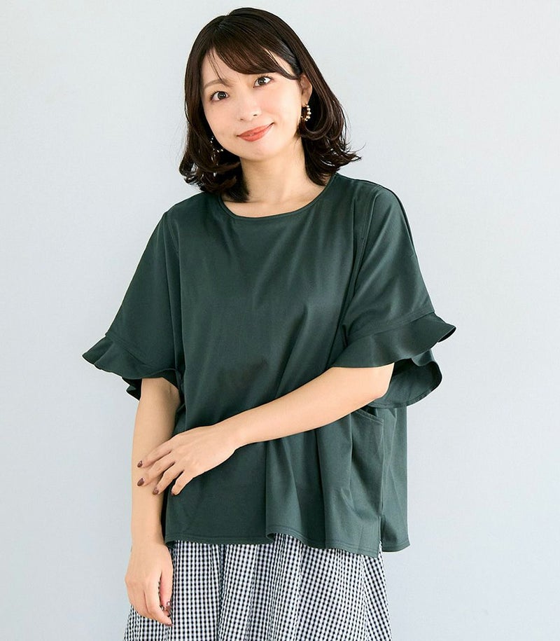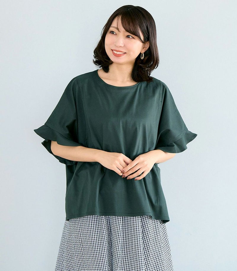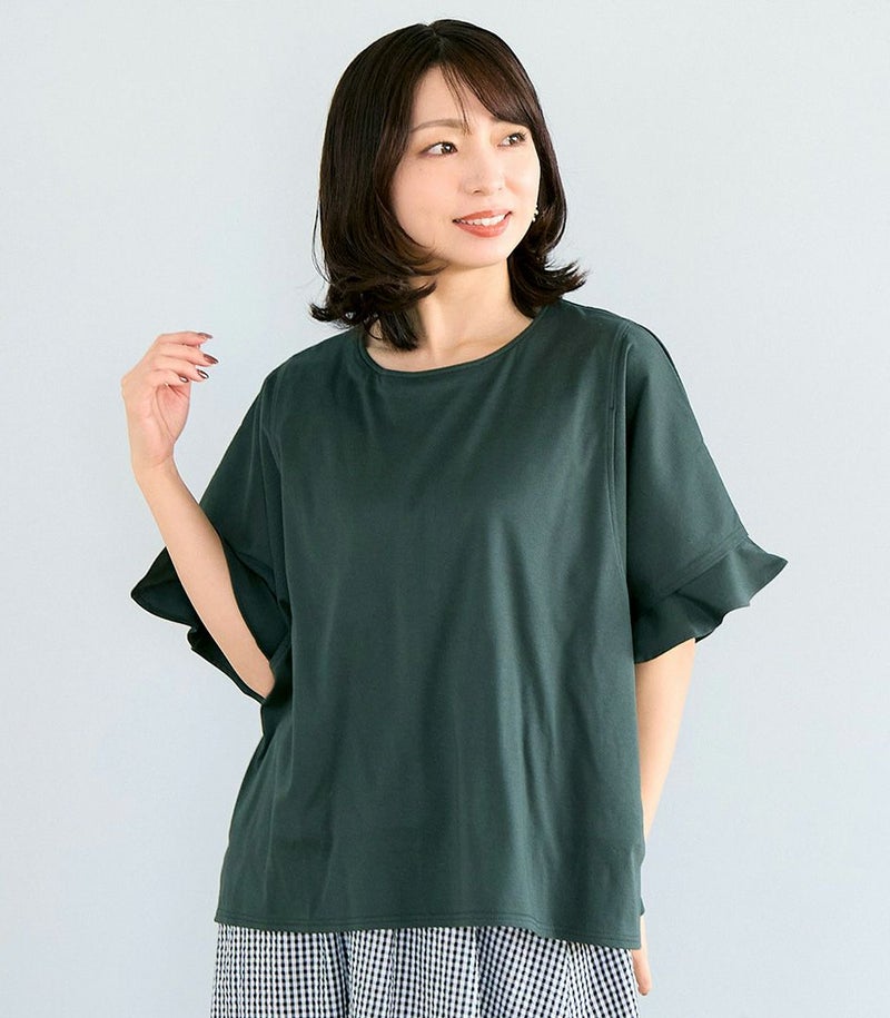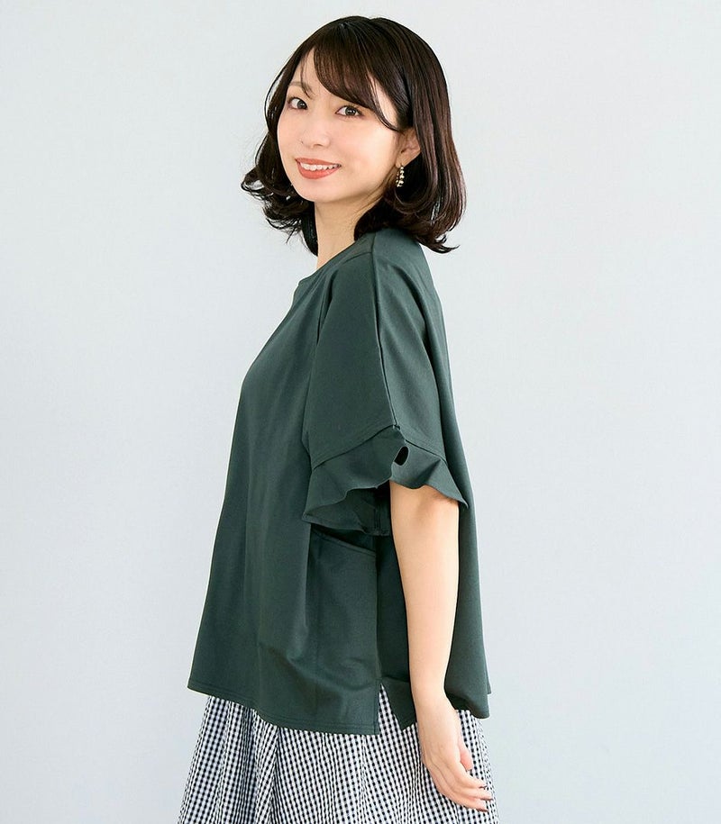 袖のフリルがポイントのオーガニックコットンTシャツ。ゆったりとしたシルエットは身体のラインを拾いにくく体型カバーも◎ オーガニックコットンのやさしい肌触りでママにも赤ちゃんにもやさしい1枚です。 COLOR:グリーン/MODEL:164cm