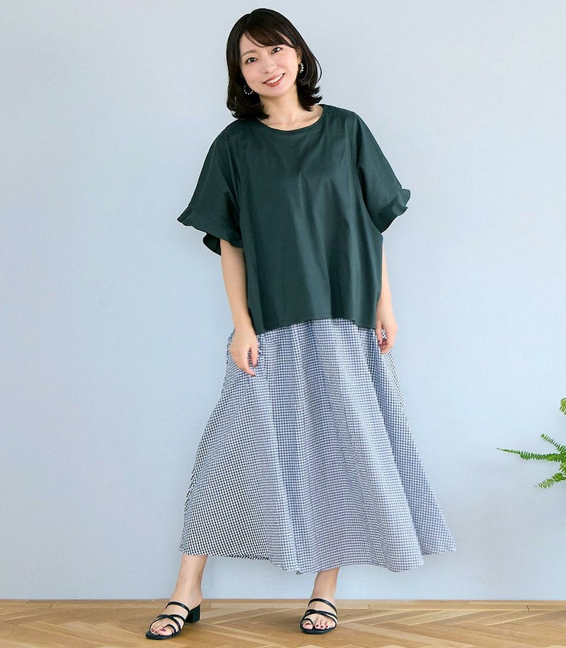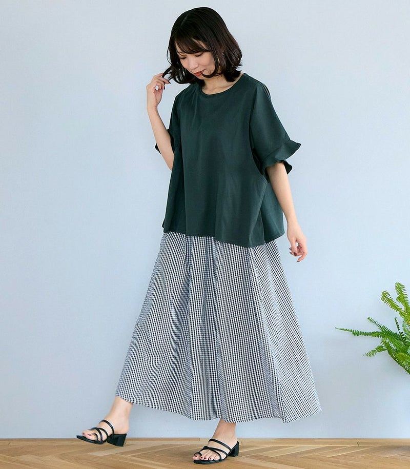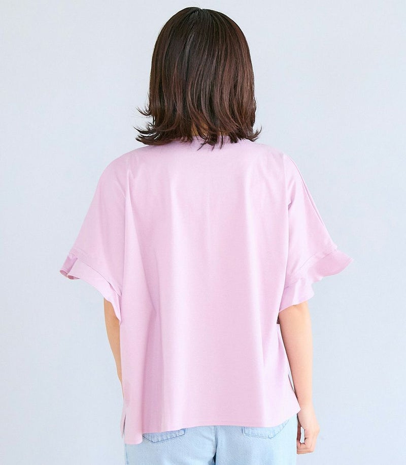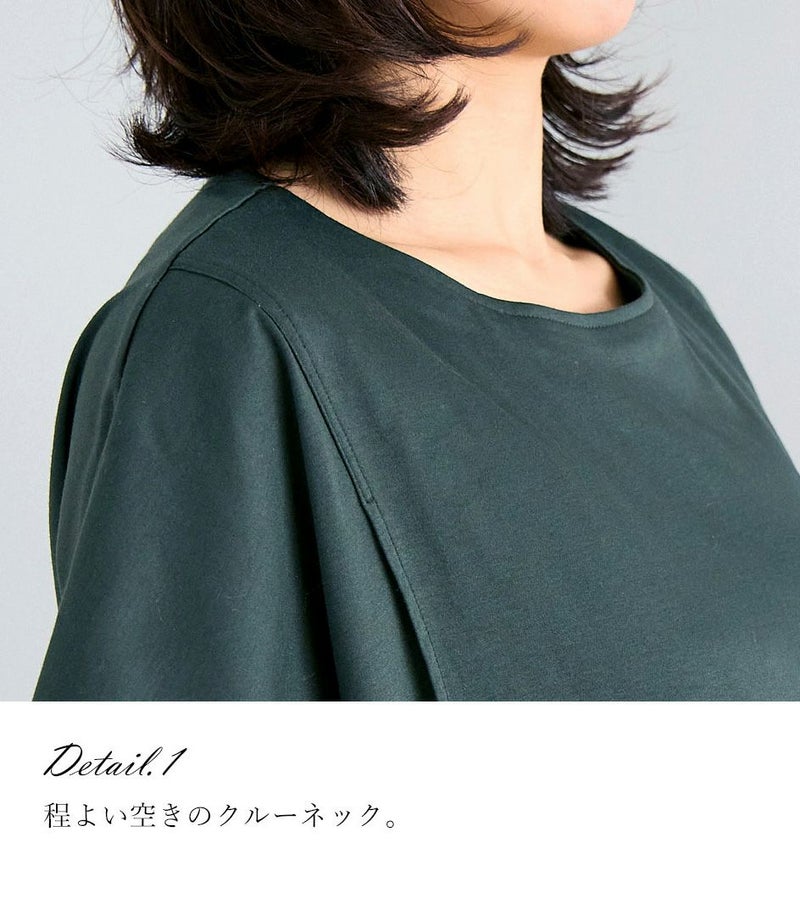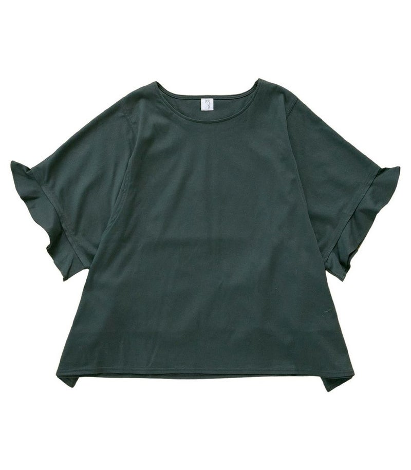 袖のフリルがポイントのオーガニックコットンTシャツ。ゆったりとしたシルエットは身体のラインを拾いにくく体型カバーも◎ オーガニックコットンのやさしい肌触りでママにも赤ちゃんにもやさしい1枚です。 COLOR:グリーン/MODEL:164cm