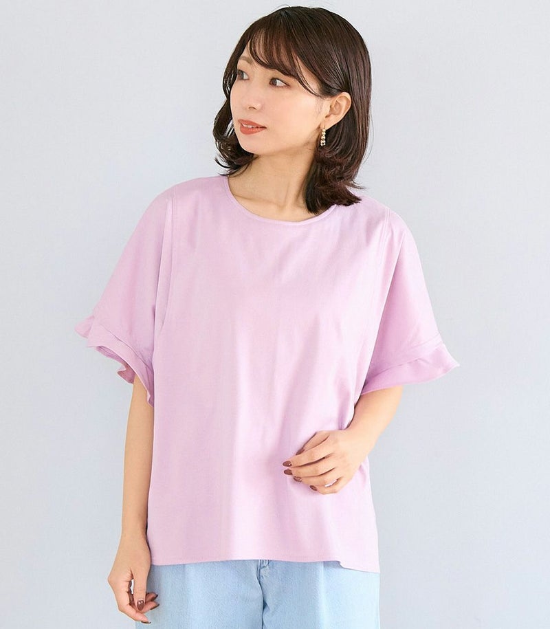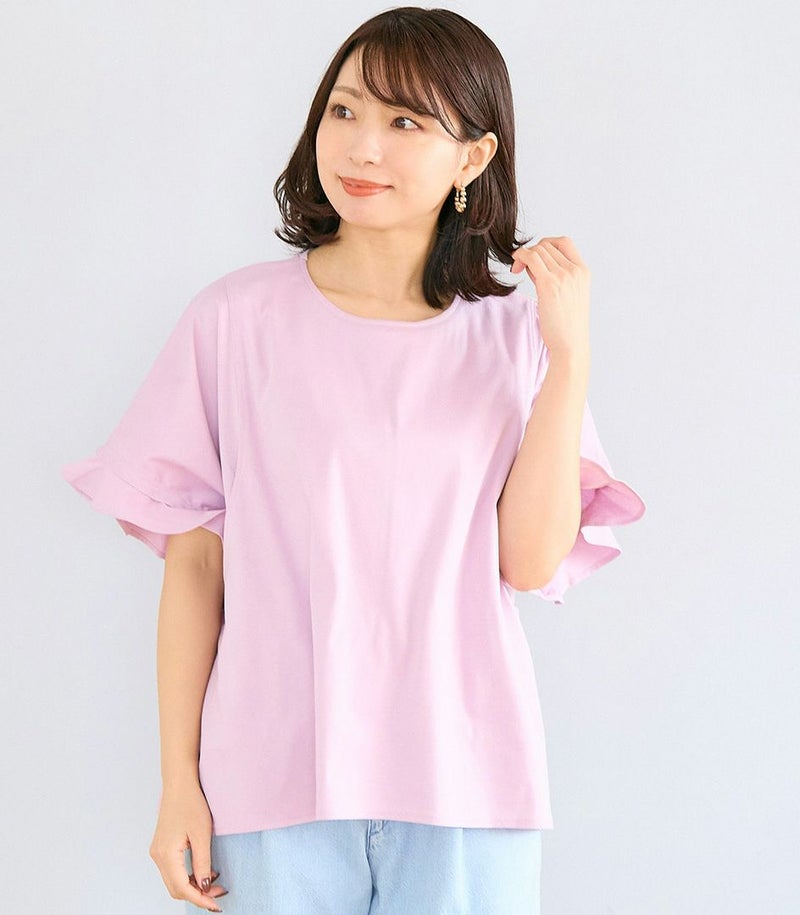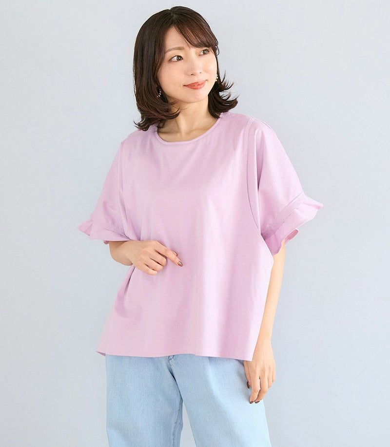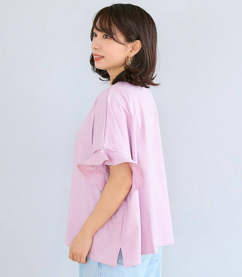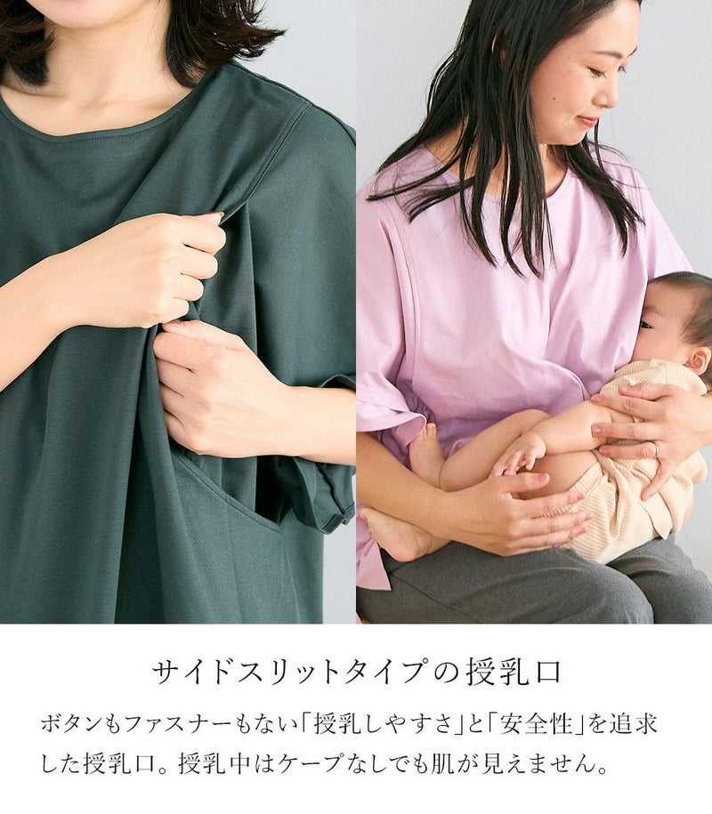 袖のフリルがポイントのオーガニックコットンTシャツ。ゆったりとしたシルエットは身体のラインを拾いにくく体型カバーも◎ オーガニックコットンのやさしい肌触りでママにも赤ちゃんにもやさしい1枚です。 ●ポケット× 〈マタニティ(腹囲100cm)対応授乳服〉 まるいお腹を優しく包み込み、妊婦さんがきれいに見えるシルエットにこだわりました。 大きくなったお腹を締めつけず、ゆったりと楽に着ていただけます。 産後の授乳のしやすさも追求した授乳服なので、1枚で2役の便利な授乳服です。 〈生産国:日本〉 〈素材:オーガニックコットン100%〉 なめらかな肌触りのオーガニックコットンスムース生地を使用。伸縮性があり動きやすさも◎ 透けにくいのも嬉しいポイントです。 〈洗濯表記:洗濯機OK/ネット使用〉