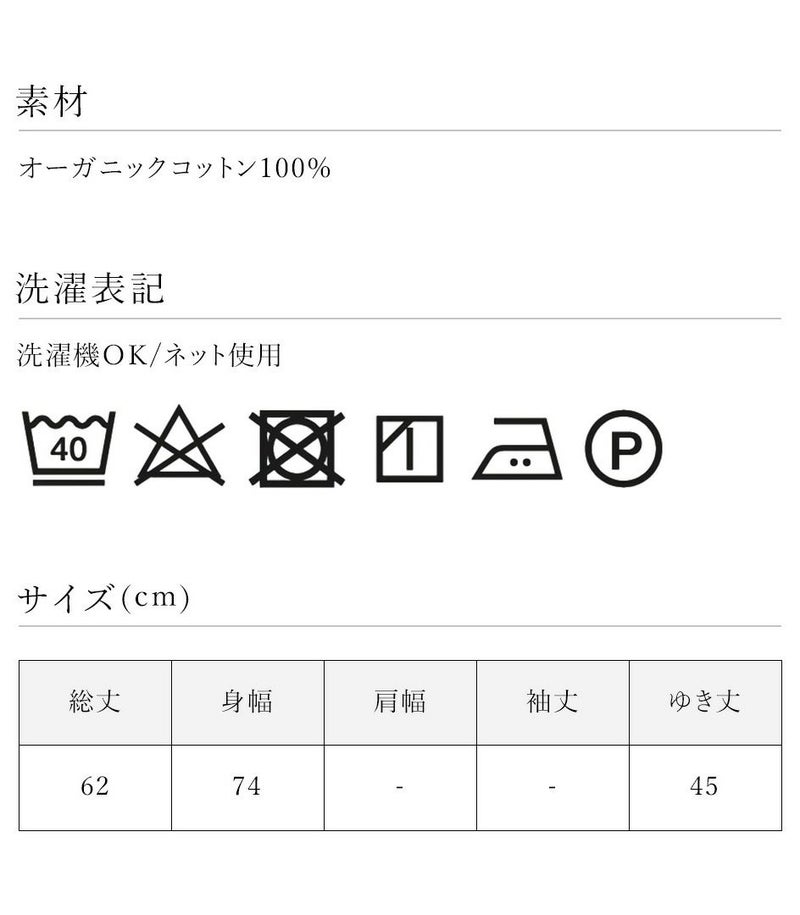 なめらかな肌触りのオーガニックコットンスムース生地を使用。伸縮性があり動きやすさも◎ 透けにくいのも嬉しいポイントです。