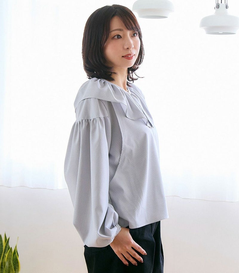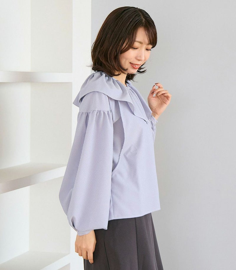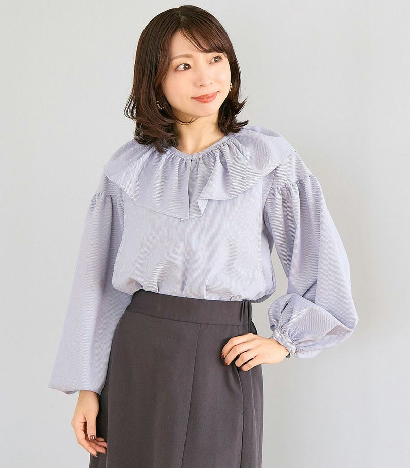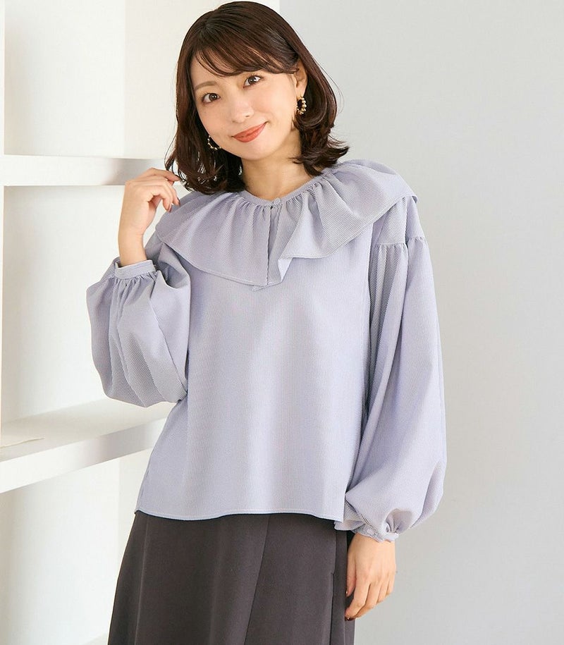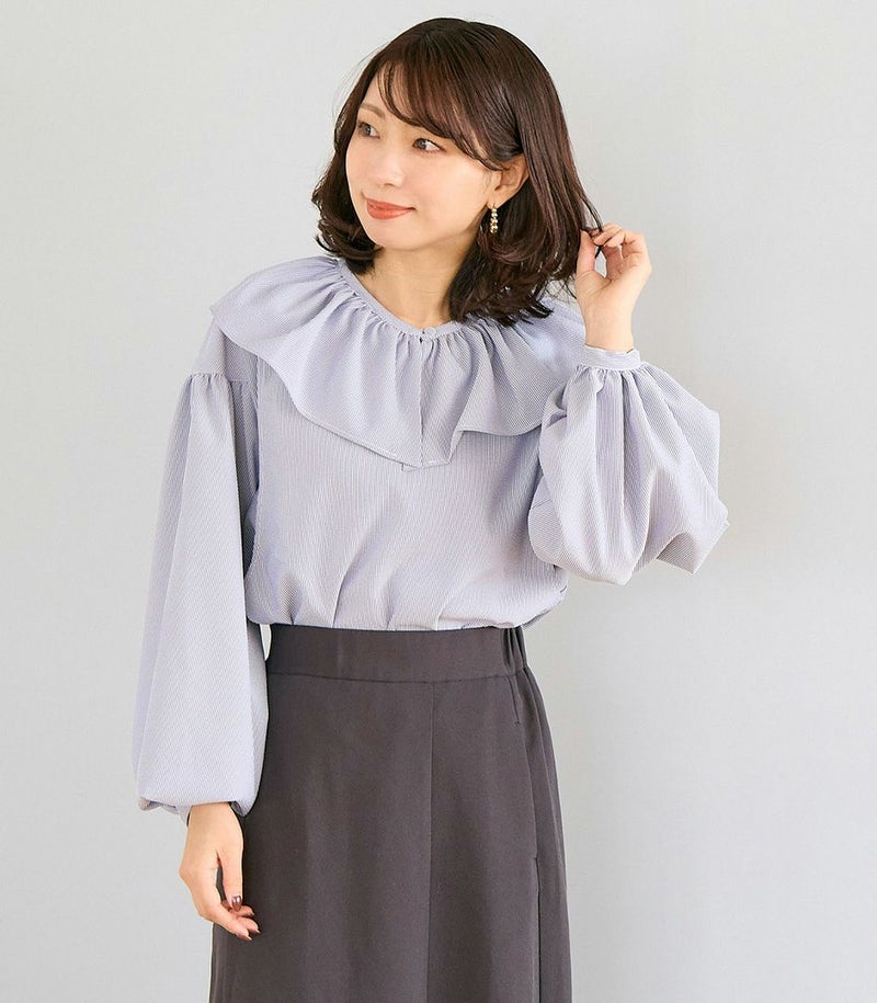 ボリュームのあるフリルの衿がポイントのブラウス。身体のラインを拾わないゆったりとしたシルエットで体型カバーも◎ ふんわりとした袖のデザインで可愛らしい印象です。 COLOR:ネイビー/MODEL:164cm