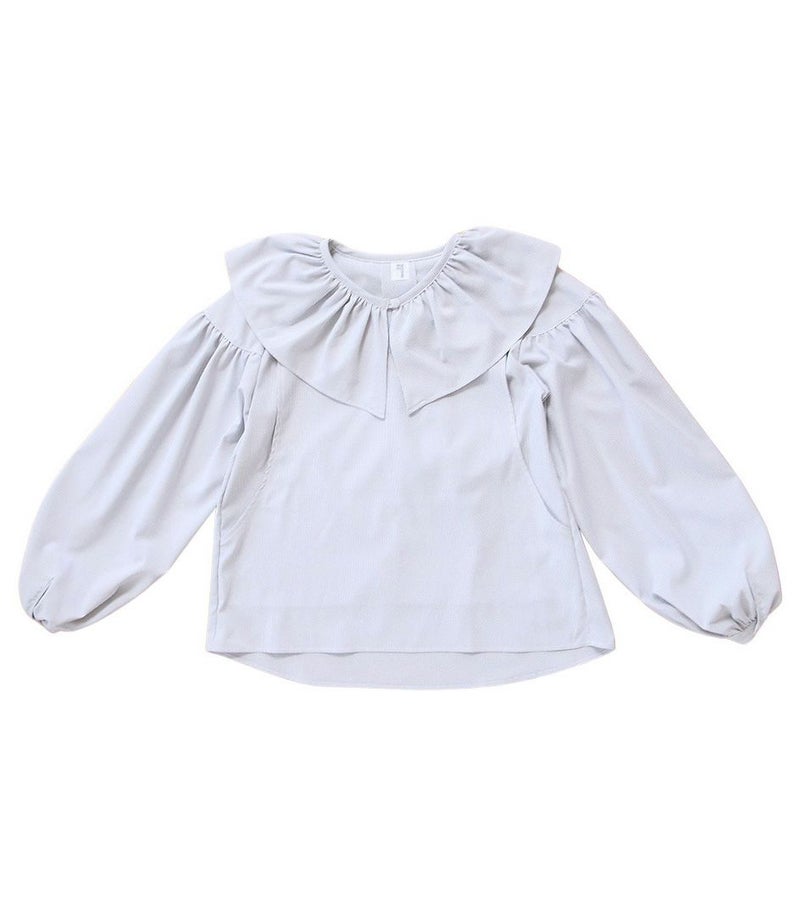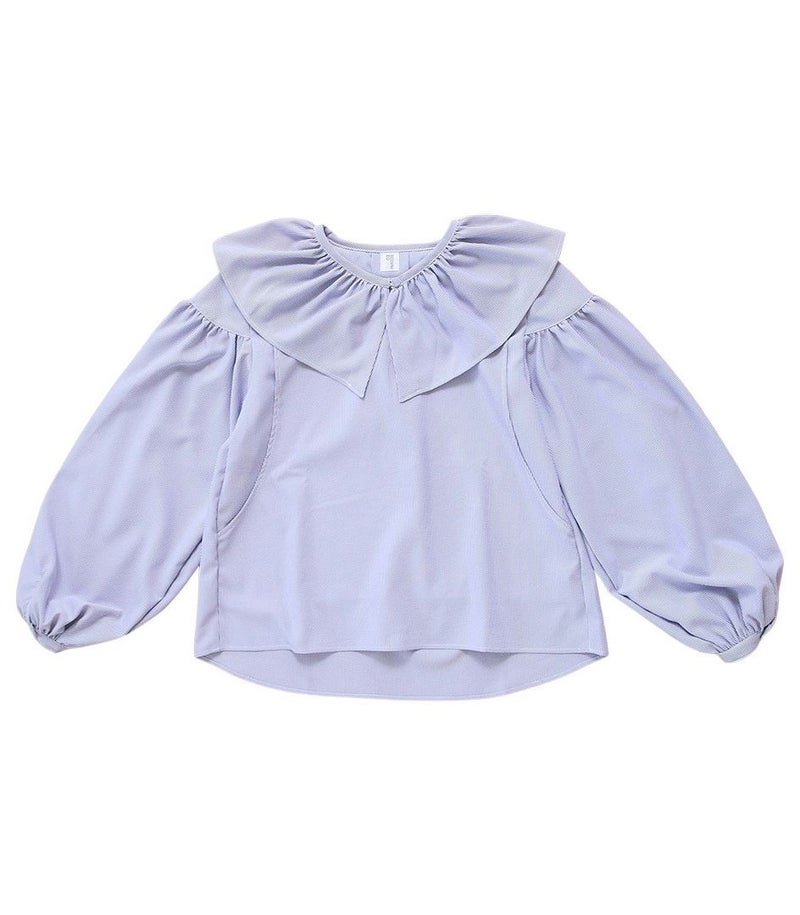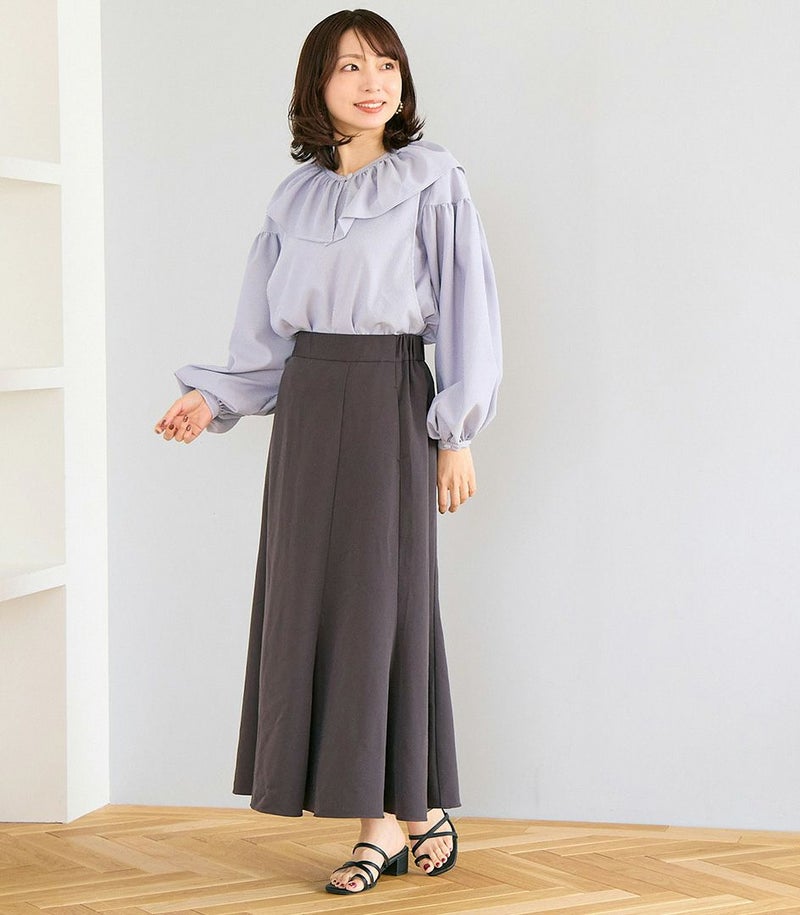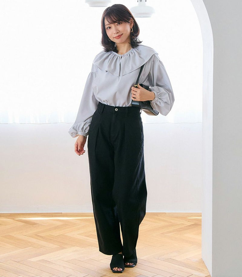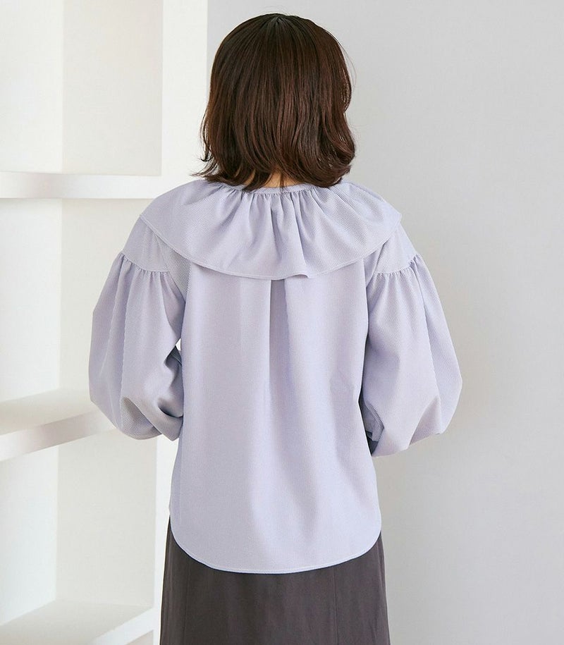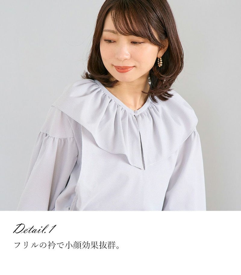 ボリュームのあるフリルの衿がポイントのブラウス。身体のラインを拾わないゆったりとしたシルエットで体型カバーも◎ ふんわりとした袖のデザインで可愛らしい印象です。 COLOR:ネイビー/MODEL:164cm