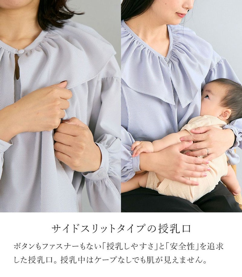 ボリュームのあるフリルの衿がポイントのブラウス。身体のラインを拾わないゆったりとしたシルエットで体型カバーも◎ ふんわりとした袖のデザインで可愛らしい印象です。 ●ポケット× 〈マタニティ(腹囲100cm)対応授乳服〉 まるいお腹を優しく包み込み、妊婦さんがきれいに見えるシルエットにこだわりました。 大きくなったお腹を締めつけず、ゆったりと楽に着ていただけます。 産後の授乳のしやすさも追求した授乳服なので、1枚で2役の便利な授乳服です。 〈生産国:日本〉 〈素材:ポリエステル100%〉 やや薄手で速乾性のある生地です。凹凸のあるさらっとした肌さわりが特徴で暖かい時期にも快適に着ていただけます。シワになりにくく、イージーケアなのも嬉しいポイントです。 〈洗濯表記:洗濯機OK/ネット使用〉
