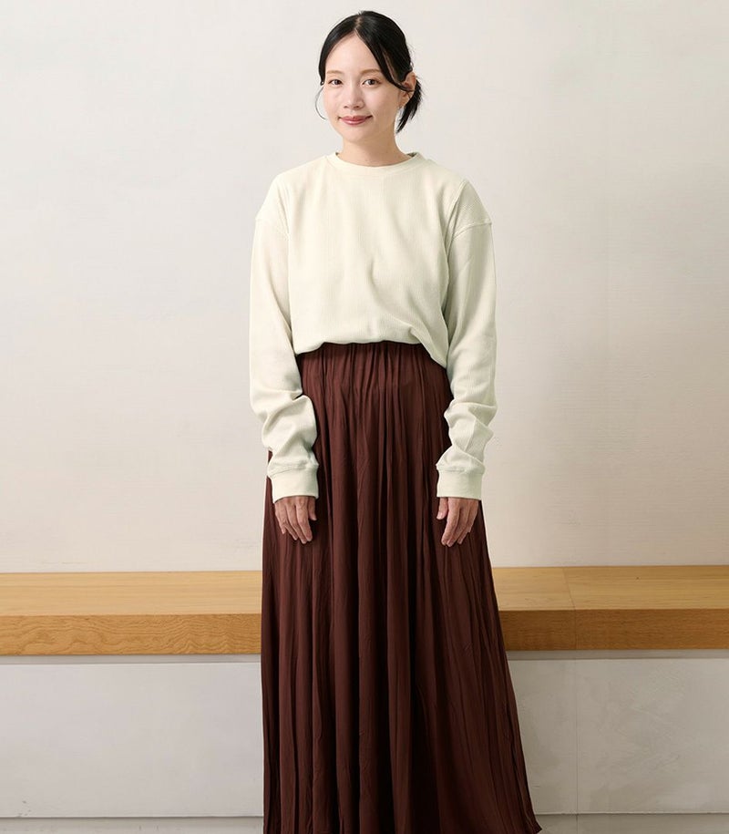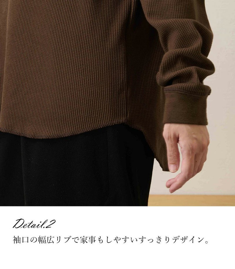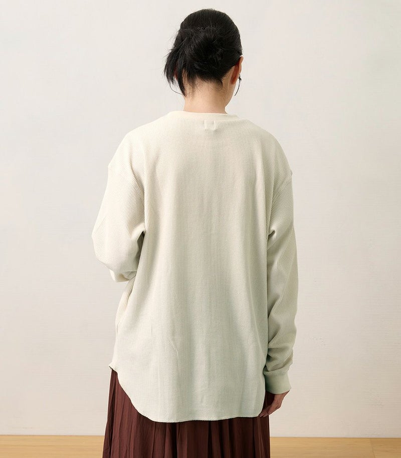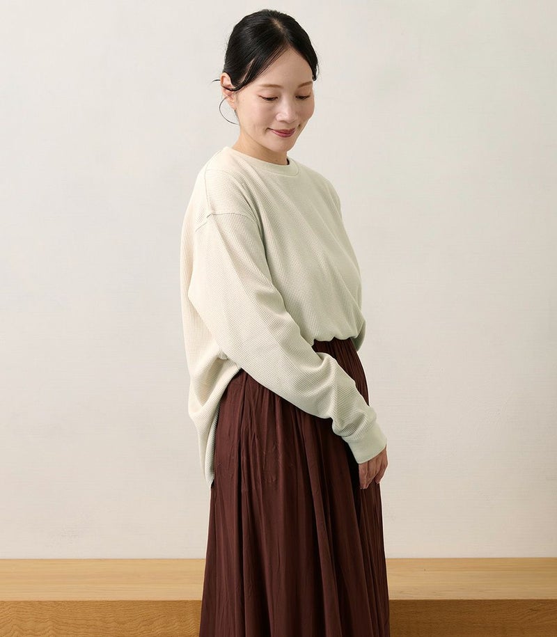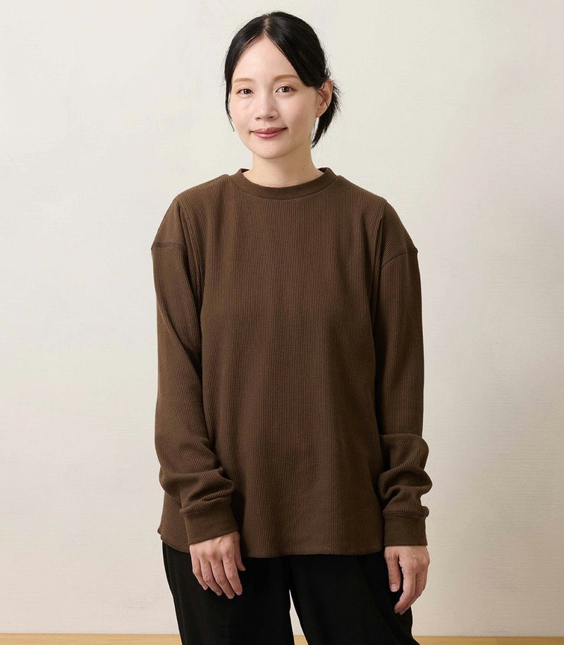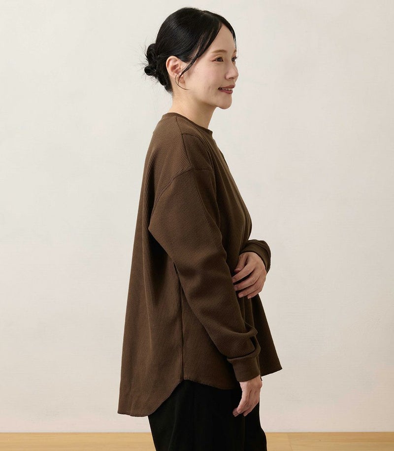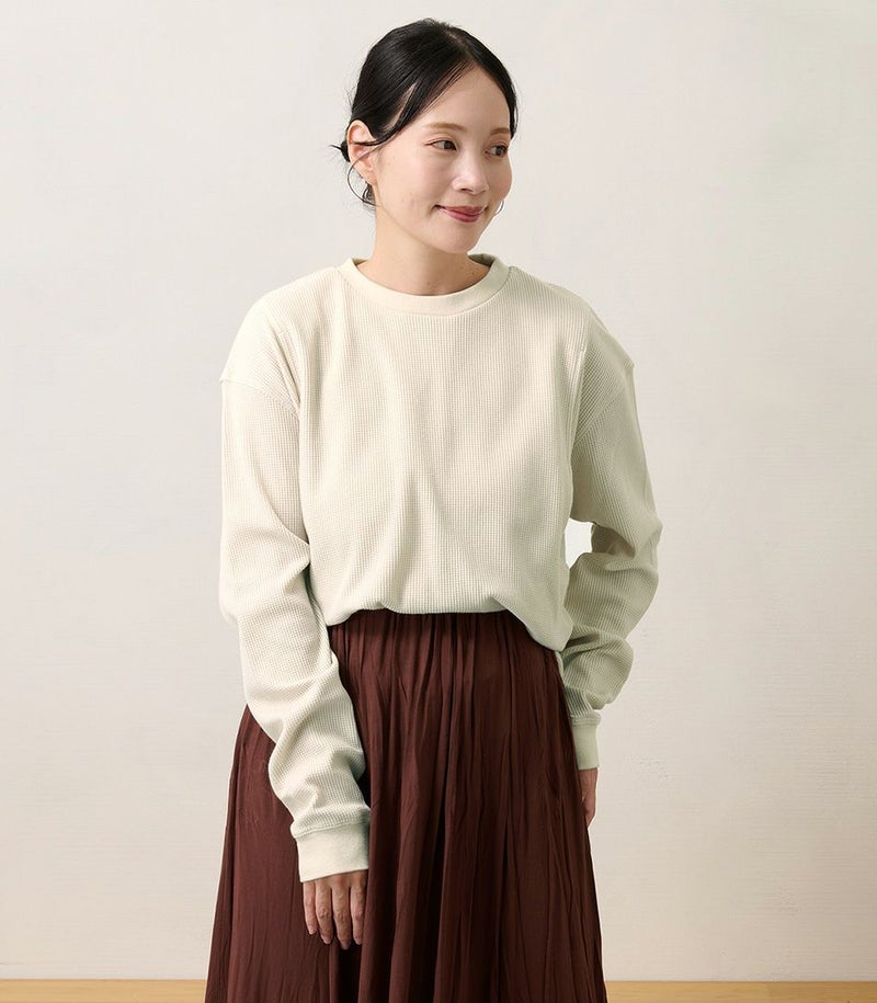 ゆるっとしたシルエットのワッフルロンT。体型カバーも◎ 凹凸のあるワッフル生地は、肌への接触面積を減らし通気性や吸水性を高めるため、さらっと快適に着られるトップスです。 COLOR:スモークベージュ/MODEL:158cm