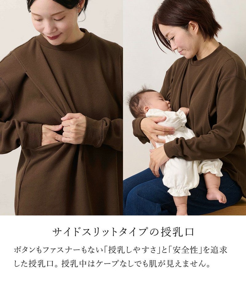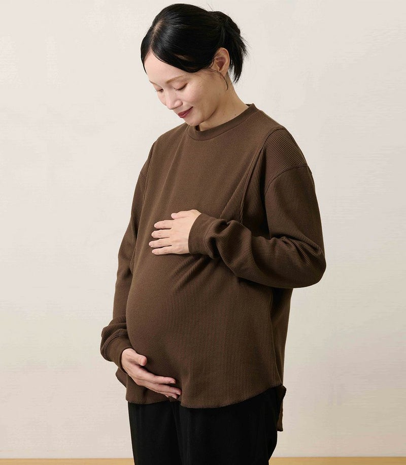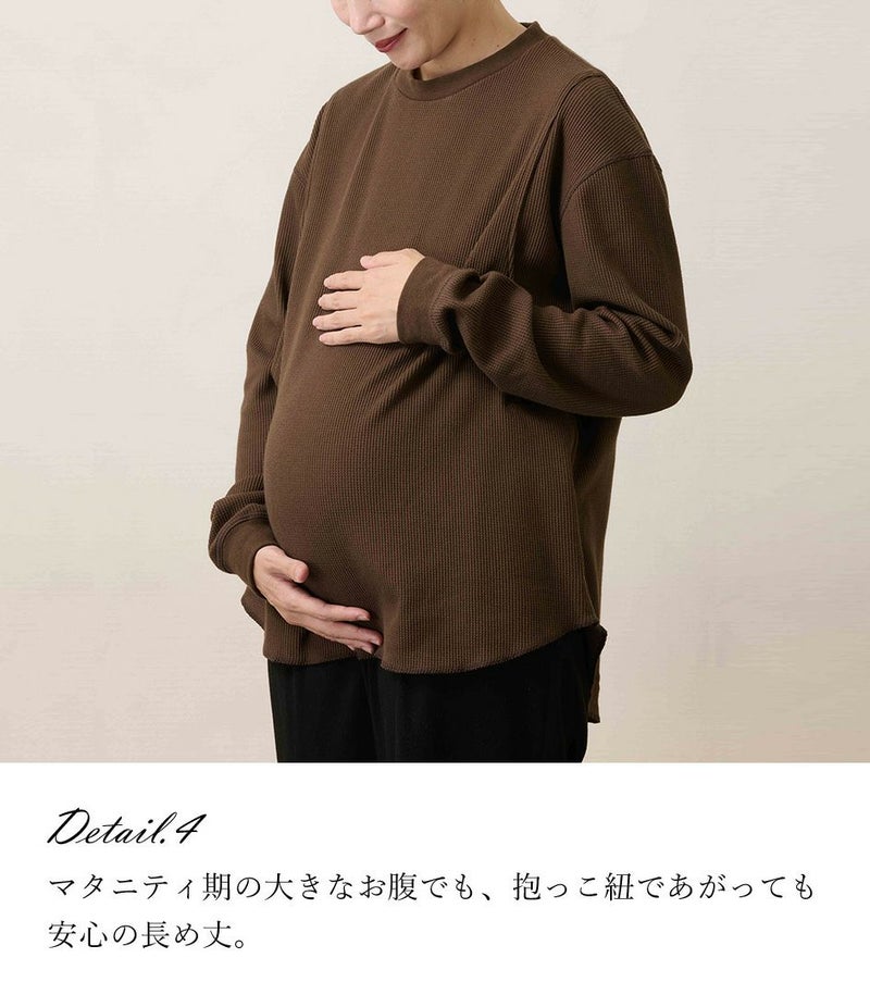 ゆるっとしたシルエットのワッフルロンT。体型カバーも◎ 凹凸のあるワッフル生地は、肌への接触面積を減らし通気性や吸水性を高めるため、さらっと快適に着られるトップスです。 ●ポケット× 〈マタニティ(腹囲100cm)対応授乳服〉 まるいお腹を優しく包み込み、妊婦さんがきれいに見えるシルエットにこだわりました。 大きくなったお腹を締めつけず、ゆったりと楽に着ていただけます。 産後の授乳のしやすさも追求した授乳服なので、1枚で2役の便利な授乳服です。 〈生産国:日本〉 〈素材:綿73%、ポリエステル27% 別布:綿95%、ポリウレタン5%〉 綿素材の肌触りの良さとポリエステルの耐久性や速乾性を兼ね備えた素材です。ポリエステル混紡により、シワになりにくく、イージーケアで着られるのも嬉しいポイント。やわらかな肌触りと伸縮性のある生地で、動きやすさも◎ 〈洗濯表記:洗濯機OK/ネット使用〉