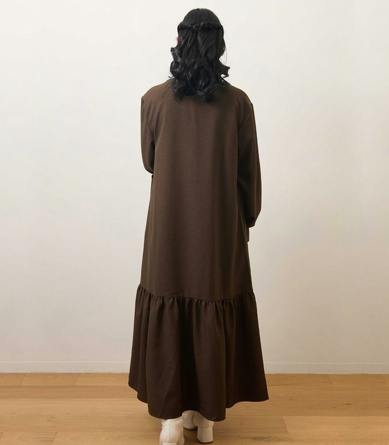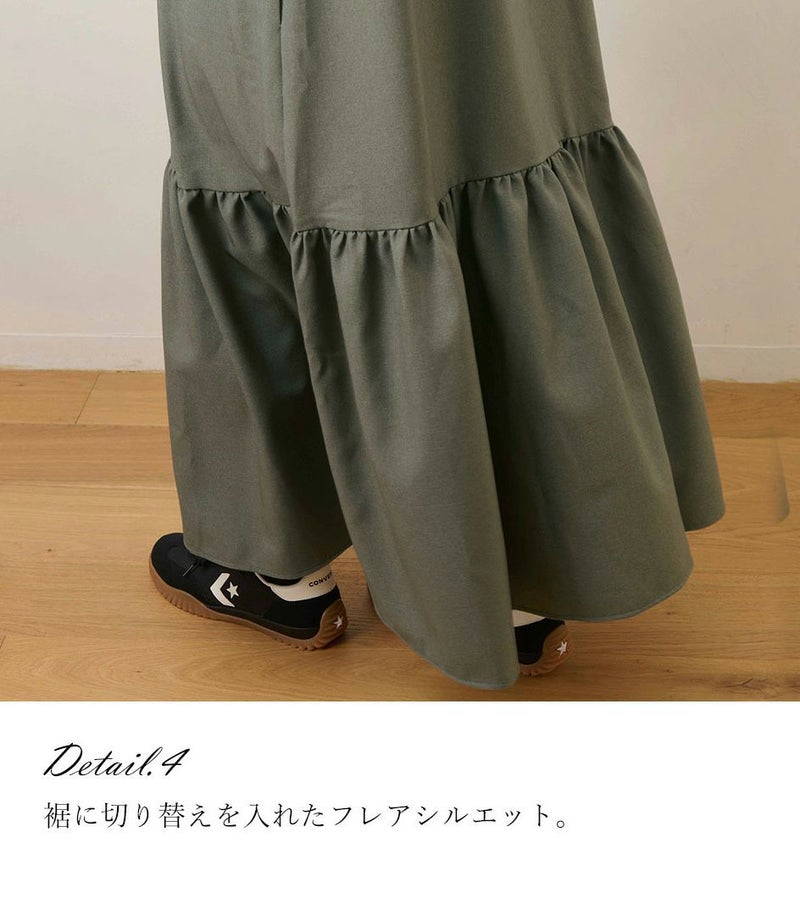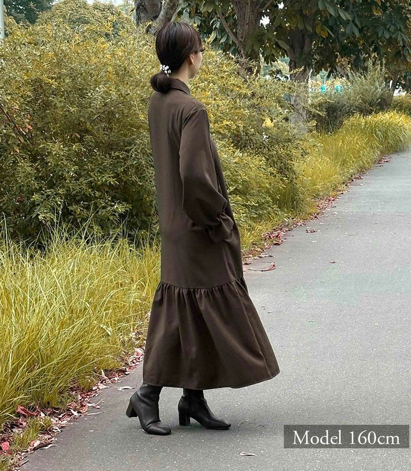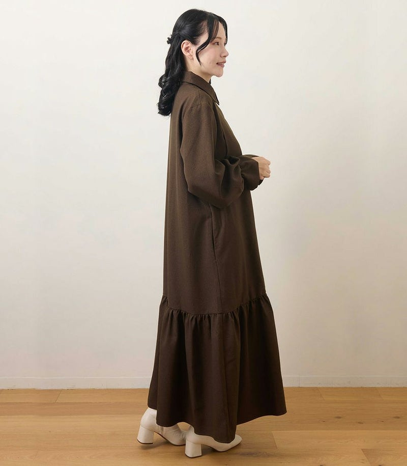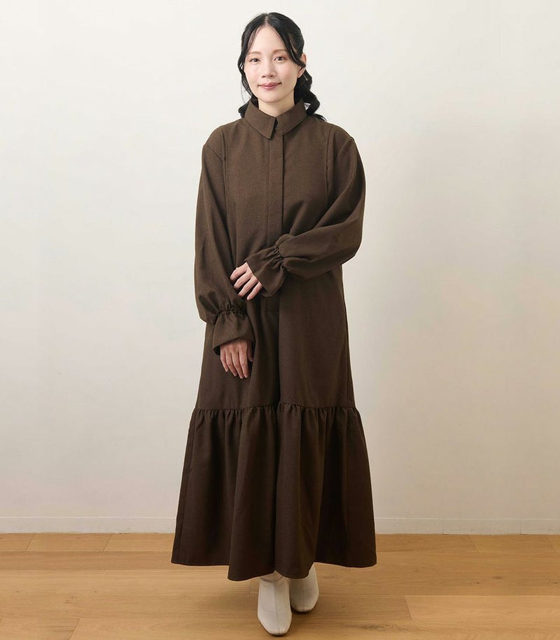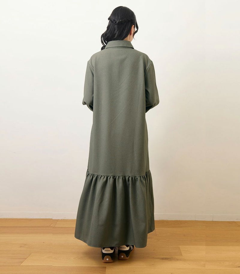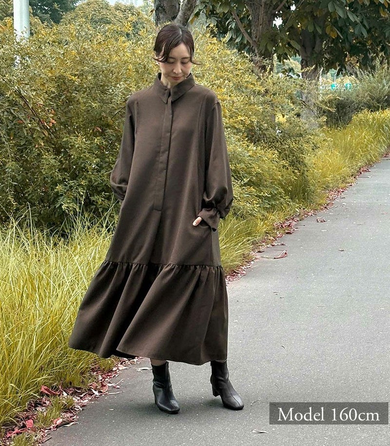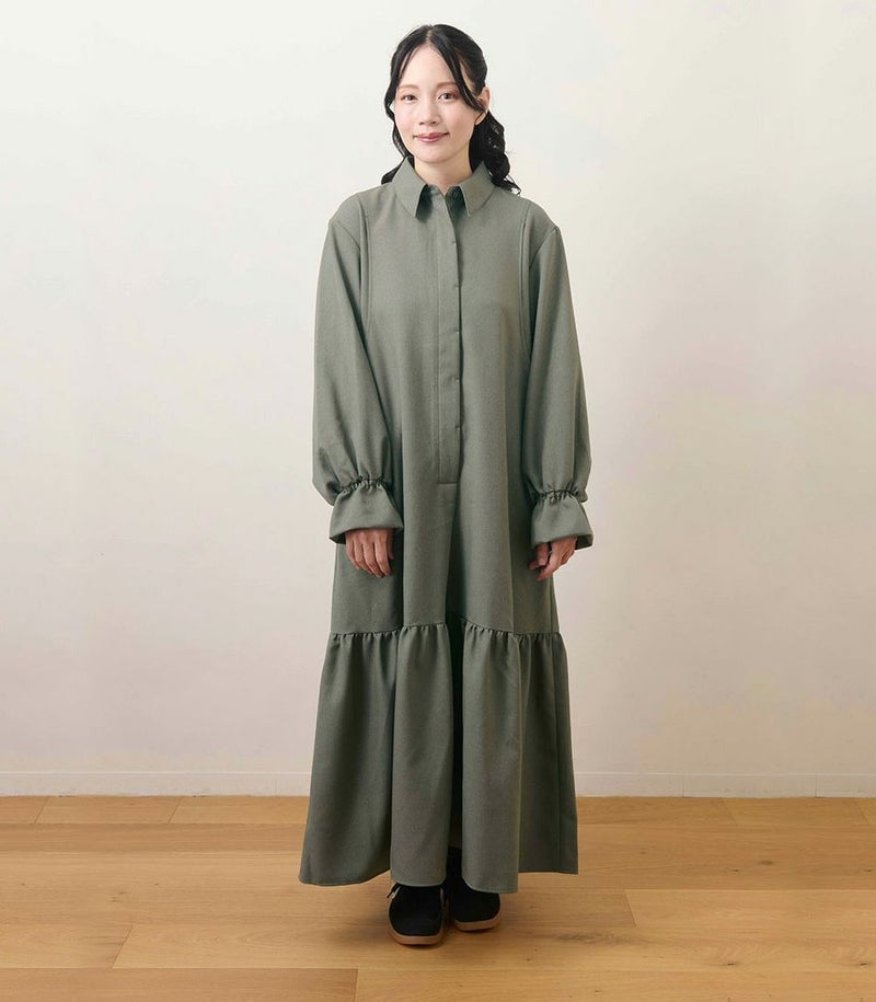 ウールのような柔らかさと高級感のある風合いが特徴のロングワンピース。裾に切り替えを入れたフレアシルエットは歩くたびに揺れて、女性らしい華やかな印象に。フロントは前立てに布を重ねることでボタンが隠れる仕様(比翼仕立て)にし、体型カバーをしながらすっきり見えが叶う1枚です。 COLOR:ライトカーキ/MODEL:158cm