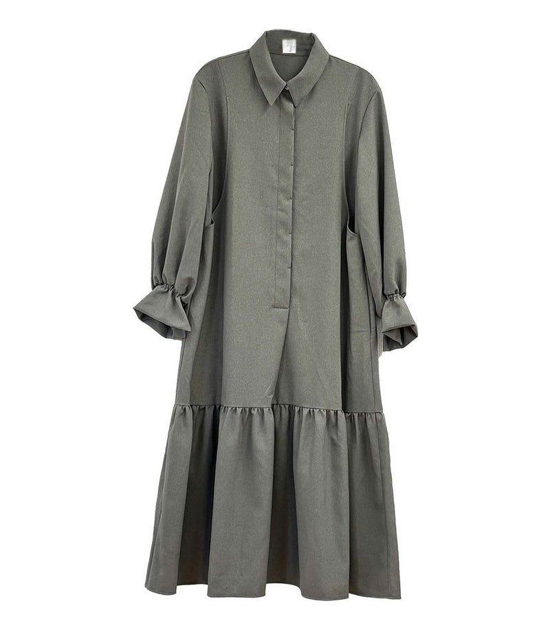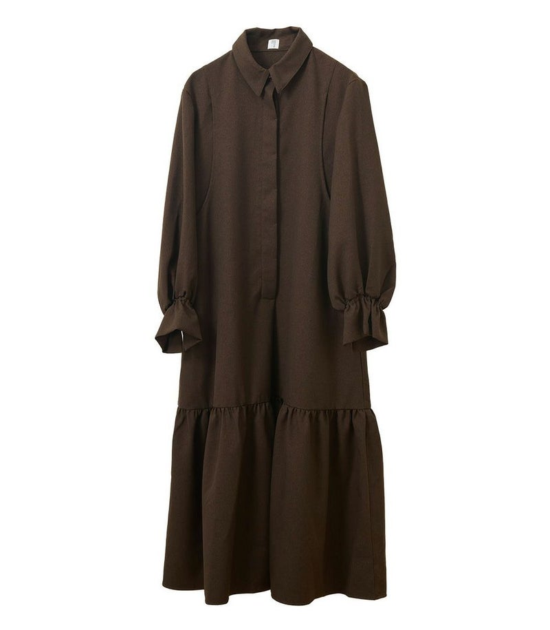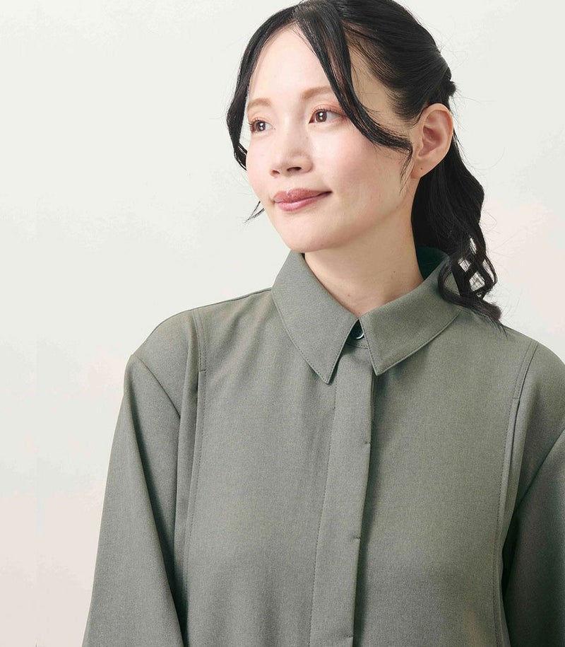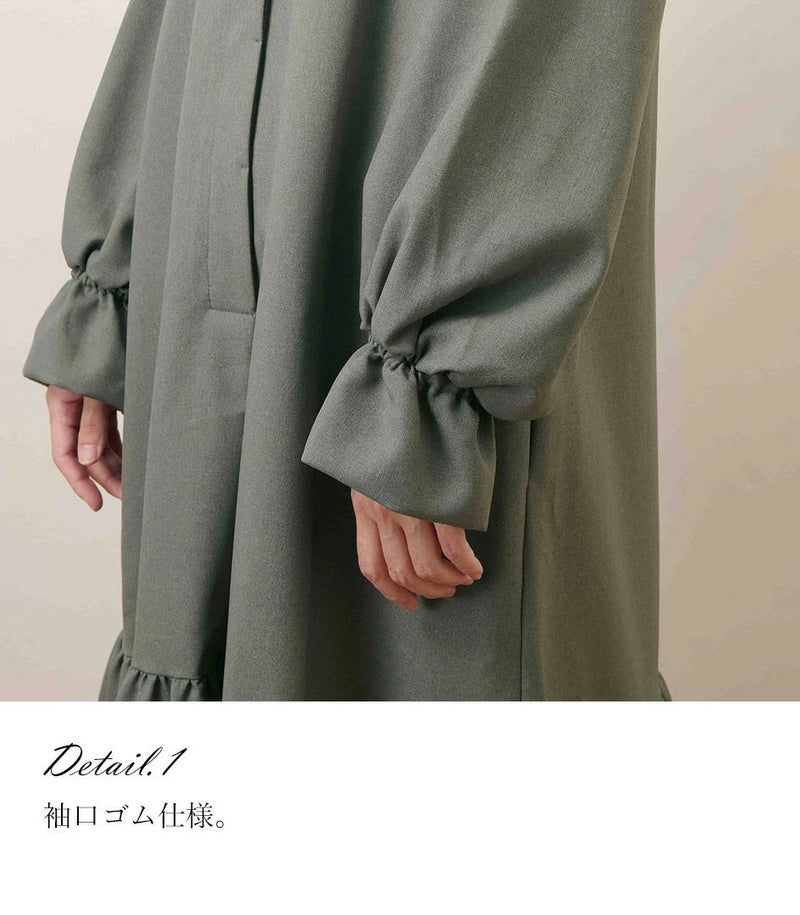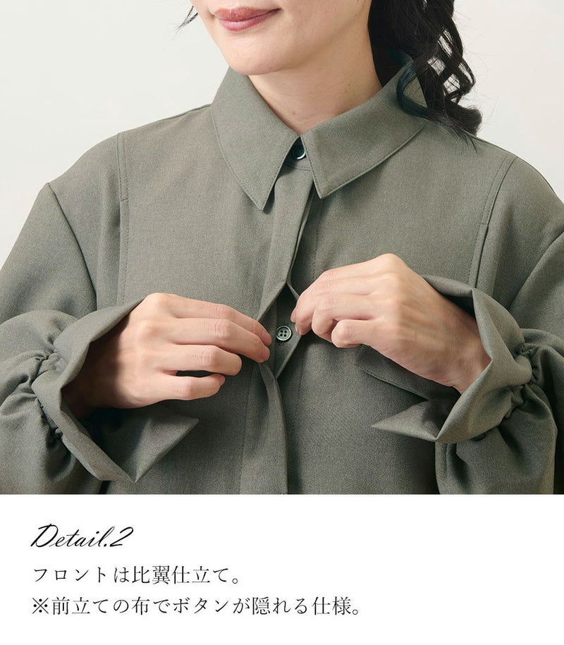襟付きのシャツワンピースならではの上品さに、袖口にギャザーを寄せたボリュームスリーブで女性らしい華やかさをプラス。普段使いからフォーマルまで幅広く活躍します。