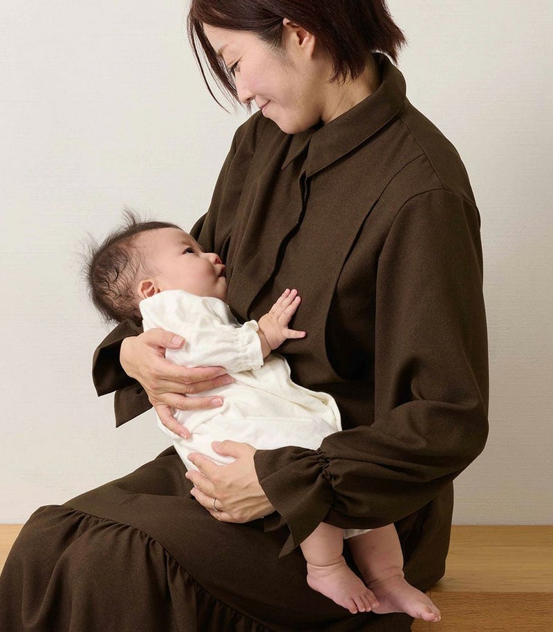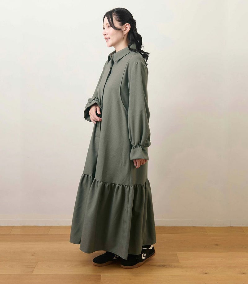 ウールのような柔らかさと高級感のある風合いが特徴のロングワンピース。裾に切り替えを入れたフレアシルエットは歩くたびに揺れて、女性らしい華やかな印象に。フロントは前立てに布を重ねることでボタンが隠れる仕様(比翼仕立て)にし、体型カバーをしながらすっきり見えが叶う1枚です。 ●ポケット×2 〈マタニティ(腹囲100cm)対応授乳服〉 まるいお腹を優しく包み込み、妊婦さんがきれいに見えるシルエットにこだわりました。 大きくなったお腹を締めつけず、ゆったりと楽に着ていただけます。 産後の授乳のしやすさも追求した授乳服なので、1枚で2役の便利な授乳服です。 〈生産国:日本〉 〈素材:ポリエステル100%〉 ウールのような上品な見た目と柔らかな風合いが特徴です。シワになりにくく、ピリングしにくいなどイージーケア性に優れています。ほどよいストレッチ性もあり、動きやすさも◎ 〈洗濯表記:洗濯機OK/ネット使用〉