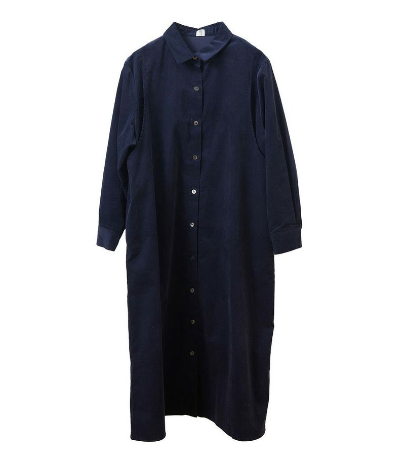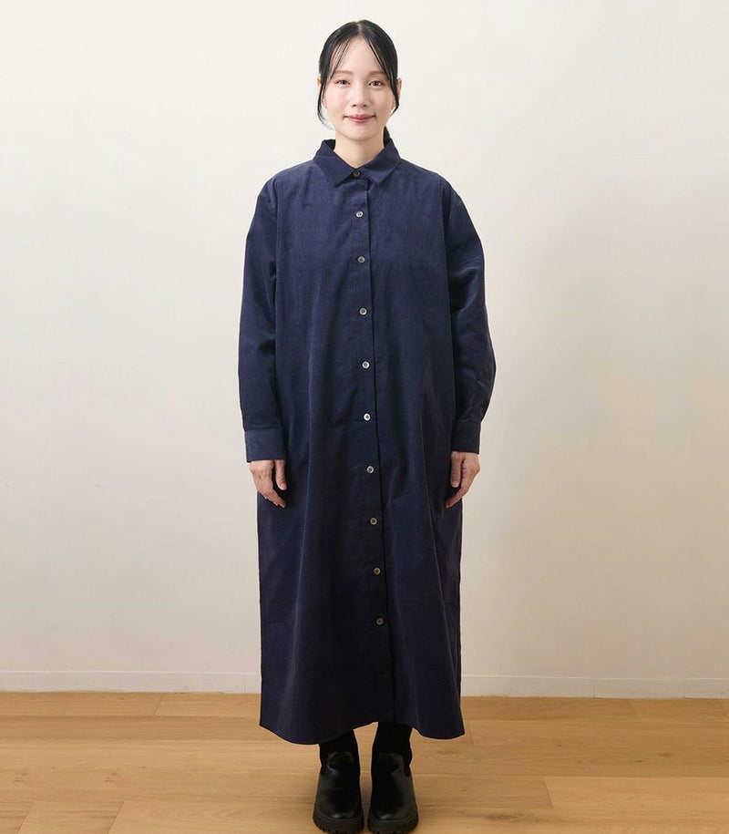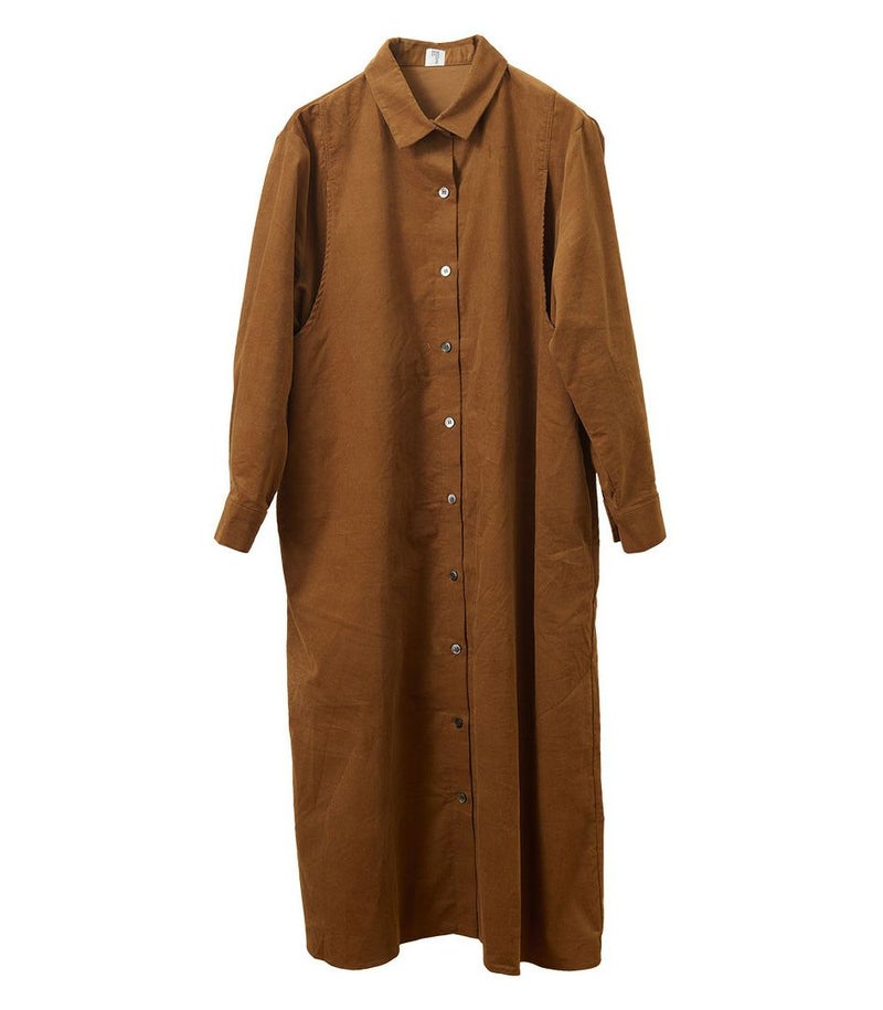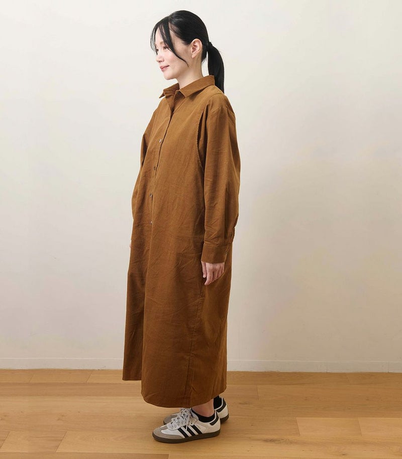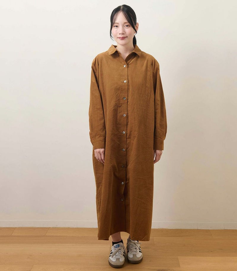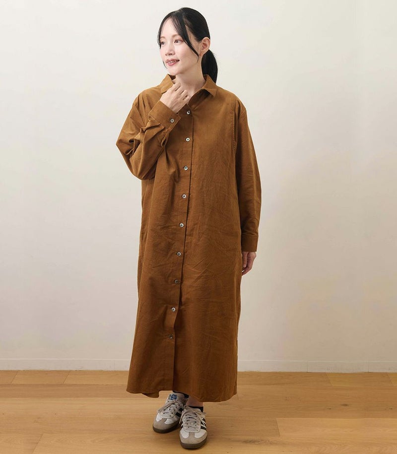 秋冬の定番素材、コーデュロイを贅沢に使用したロング丈のシャツワンピース。細めのタテ畝とほどよい光沢感で上品な印象に。広がりすぎないAラインシルエットが体型を拾わずにすっきり見せてくれるのも嬉しいポイントです。前ボタンは全て外せる仕様です。 COLOR:ブラウン/MODEL:158cm