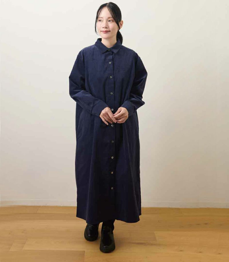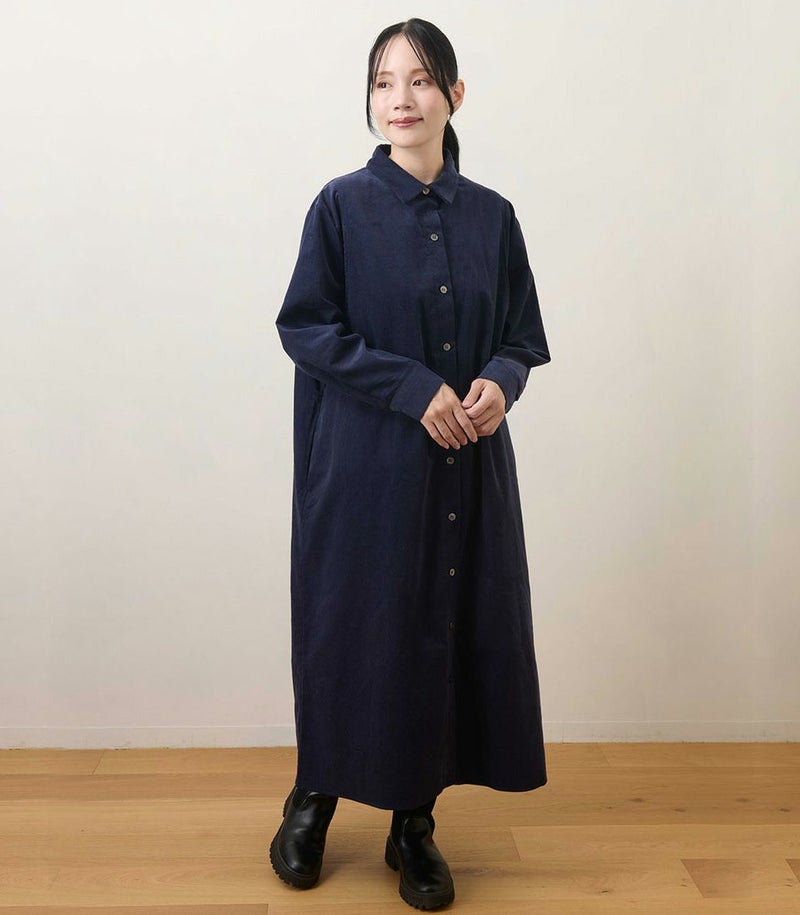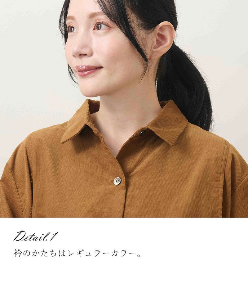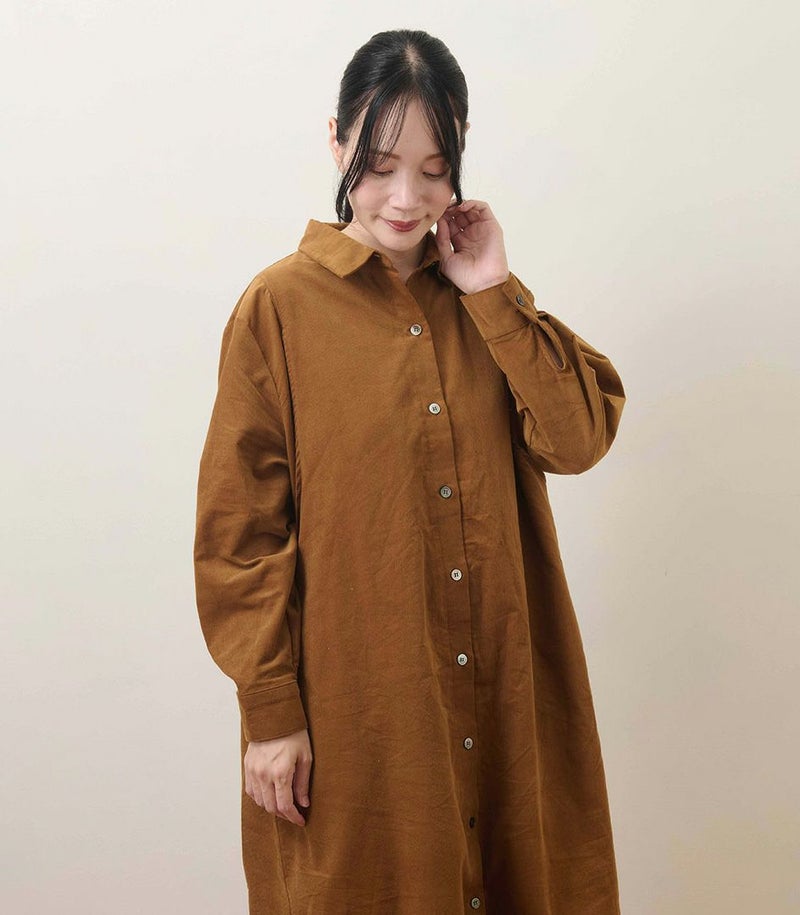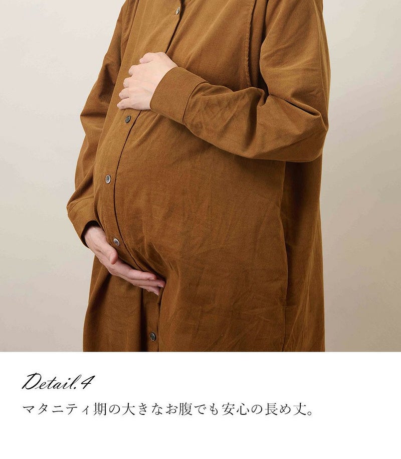 秋冬の定番素材、コーデュロイを贅沢に使用したロング丈のシャツワンピース。細めのタテ畝とほどよい光沢感で上品な印象に。広がりすぎないAラインシルエットが体型を拾わずにすっきり見せてくれるのも嬉しいポイントです。前ボタンは全て外せる仕様です。 ●ポケット×2 〈マタニティ(腹囲100cm)対応授乳服〉 まるいお腹を優しく包み込み、妊婦さんがきれいに見えるシルエットにこだわりました。 大きくなったお腹を締めつけず、ゆったりと楽に着ていただけます。 産後の授乳のしやすさも追求した授乳服なので、1枚で2役の便利な授乳服です。 〈生産国:日本〉 〈素材:綿100%〉 細めのタテ畝が特徴で、ソフトでしなやかな風合いと繊細な光沢感のある素材です。畝の凹凸に空気が含まれるため、保温性と吸湿性に優れています。 やや薄手ながらふくらみのある柔らかな肌触りが特徴です。 〈洗濯表記:洗濯機OK/ネット使用〉