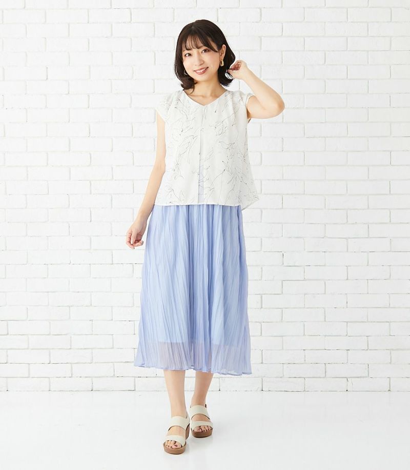 軽くて速乾性のあるポリエステル素材。スカート部分はランダムなシワ感のある生地を使用。光沢感と透け感が特徴です。