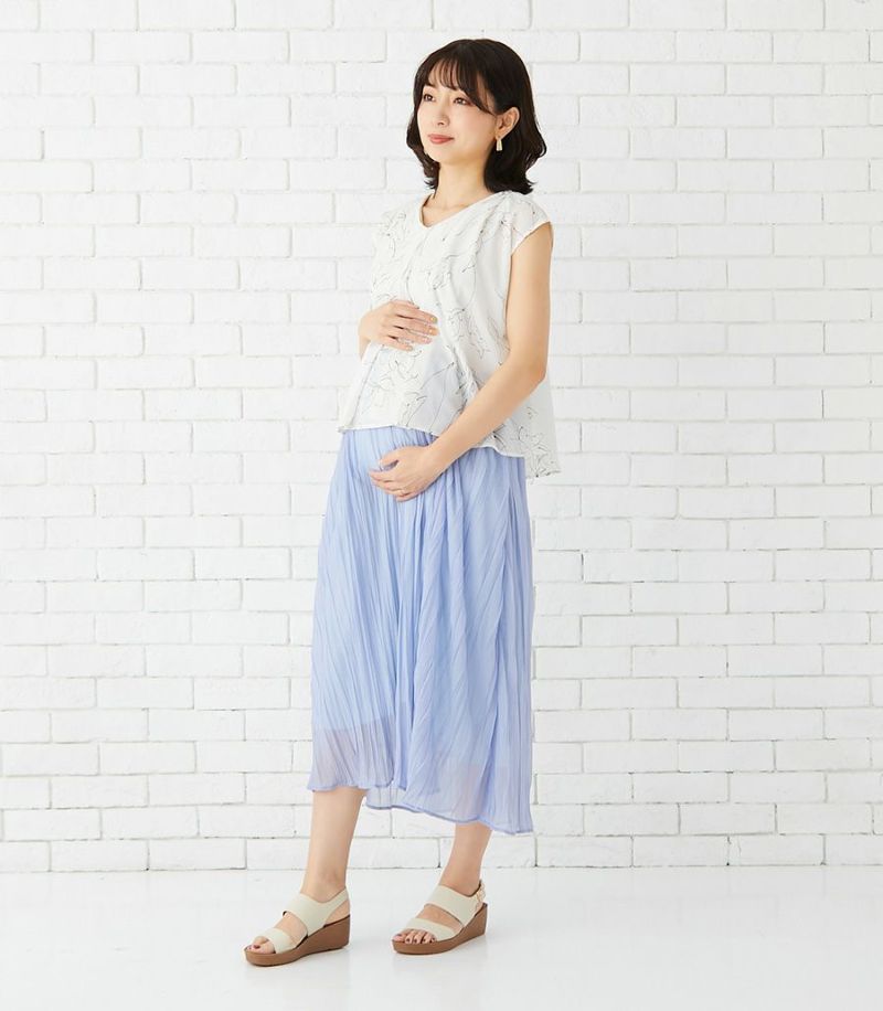 インナー付きスカートと、センターオープンタイプのコンパクトトップスのセットアップワンピース。ラインフラワープリントのトップスとスカート部分の透け感が大人っぽくきれいめな印象に。華やかで春夏のお出かけに活躍する1着です。 ●ポケット× 〈マタニティ(腹囲100cm)対応授乳服〉 まるいお腹を優しく包み込み、妊婦さんがきれいに見えるシルエットにこだわりました。 大きくなったお腹を締めつけず、ゆったりと楽に着ていただけます。 産後の授乳のしやすさも追求した授乳服なので、1枚で2役の便利な授乳服です。 〈生産国:日本〉 〈素材:ポリエステル100% (別布:綿100%/裏地:ポリエステル100%)〉 軽くて速乾性のあるポリエステル素材。スカート部分はランダムなシワ感のある生地を使用。光沢感と透け感が特徴です。 〈洗濯表記:洗濯機OK ※ひっかけにご注意ください〉
