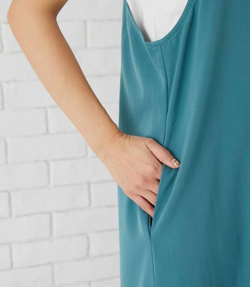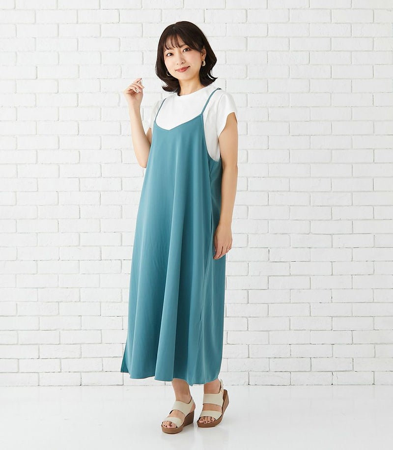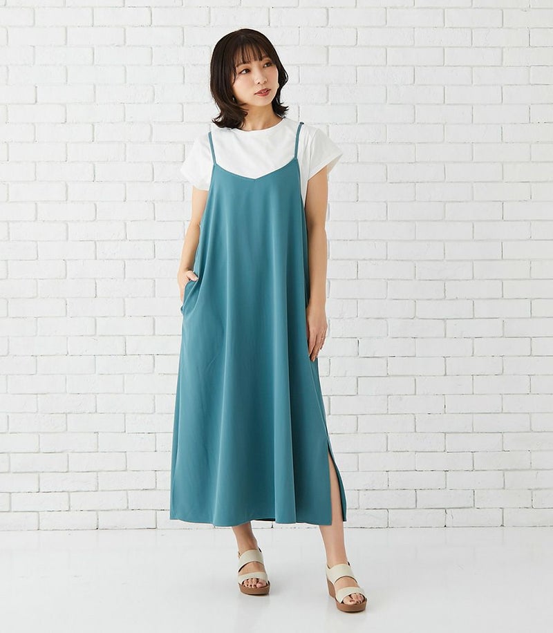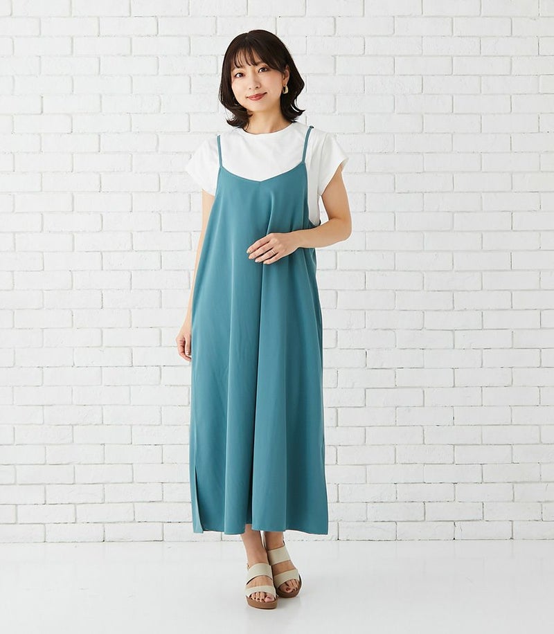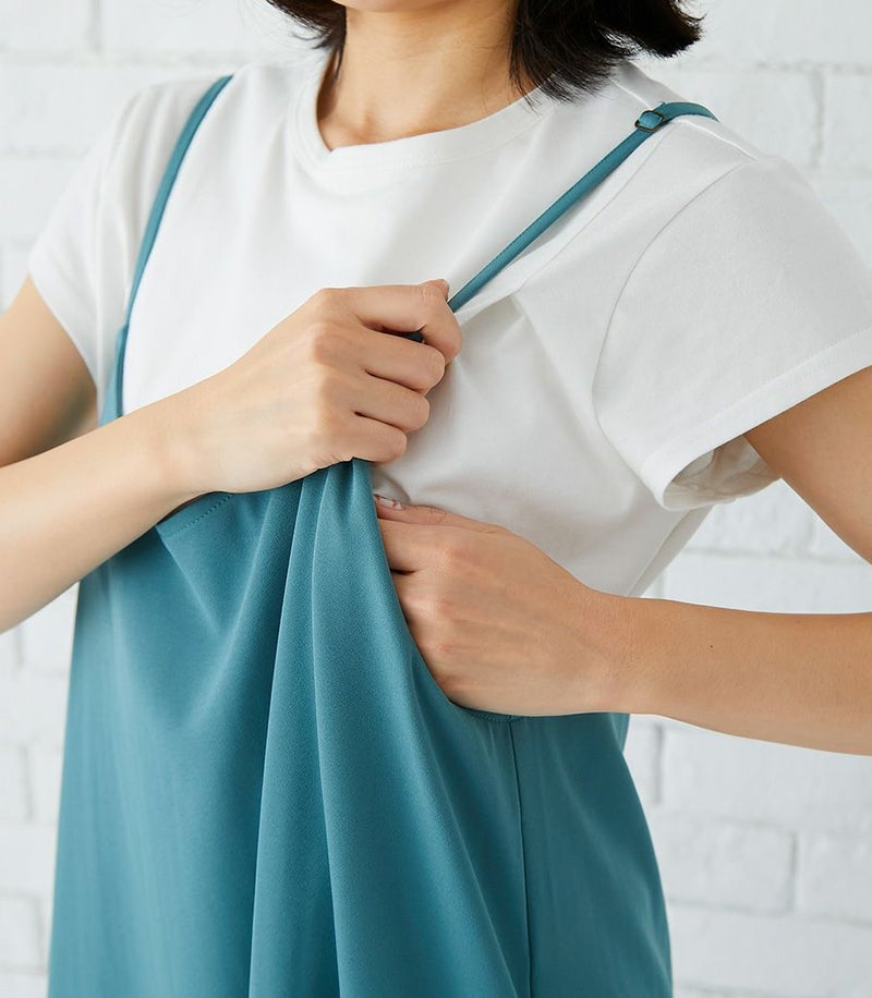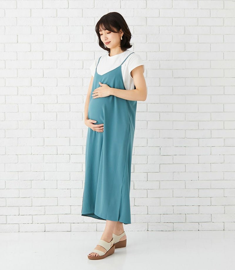 ラインがきれいでしっかりとしたコットン100%のTシャツ+マットでドライタッチな風合いのキャミワンピースのセットは、着心地のよさと、授乳のしやすい工夫がたくさん。シンプルなのでお手持ちのアイテムにも合わせやすく、季節を問わず活躍する便利なセットワンピース。 COLOR:ブルーグリーン/MODEL:164cm