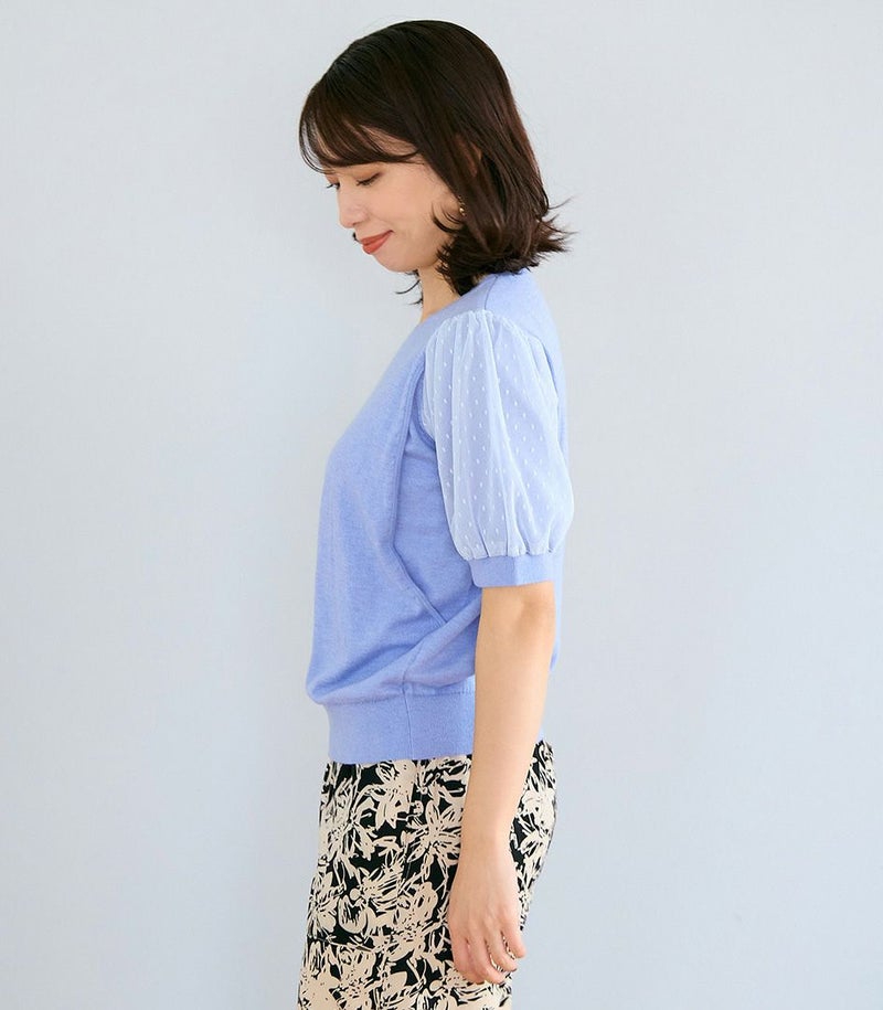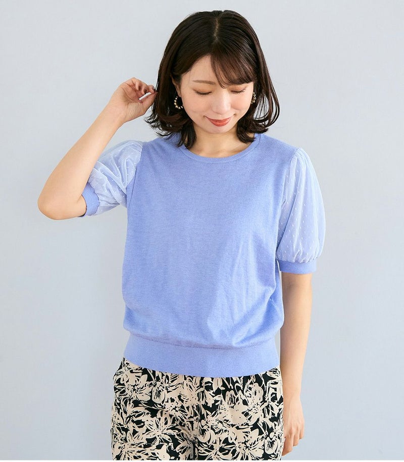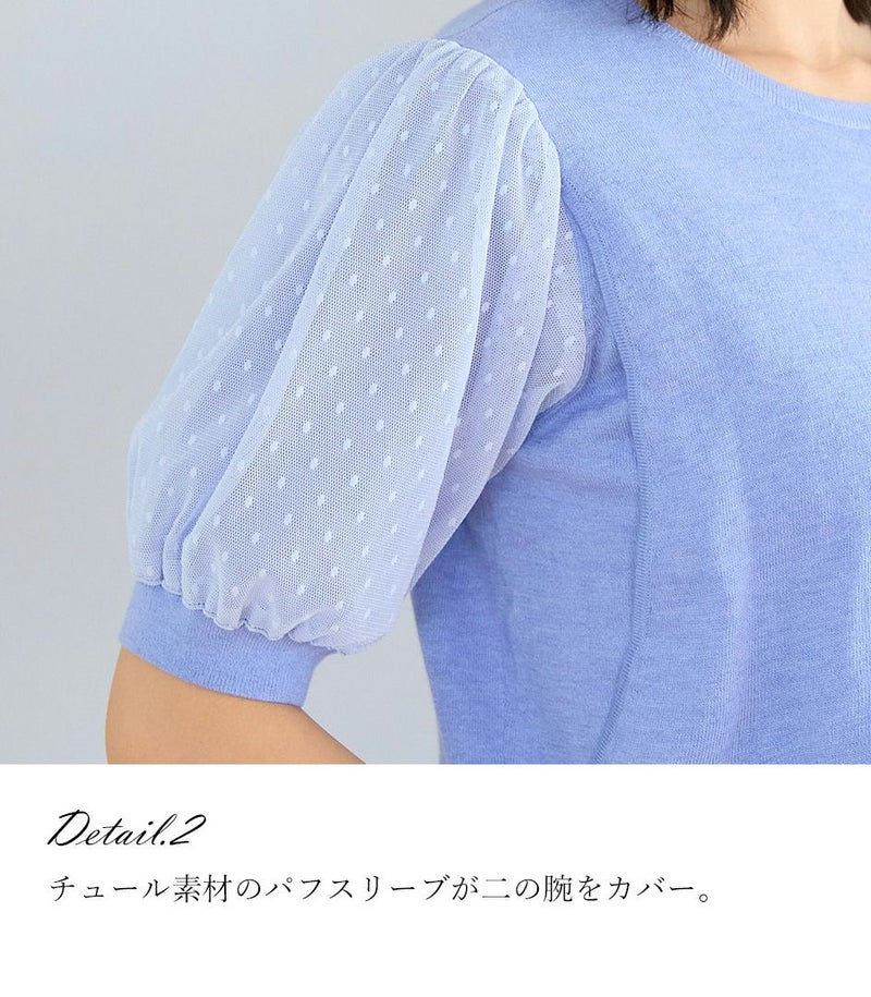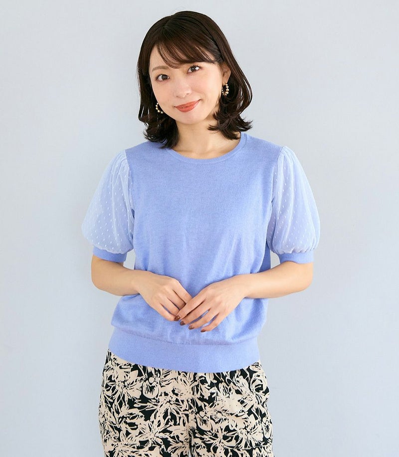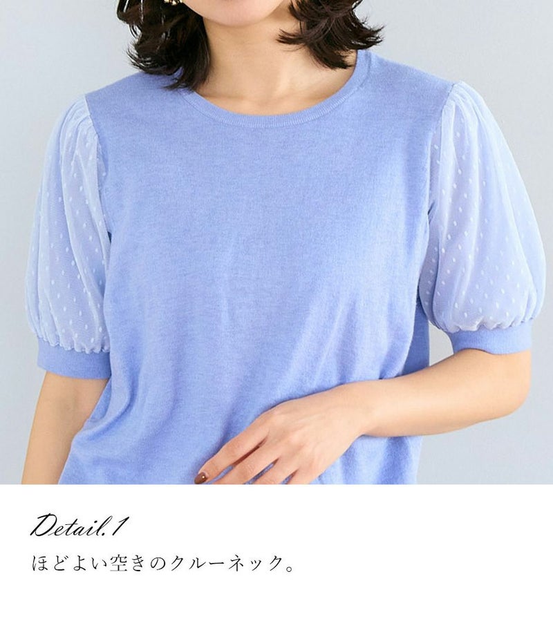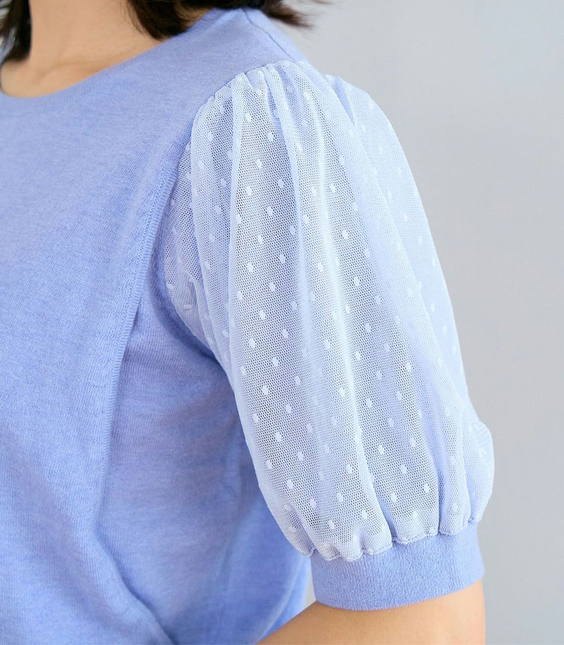 ドット柄チュール素材とニットコンビのトップス。程よいゆとりで身体のラインを拾わないシルエットです。ボリュームのある袖が気になる二の腕をカバーしてくれるのも嬉しいポイント◎ COLOR:ライトブルー/MODEL:164cm