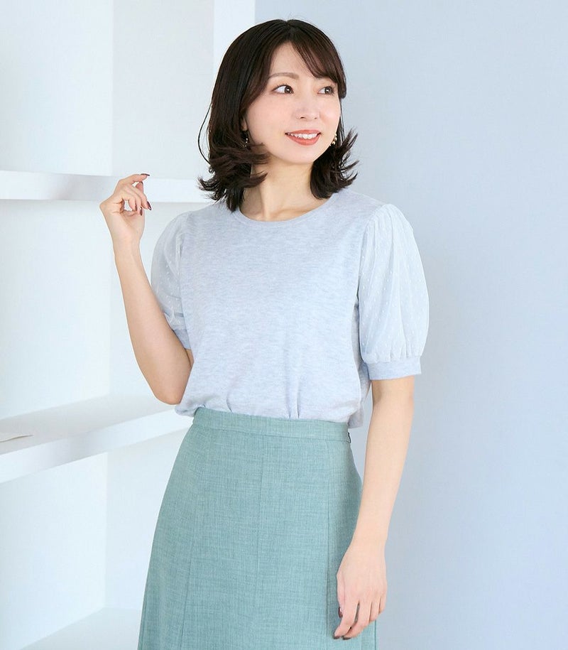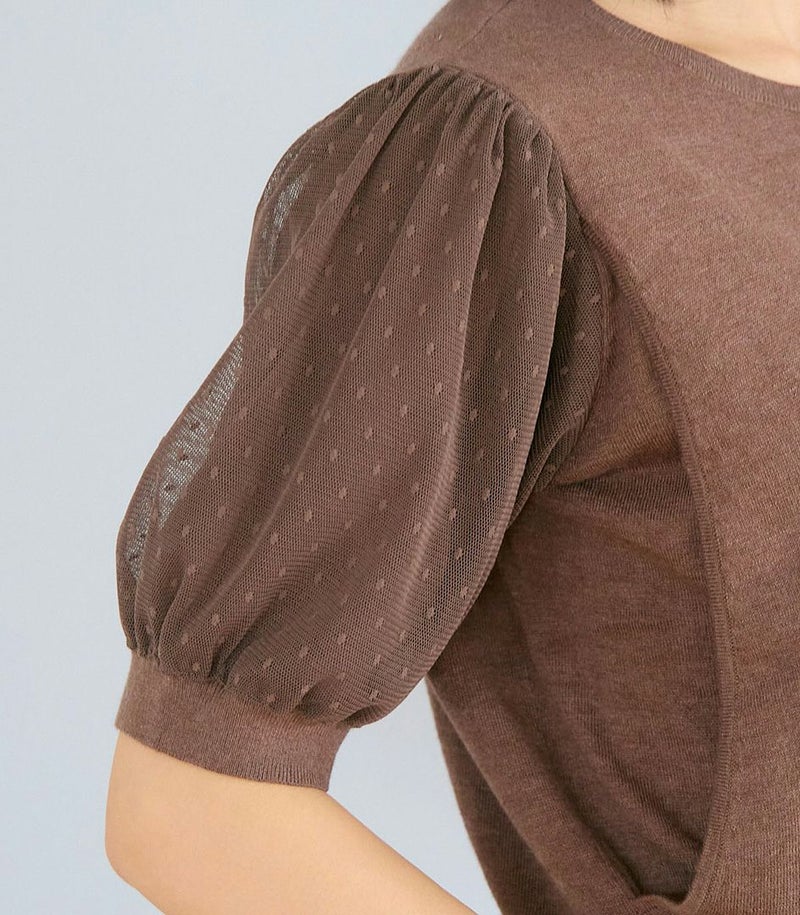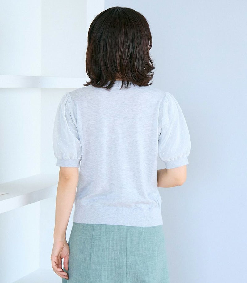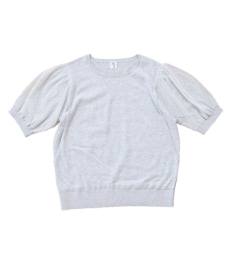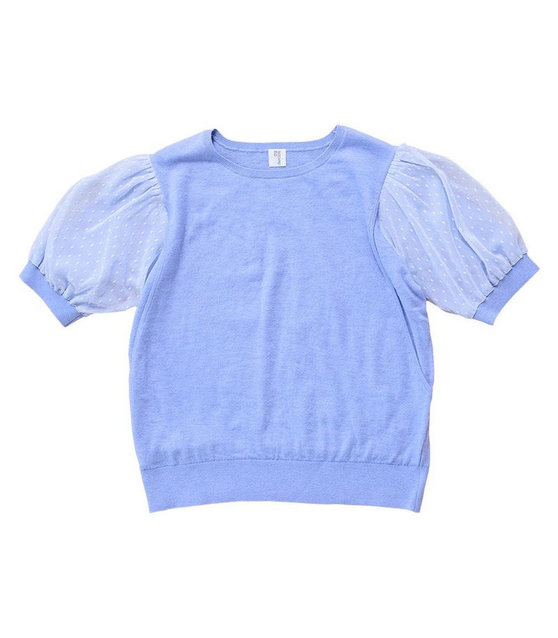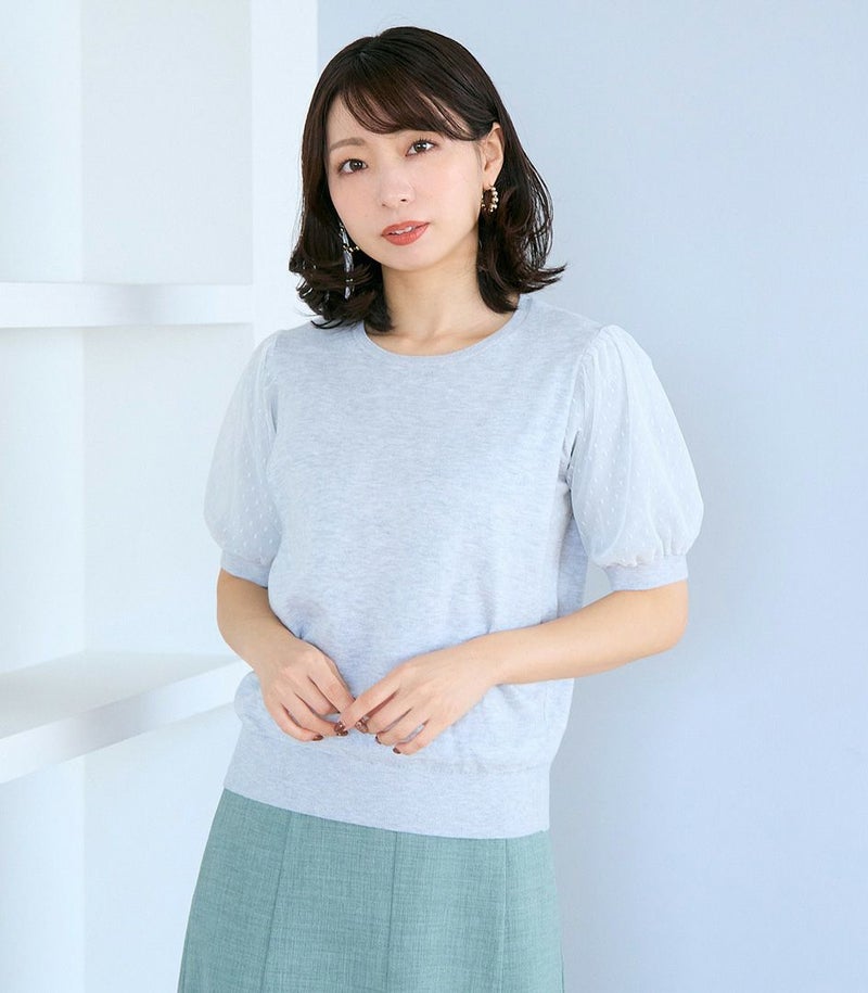 ドット柄チュール素材とニットコンビのトップス。程よいゆとりで身体のラインを拾わないシルエットです。ボリュームのある袖が気になる二の腕をカバーしてくれるのも嬉しいポイント◎ COLOR:ライトブルー/MODEL:164cm