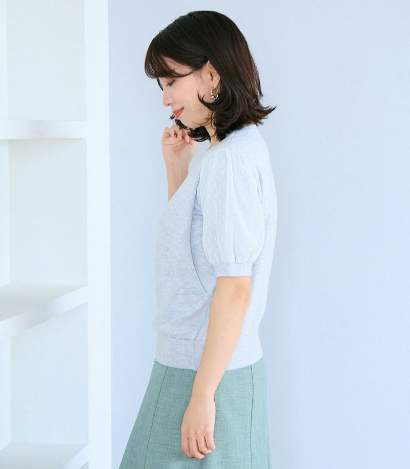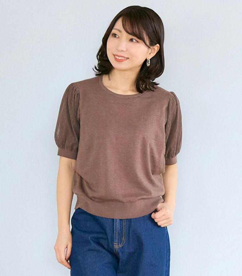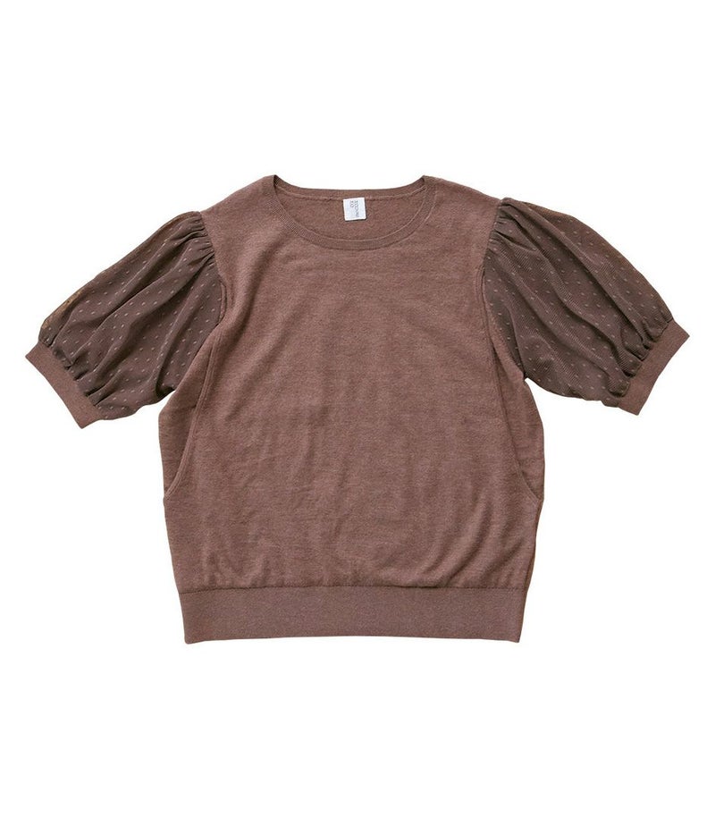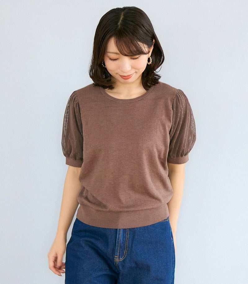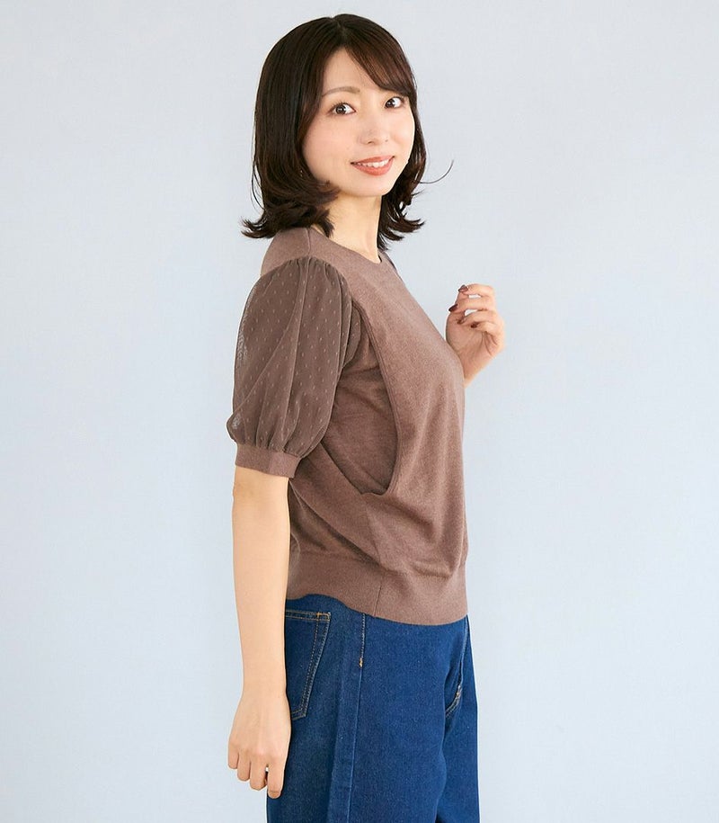ドット柄チュール素材とニットコンビのトップス。程よいゆとりで身体のラインを拾わないシルエットです。ボリュームのある袖が気になる二の腕をカバーしてくれるのも嬉しいポイント◎ ●ポケット× 〈生産国:中国〉 〈素材:綿55%、アクリル45% / 別布:ポリエステル100%〉 やわらかな肌触りでチクチクしにくい素材です。通気性が良く伸縮性もあるため、夏のお出かけにぴったりの1枚です。 〈洗濯表記:洗濯機OK/ネット使用〉