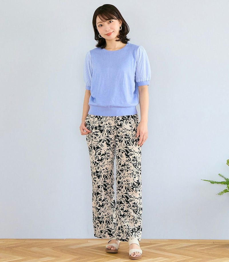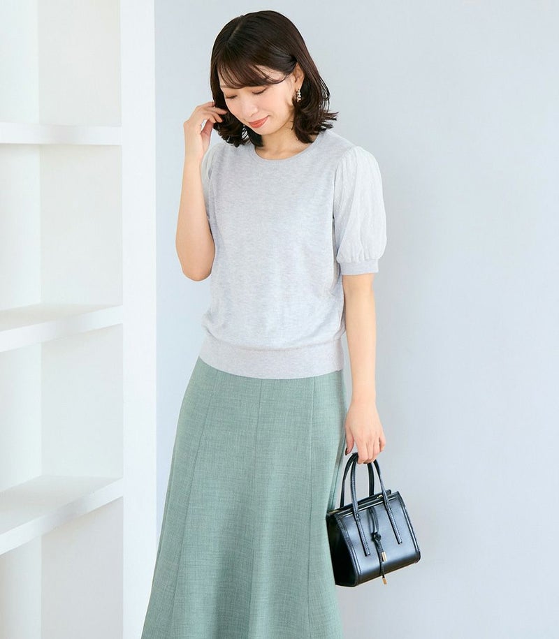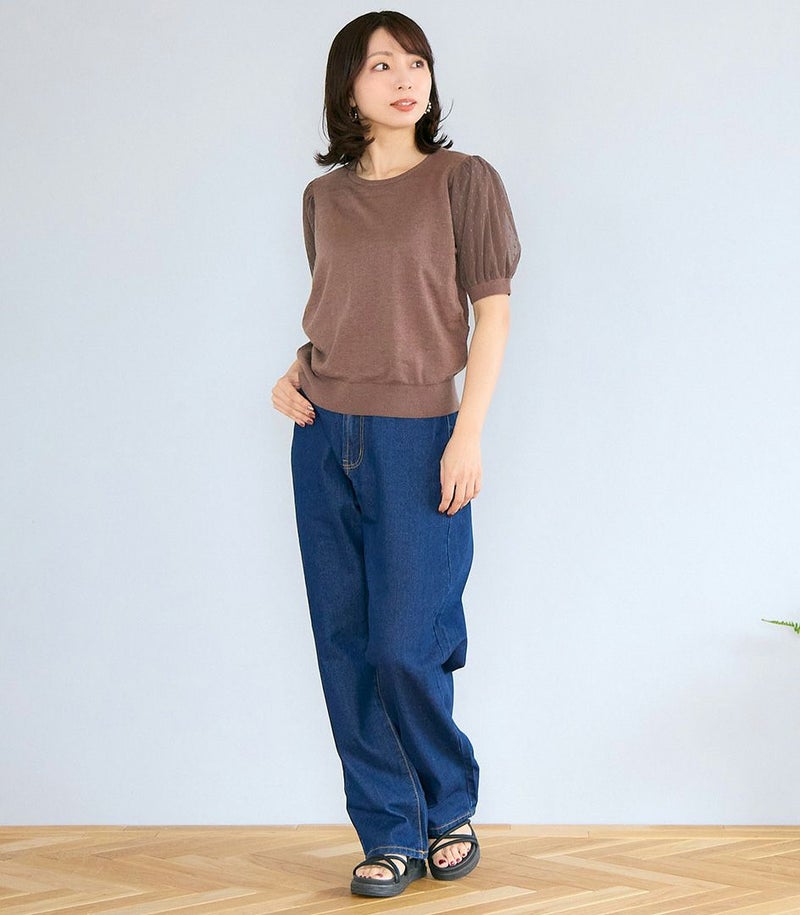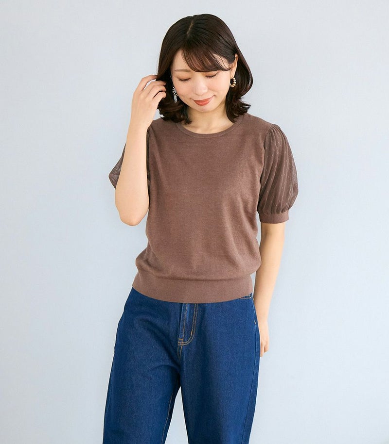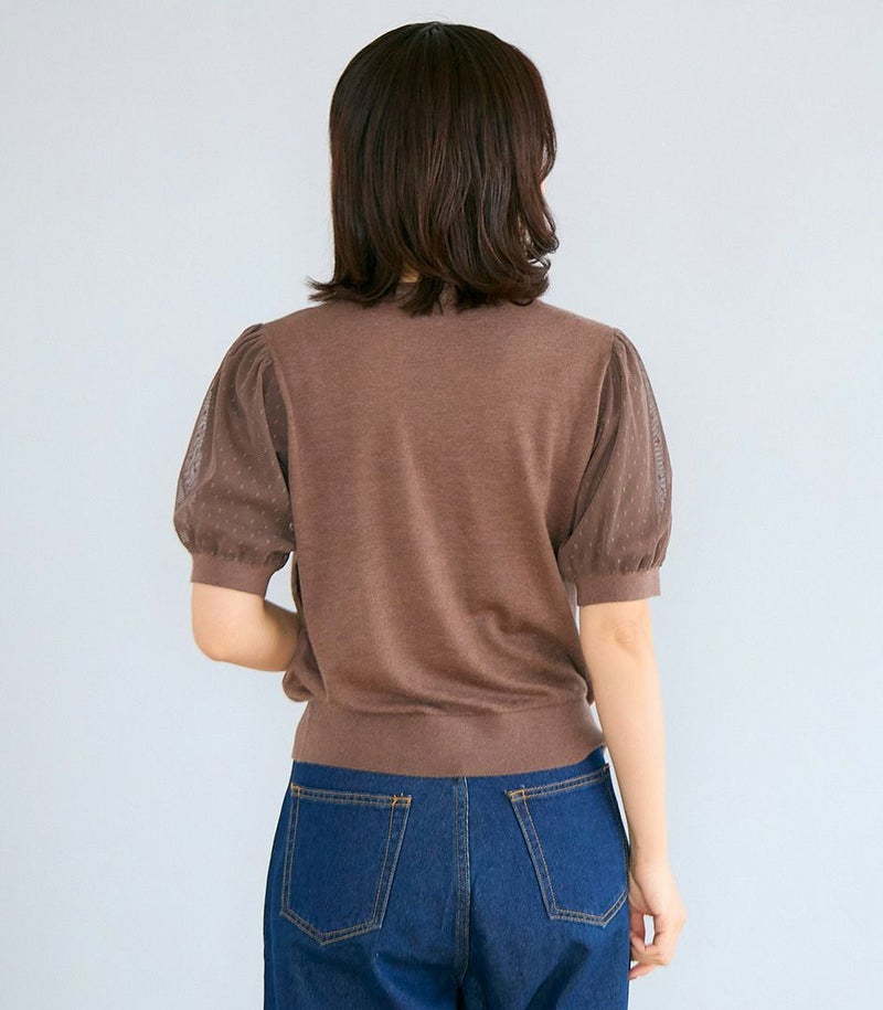 ドット柄チュール素材とニットコンビのトップス。程よいゆとりで身体のラインを拾わないシルエットです。ボリュームのある袖が気になる二の腕をカバーしてくれるのも嬉しいポイント◎ ●ポケット× 〈生産国:中国〉 〈素材:綿55%、アクリル45% / 別布:ポリエステル100%〉 やわらかな肌触りでチクチクしにくい素材です。通気性が良く伸縮性もあるため、夏のお出かけにぴったりの1枚です。 〈洗濯表記:洗濯機OK/ネット使用〉