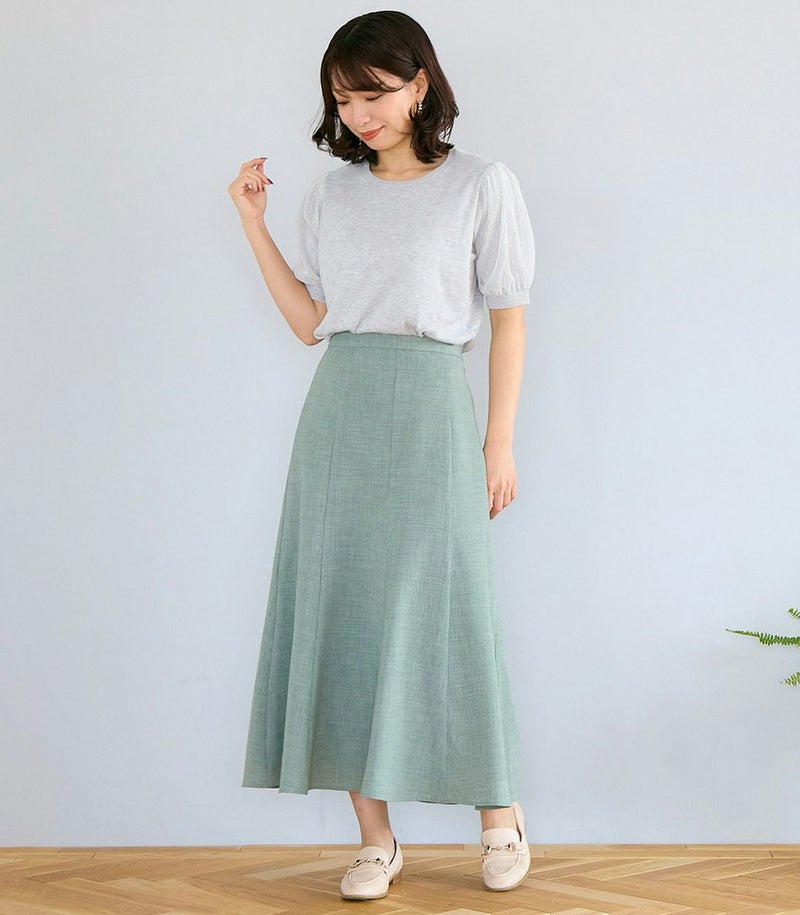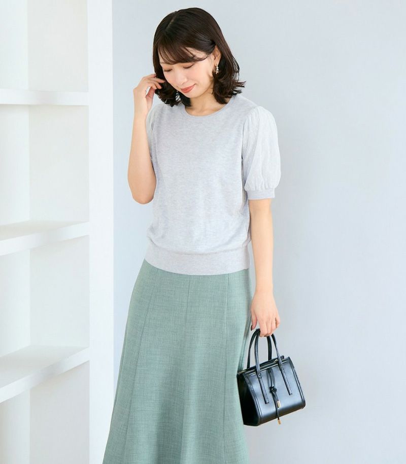 合わせるボトム次第で、カジュアルにもきれい目にも着られます。チュール部分と身頃部分を同色にすることで、落ち着いた印象に仕上げました。