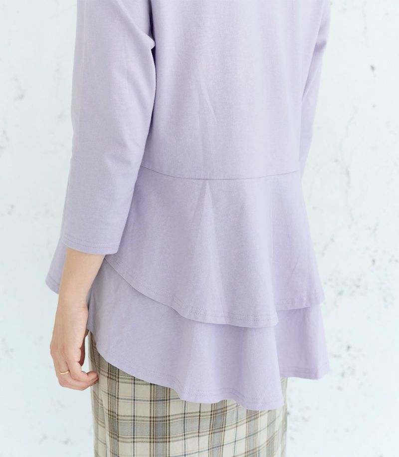 やわらかなコットン100%素材のカットソーはストレスフリーな着心地。ふわりときれいに広がるバックのフレアーが気になるお尻まわりをさりげなくカバーしてくれスッキリと上品な印象に。体型カバー&大人かわいいが両方叶う万能トップス。 COLOR:ラベンダー/MODEL:164cm