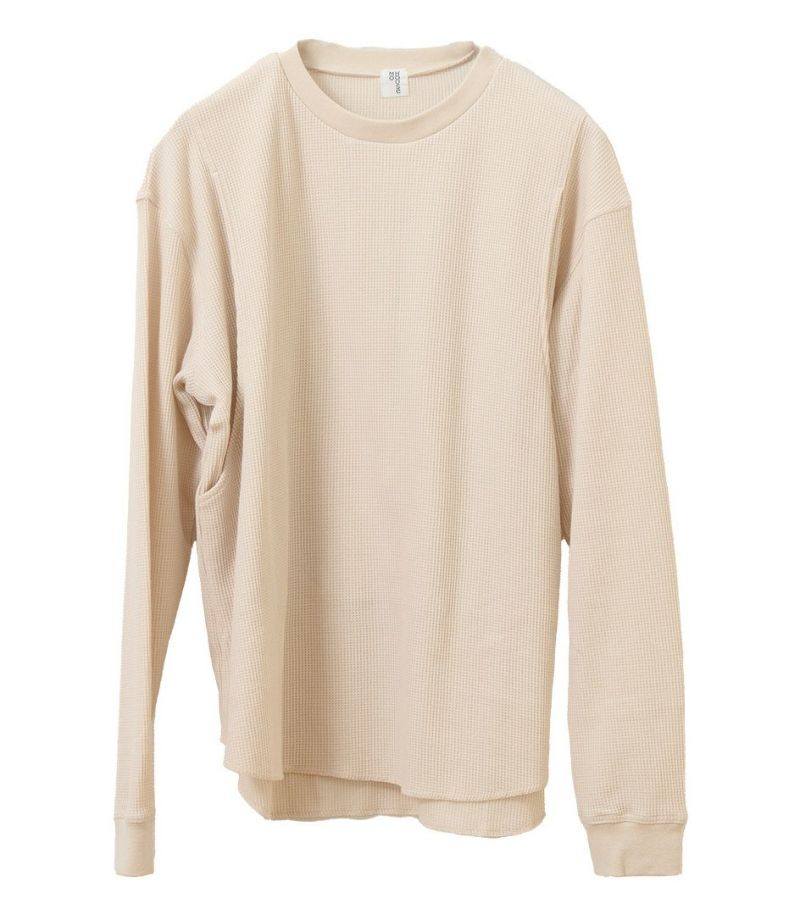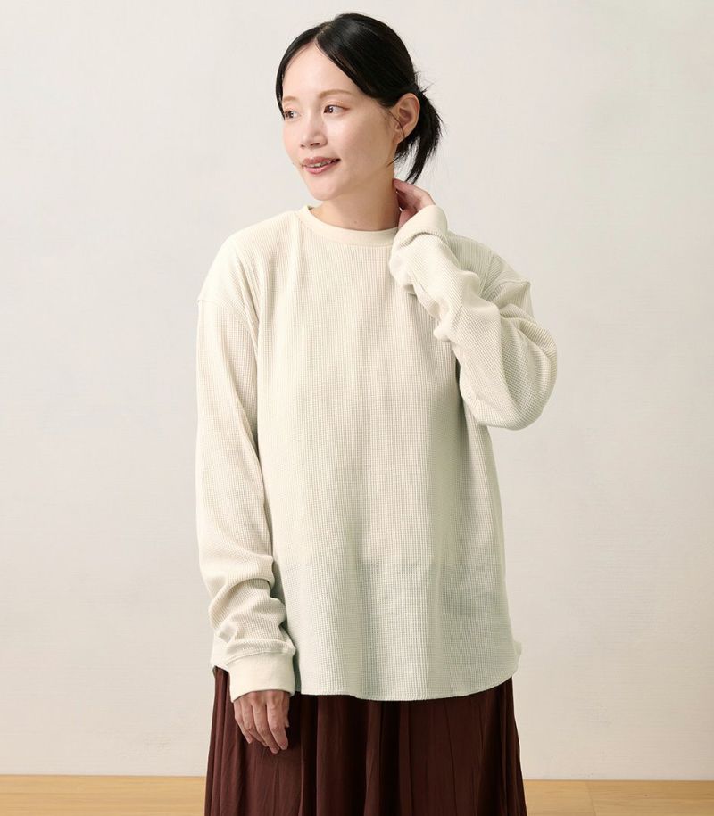 ゆるっとしたシルエットのワッフルロンT。体型カバーも◎ 凹凸のあるワッフル生地は、肌への接触面積を減らし通気性や吸水性を高めるため、さらっと快適に着られるトップスです。 COLOR:スモークベージュ/MODEL:158cm