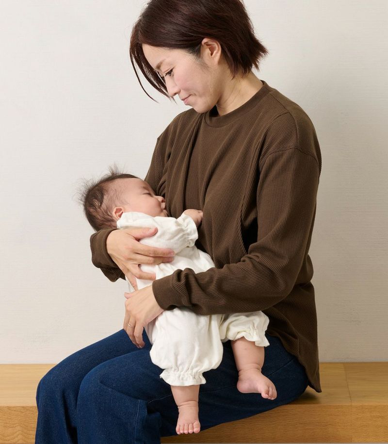 ゆるっとしたシルエットのワッフルロンT。体型カバーも◎ 凹凸のあるワッフル生地は、肌への接触面積を減らし通気性や吸水性を高めるため、さらっと快適に着られるトップスです。 ●ポケット× 〈マタニティ(腹囲100cm)対応授乳服〉 まるいお腹を優しく包み込み、妊婦さんがきれいに見えるシルエットにこだわりました。 大きくなったお腹を締めつけず、ゆったりと楽に着ていただけます。 産後の授乳のしやすさも追求した授乳服なので、1枚で2役の便利な授乳服です。 〈生産国:日本〉 〈素材:綿73%、ポリエステル27% 別布:綿95%、ポリウレタン5%〉 綿素材の肌触りの良さとポリエステルの耐久性や速乾性を兼ね備えた素材です。ポリエステル混紡により、シワになりにくく、イージーケアで着られるのも嬉しいポイント。やわらかな肌触りと伸縮性のある生地で、動きやすさも◎ 〈洗濯表記:洗濯機OK/ネット使用〉