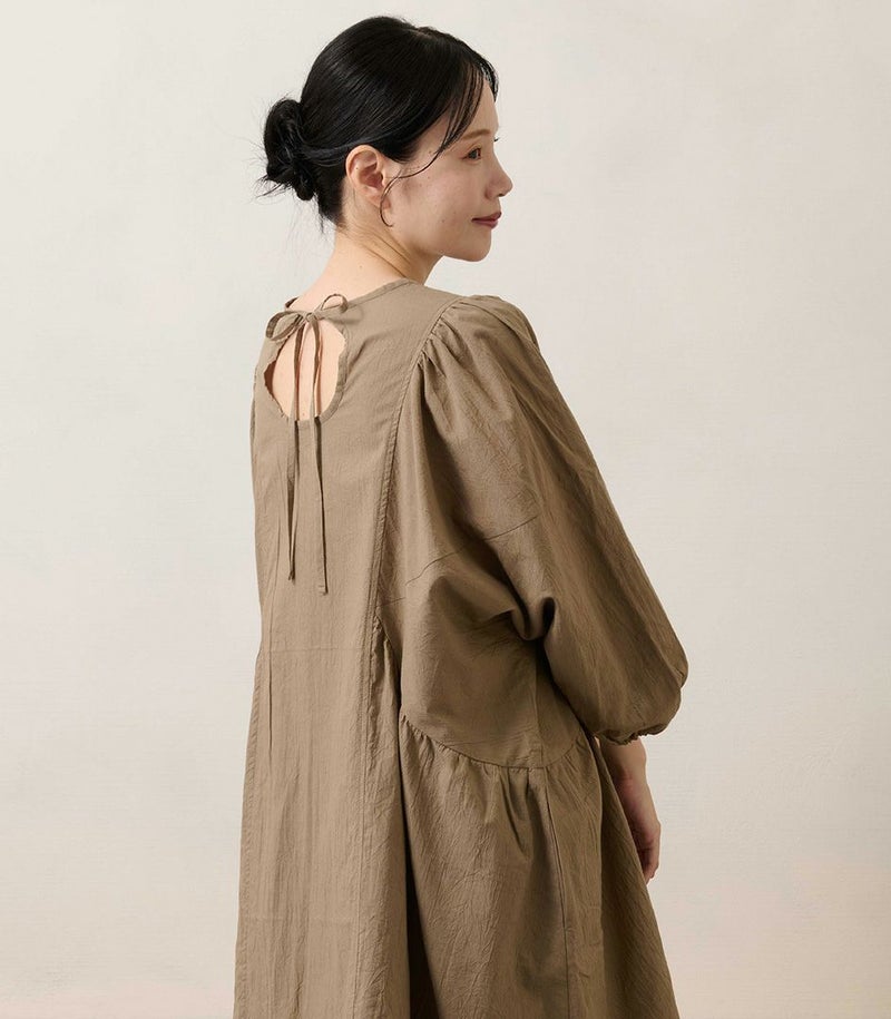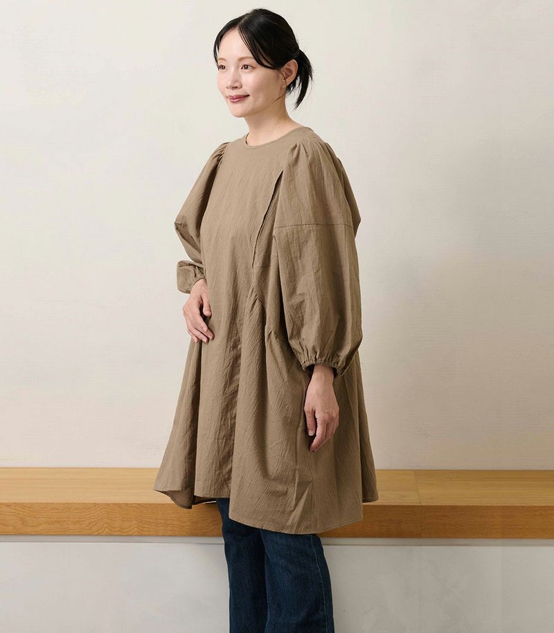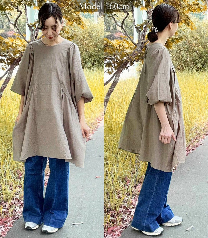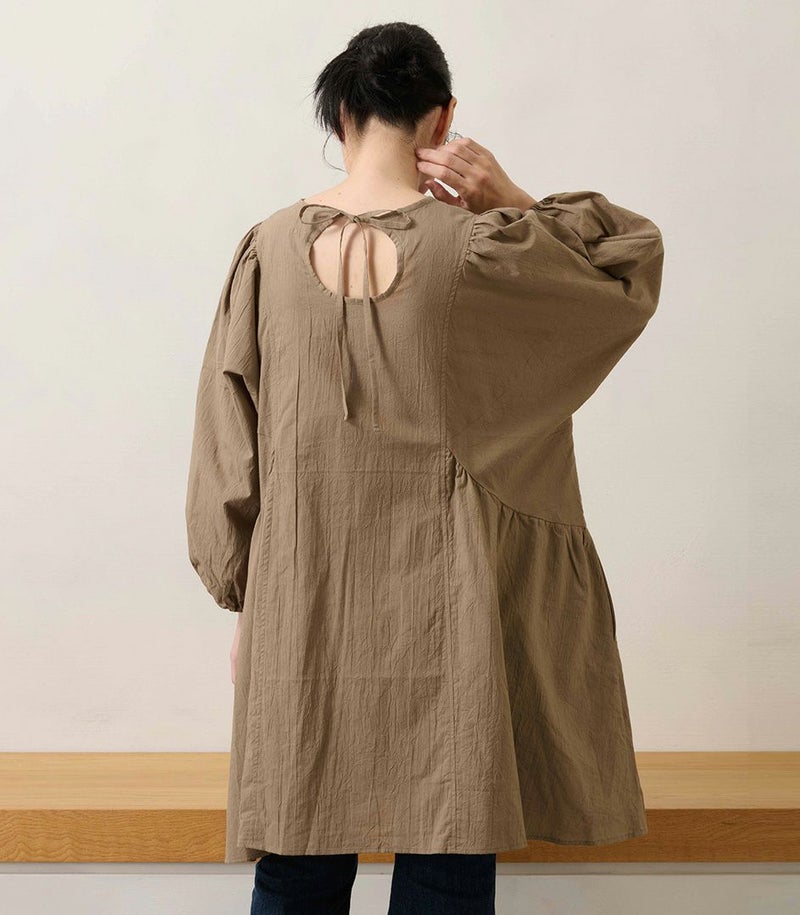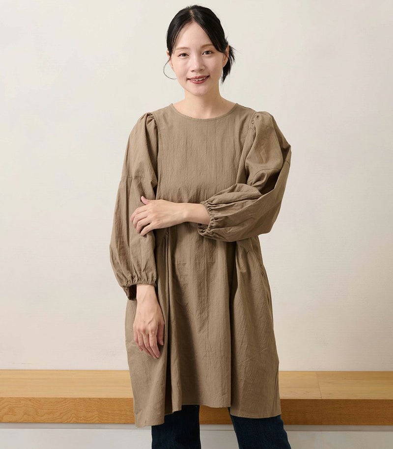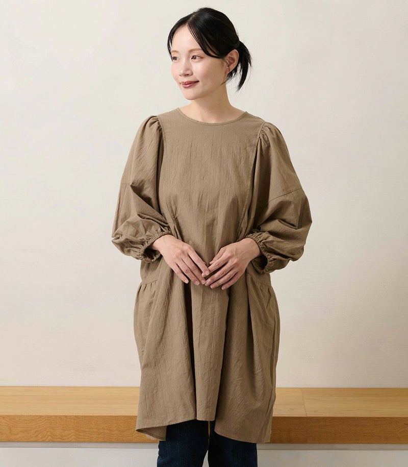 綿100%のコットンローン素材を使用した、ふんわりシルエットのチュニック。くしゅくしゅとした風合いが、ナチュラルでやさしい印象に。 体のラインを拾わないゆったりシルエットと長めの着丈は、体型カバーも◎ COLOR:ライトブラウン/MODEL:158cm