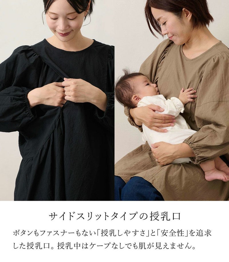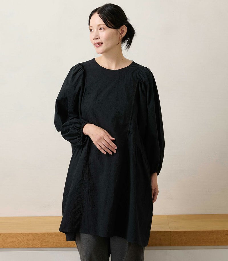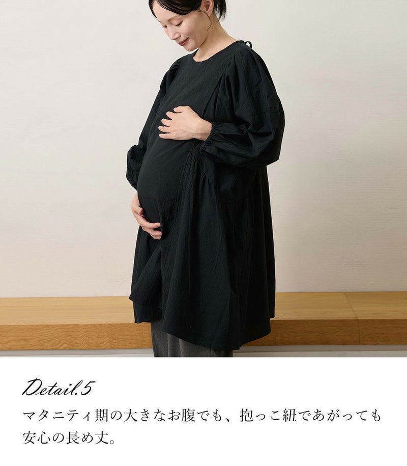 綿100%のコットンローン素材を使用した、ふんわりシルエットのチュニック。くしゅくしゅとした風合いが、ナチュラルでやさしい印象に。体のラインを拾わないゆったりシルエットと長めの着丈は、体型カバーも◎ ●ポケット×2 〈マタニティ(腹囲100cm)対応授乳服〉 まるいお腹を優しく包み込み、妊婦さんがきれいに見えるシルエットにこだわりました。 大きくなったお腹を締めつけず、ゆったりと楽に着ていただけます。 産後の授乳のしやすさも追求した授乳服なので、1枚で2役の便利な授乳服です。 〈生産国:日本〉 〈素材:綿100%〉 キャッチワッシャー加工を施し、まるで手で揉みこんだ様なくしゅくしゅとしたナチュラルなシワ感が特長のコットンローン生地です。 やや薄手ながらも、透け感をおさえたソフトな風合いです。 〈洗濯表記:洗濯機OK/ネット使用〉