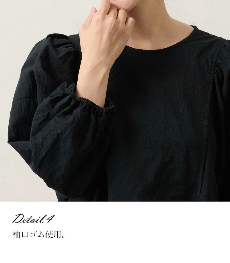 サイドのギャザー切替やボリュームのある袖が特徴。背中のリボンで後ろ姿にもさりげないアクセントをプラス。